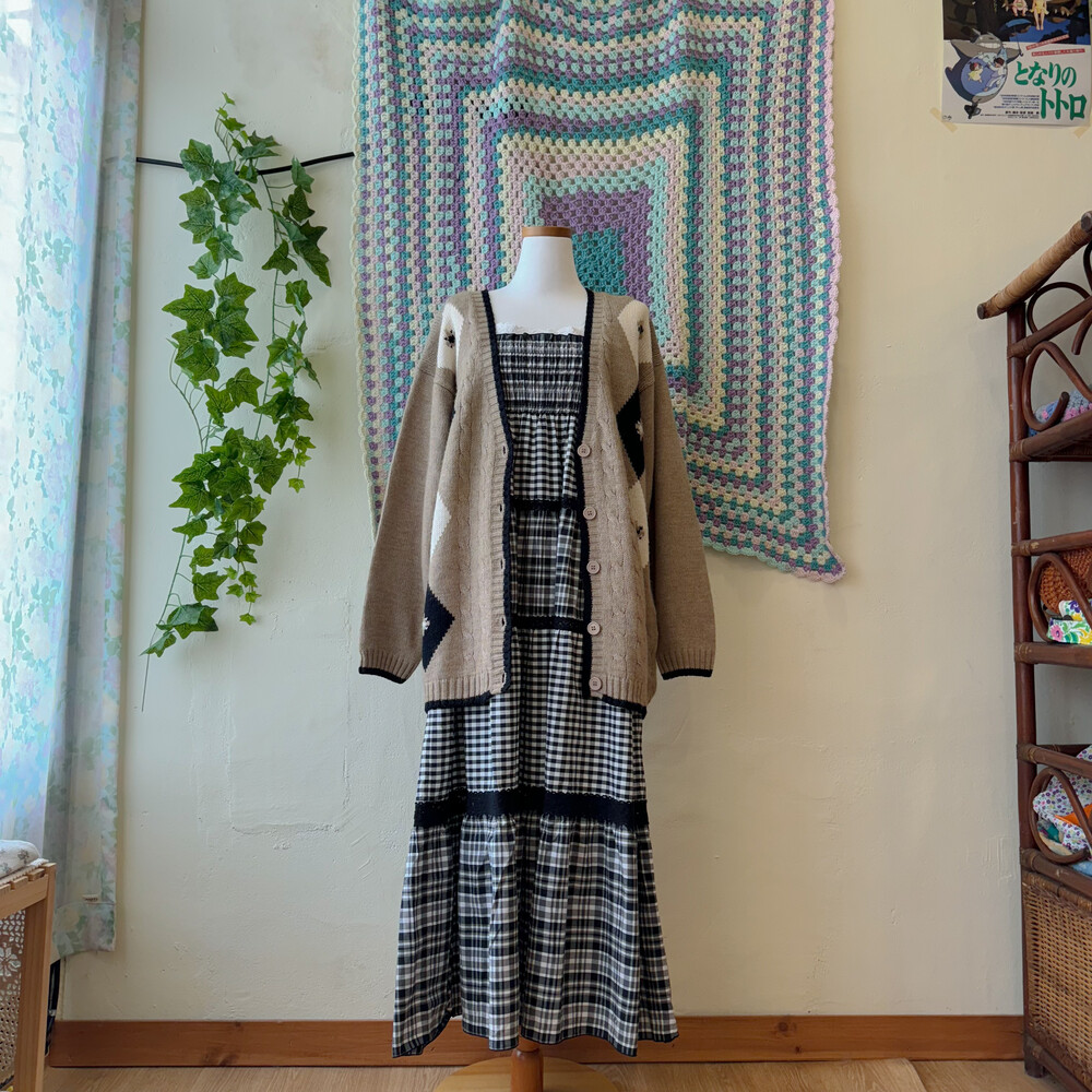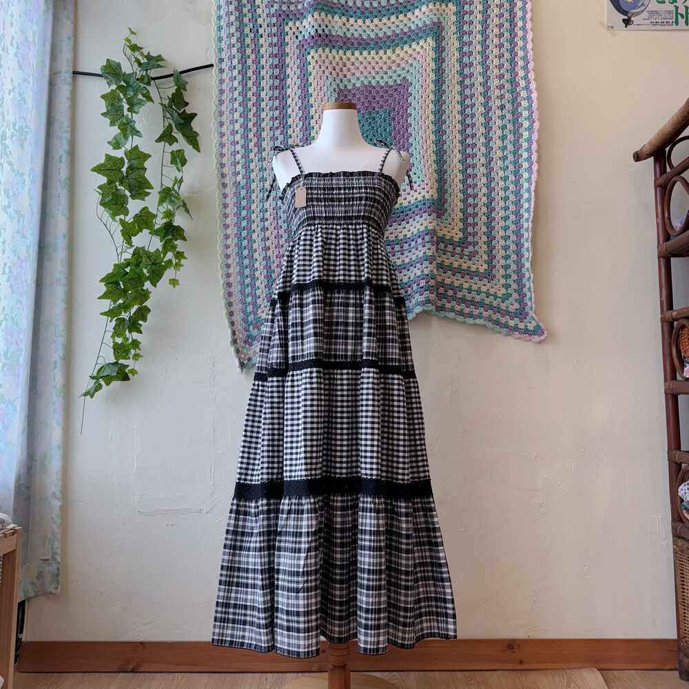 블랙 체크 패턴의 코튼 끈원피스예요