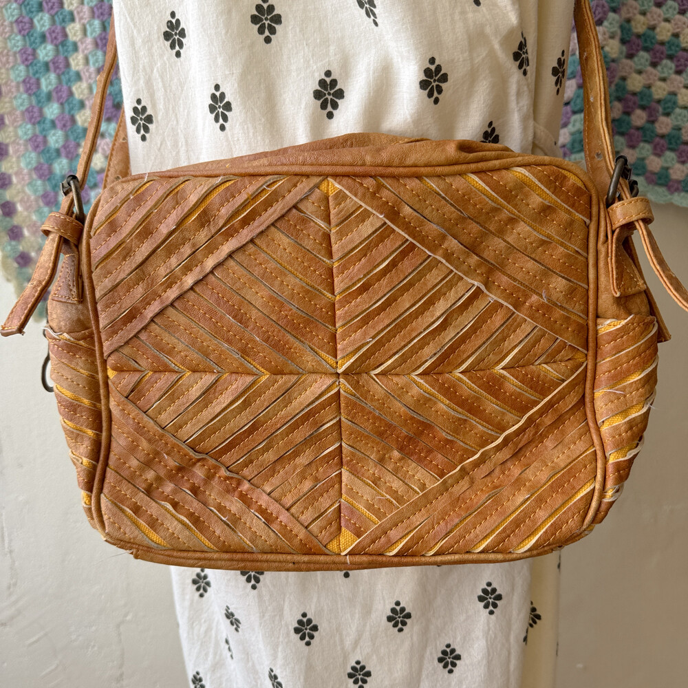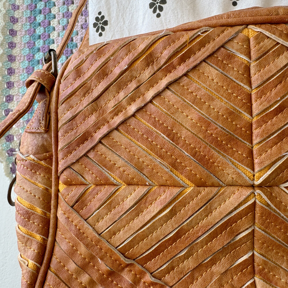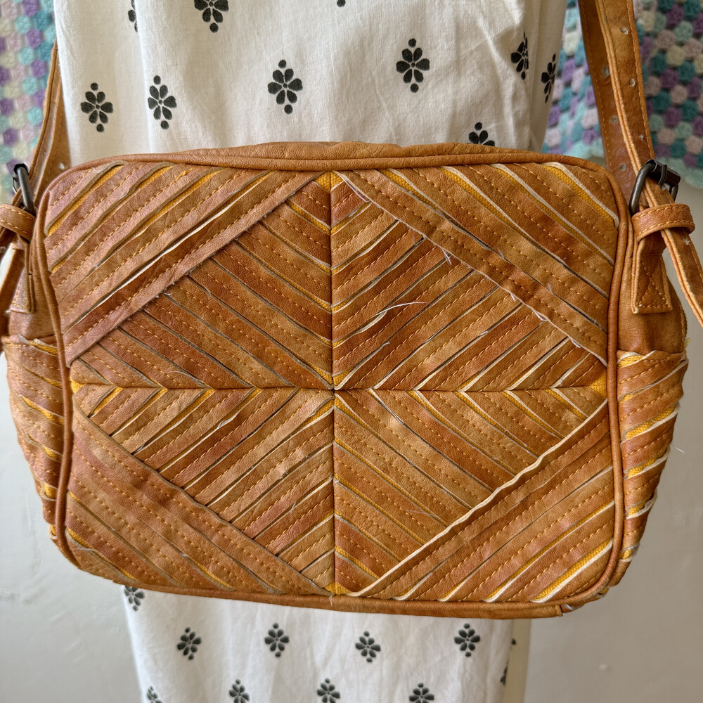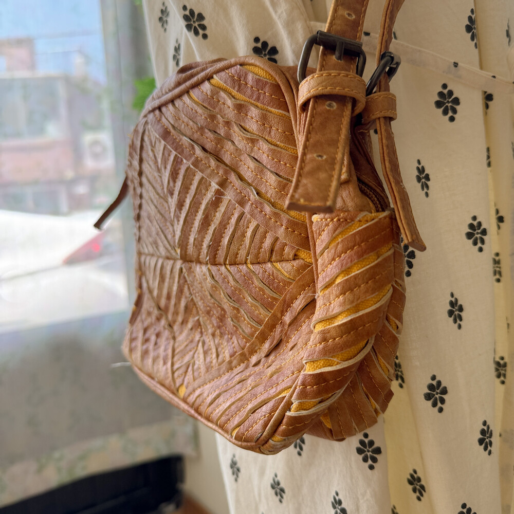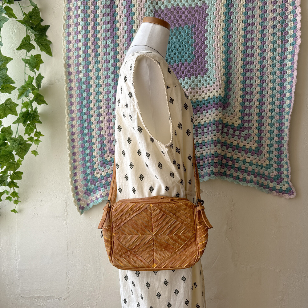밝은 카멜브라운 색감의 격자디자인 크로스백이에요