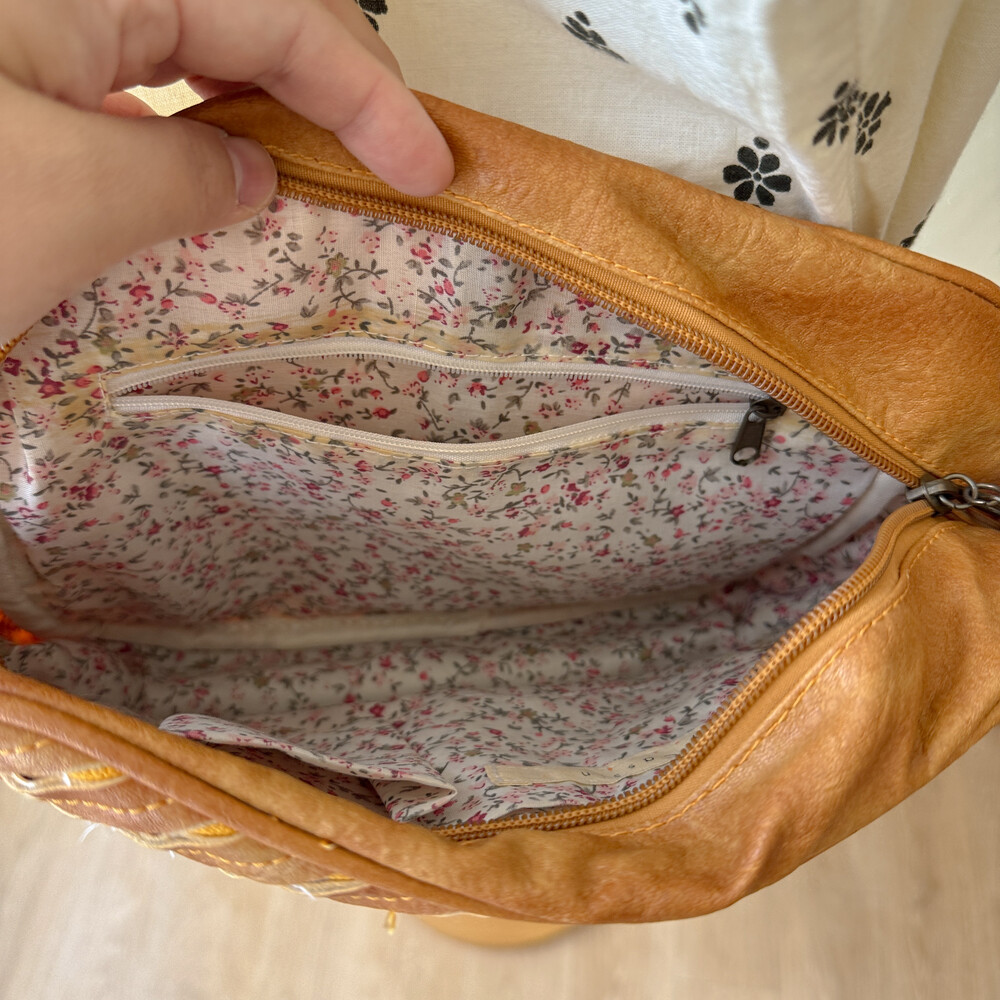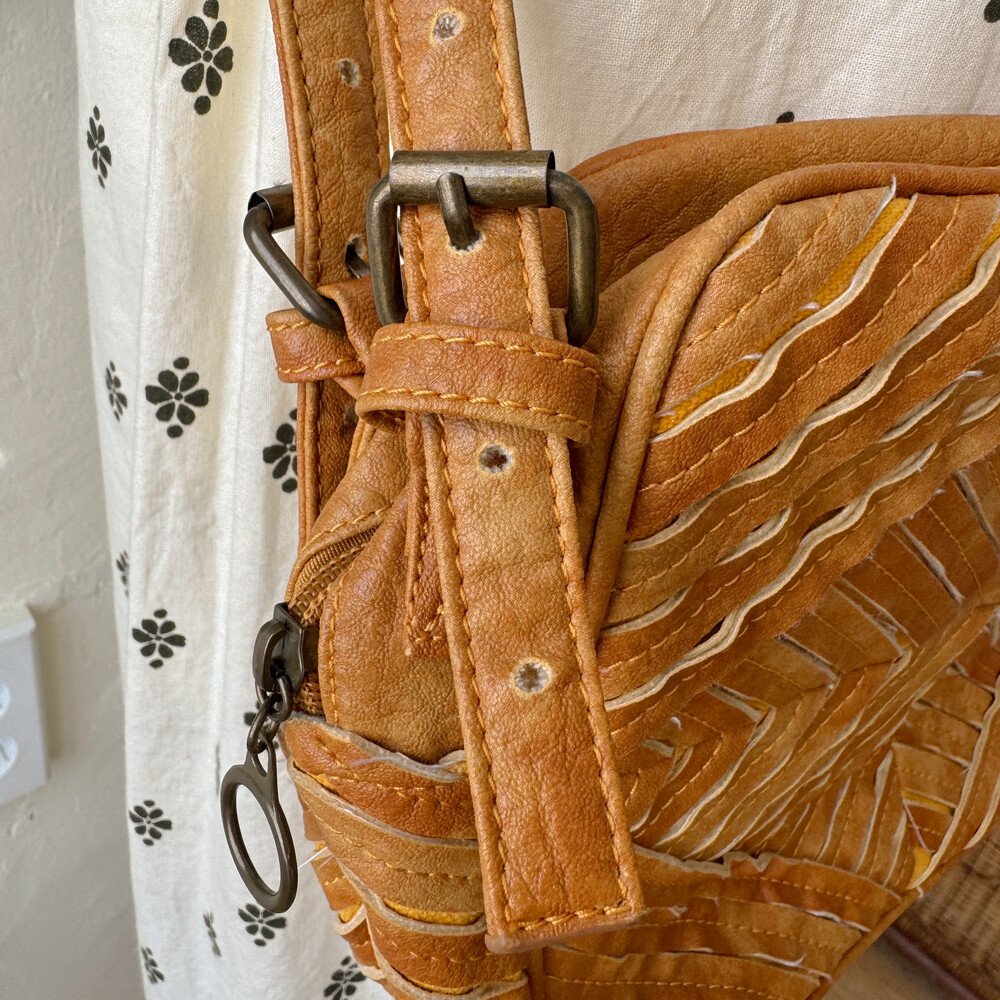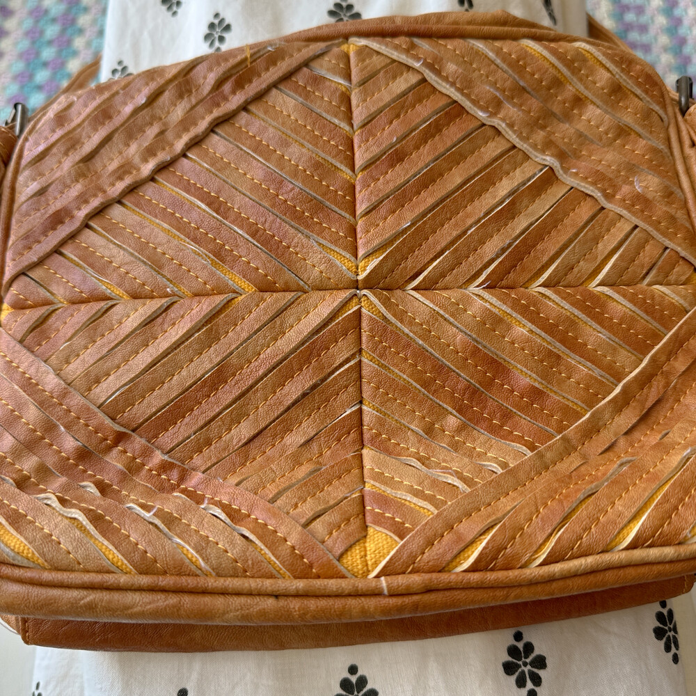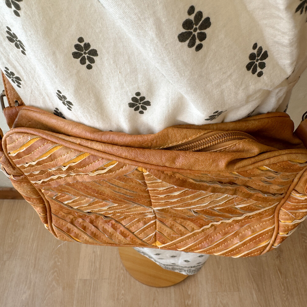 밝은 카멜브라운 색감의 격자디자인 크로스백이에요