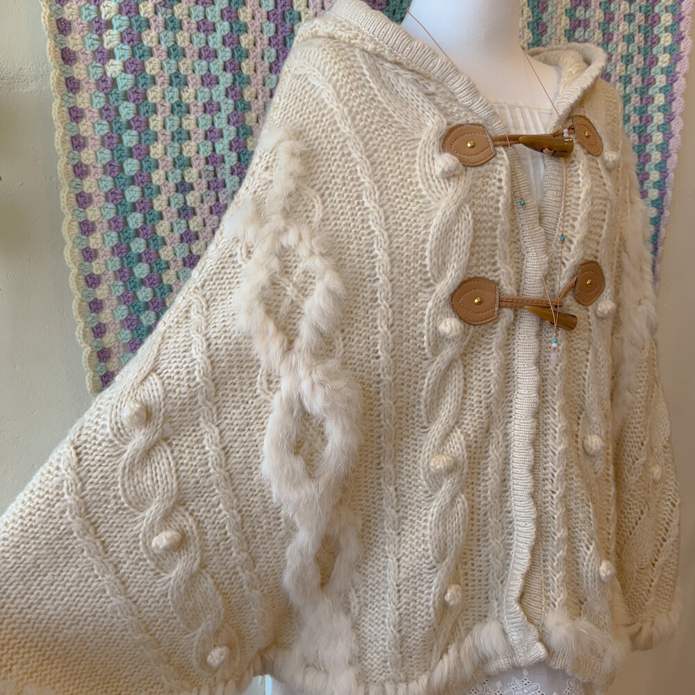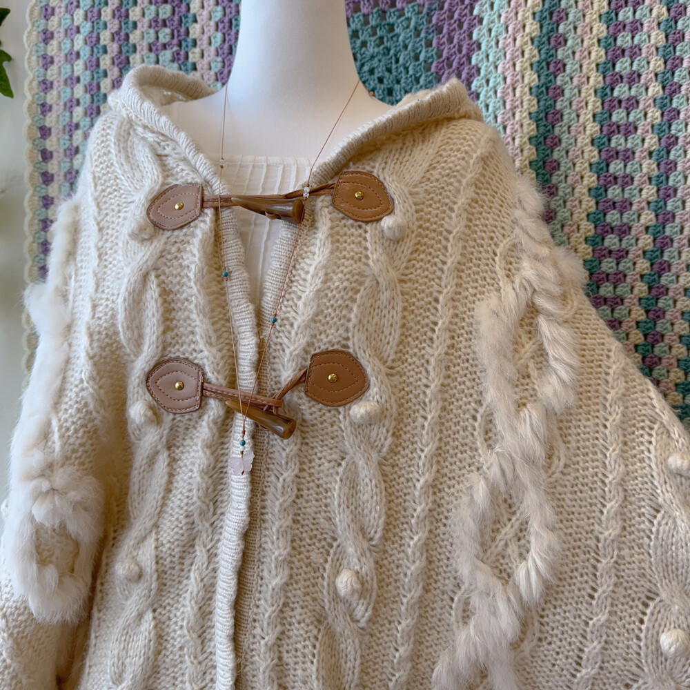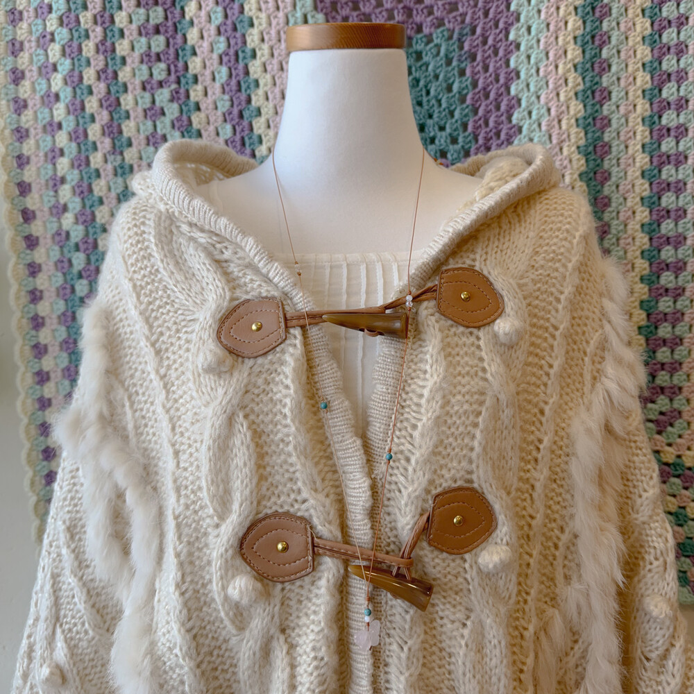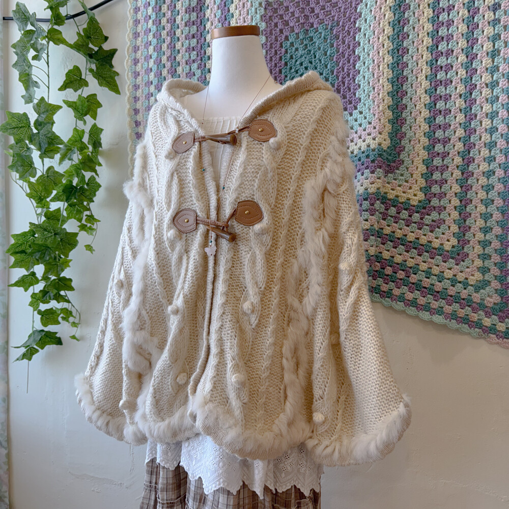 ivory hood cable&pompom poncho