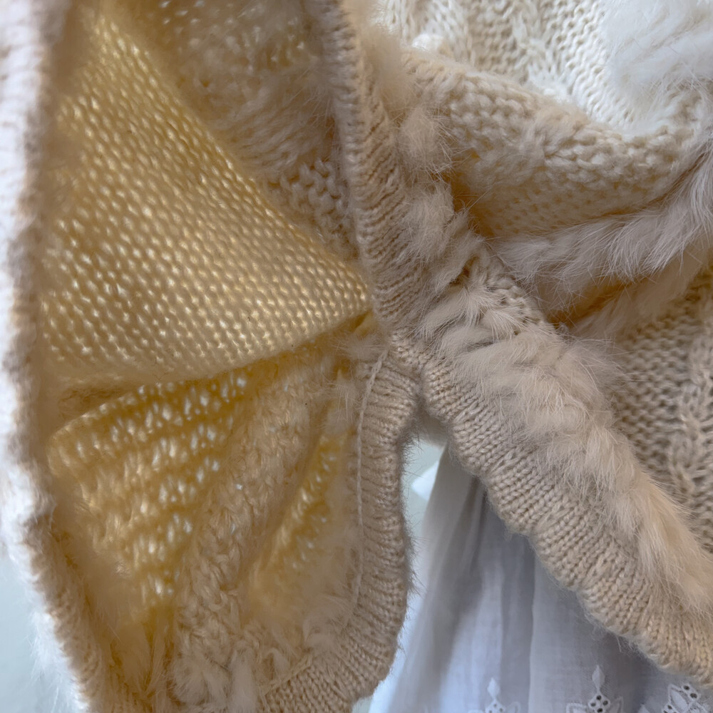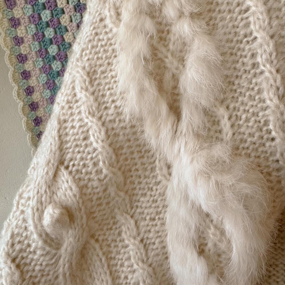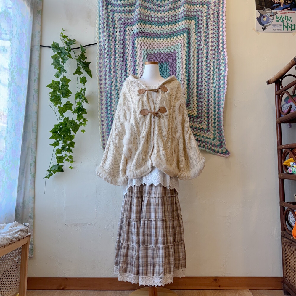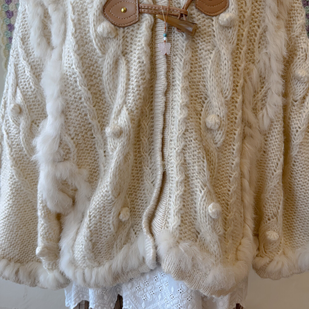 ivory hood cable&pompom poncho