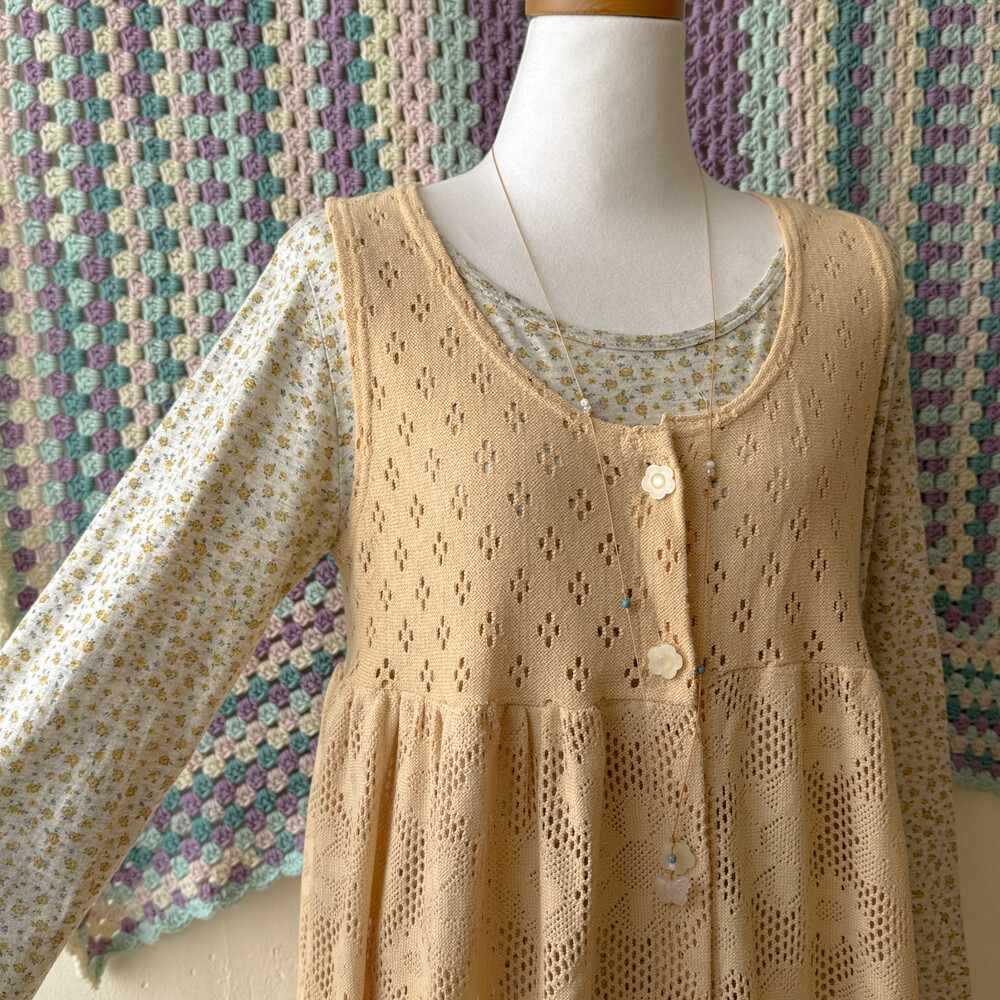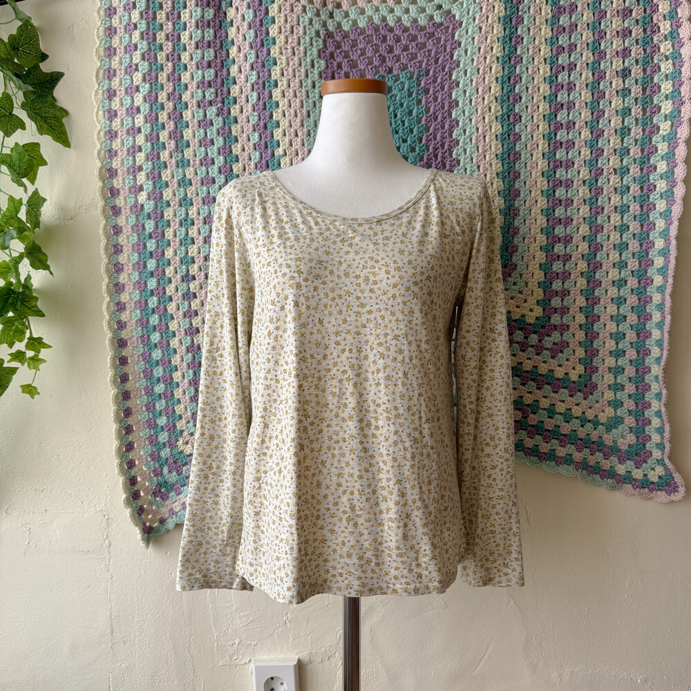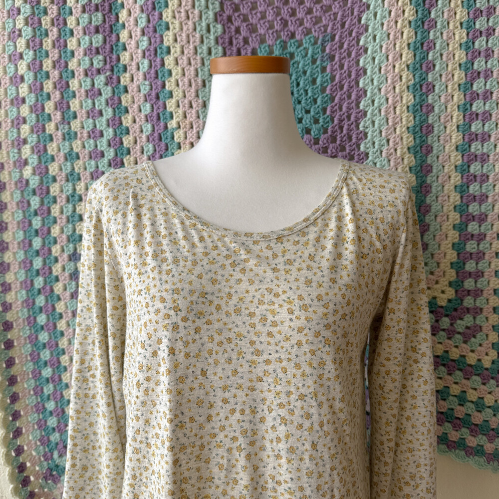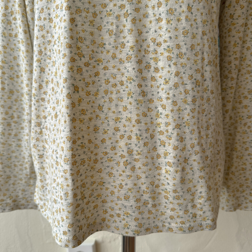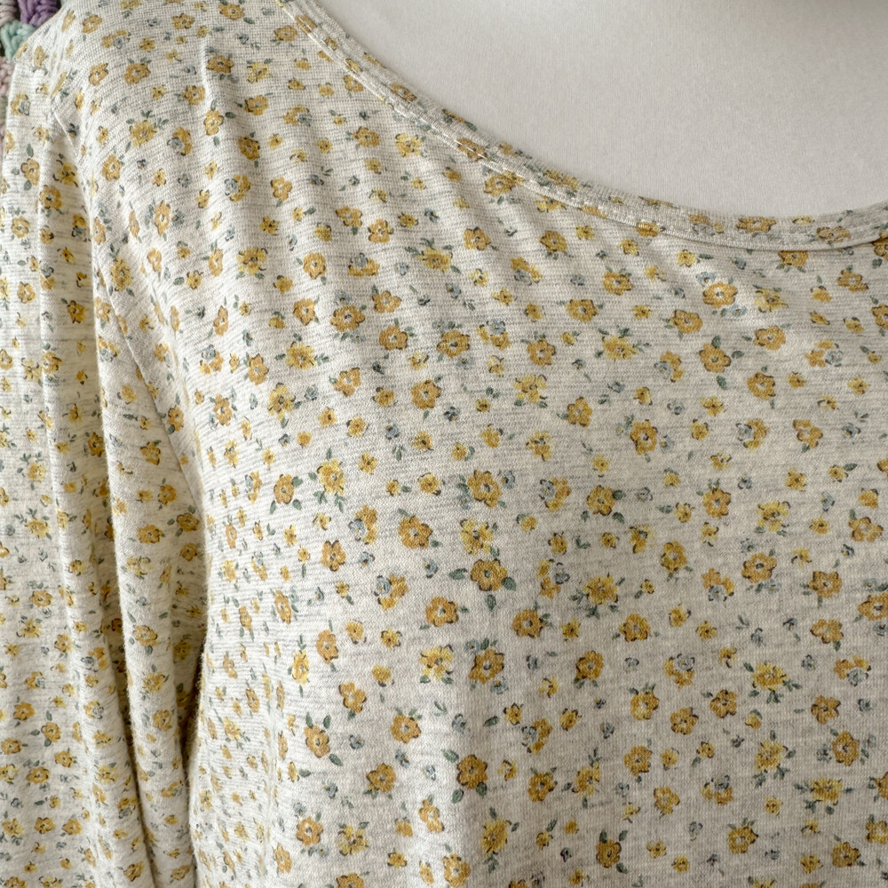노랑 잔꽃 패턴의 라운드넥 티셔츠예요