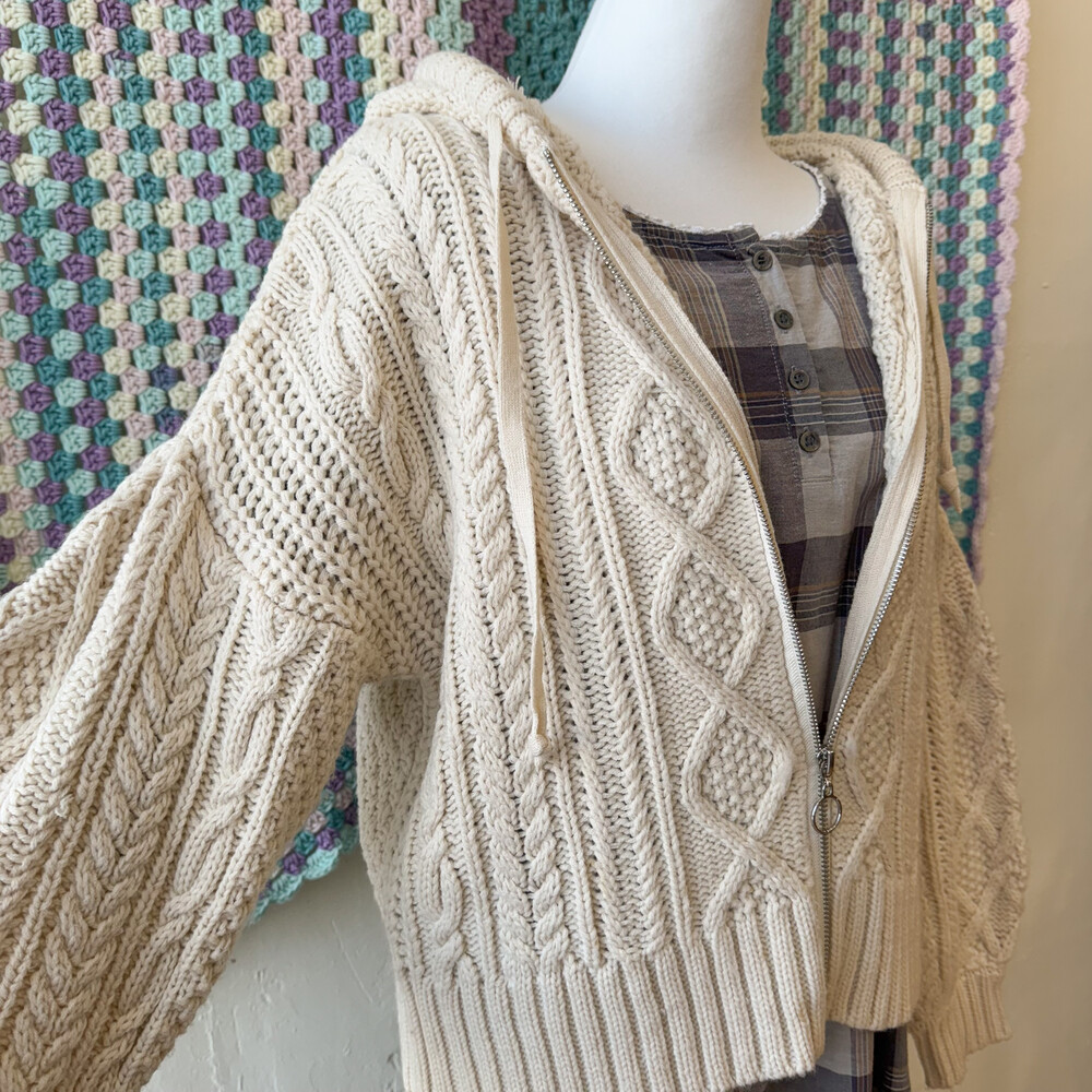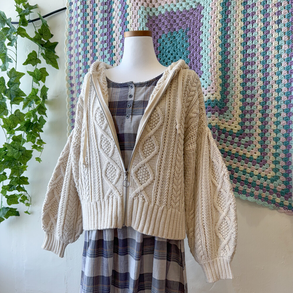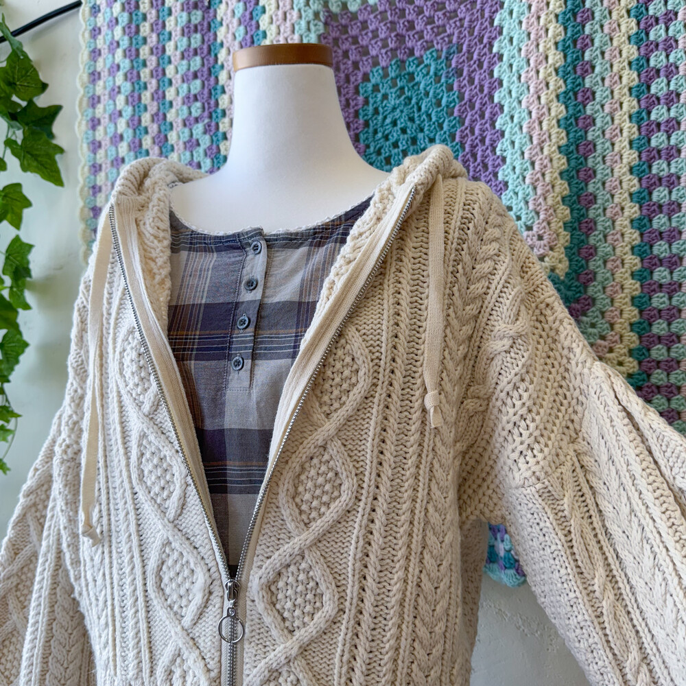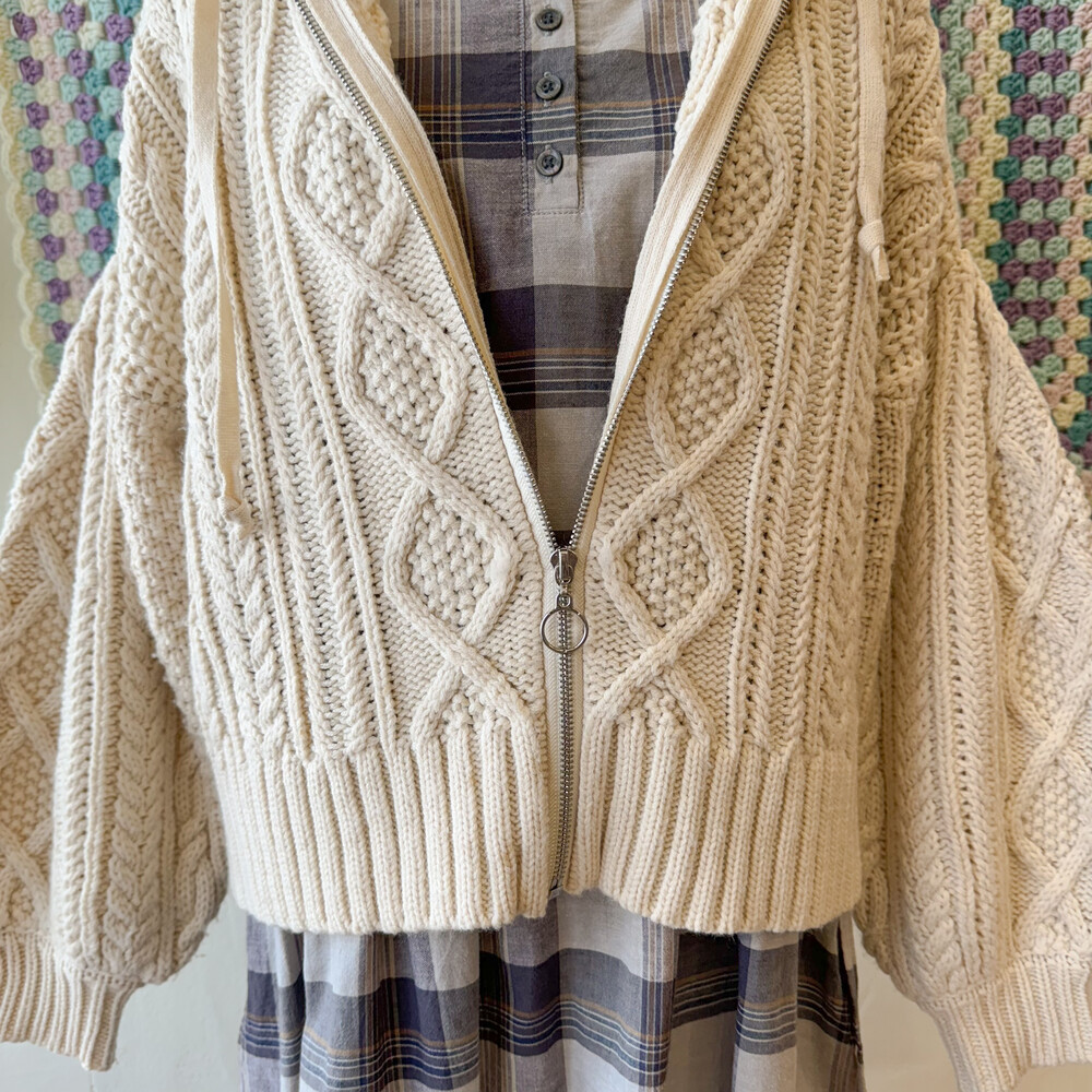 아이보리 색감의 케이블 후드 집업 가디건이에요