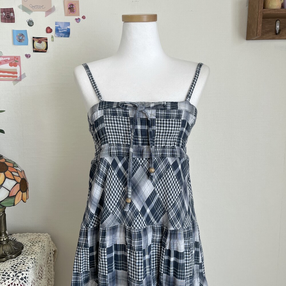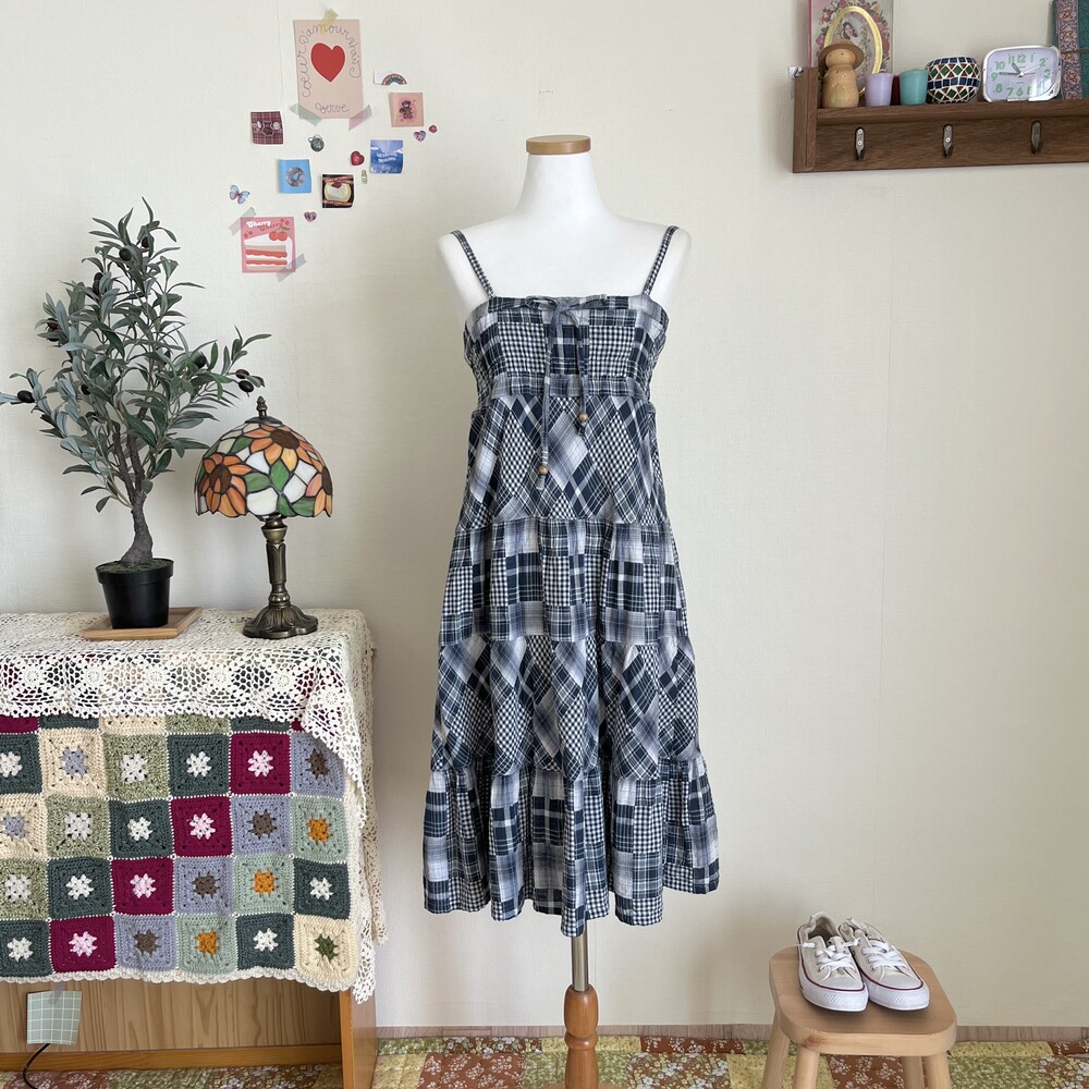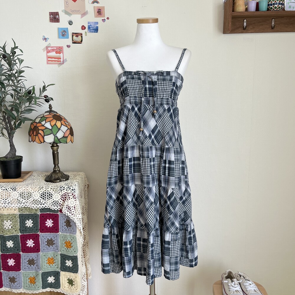 네이비 색감의 패치 체크 코튼 끈원피스예요