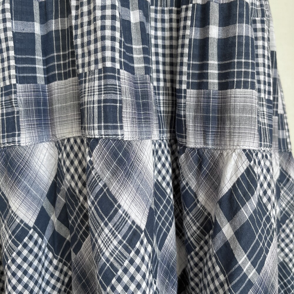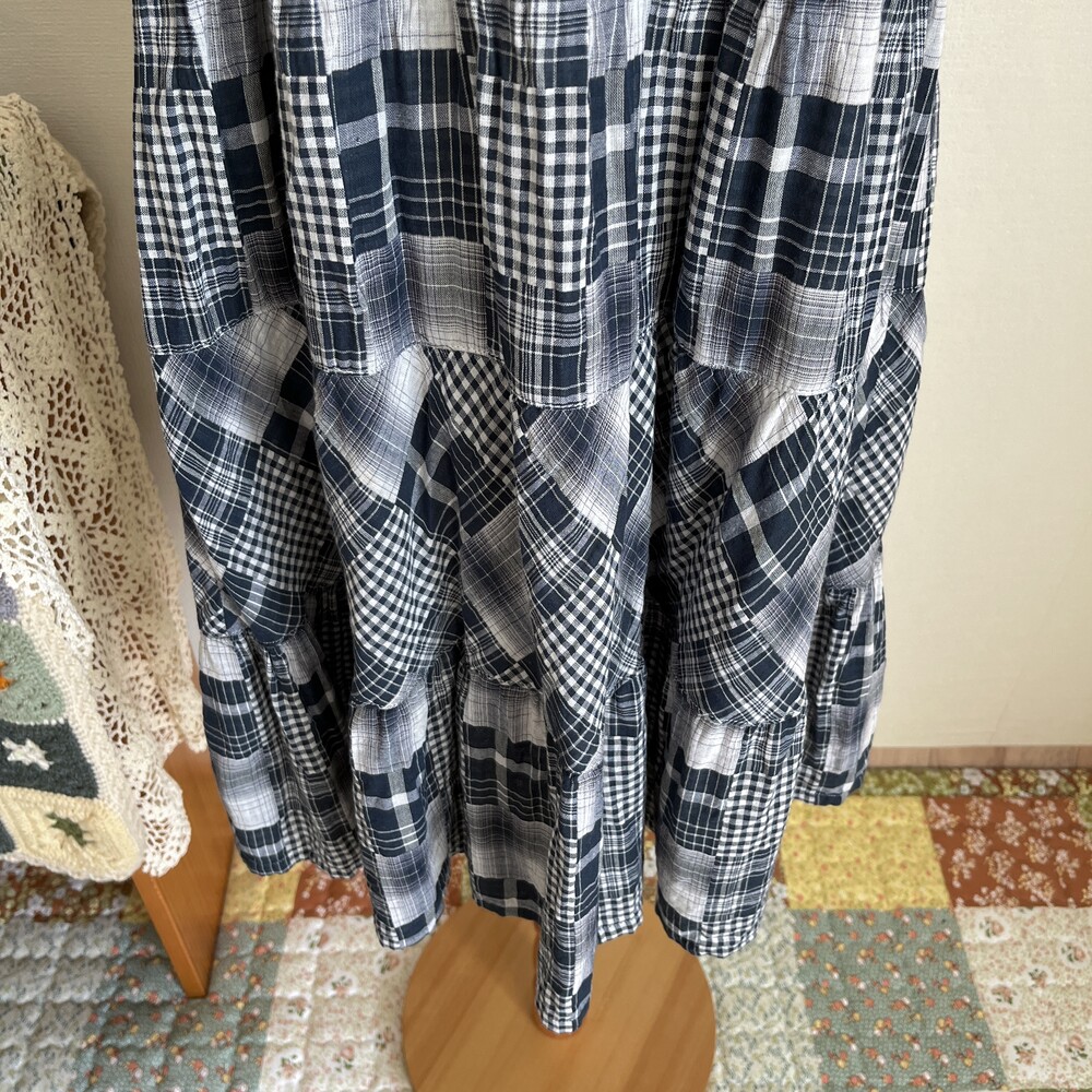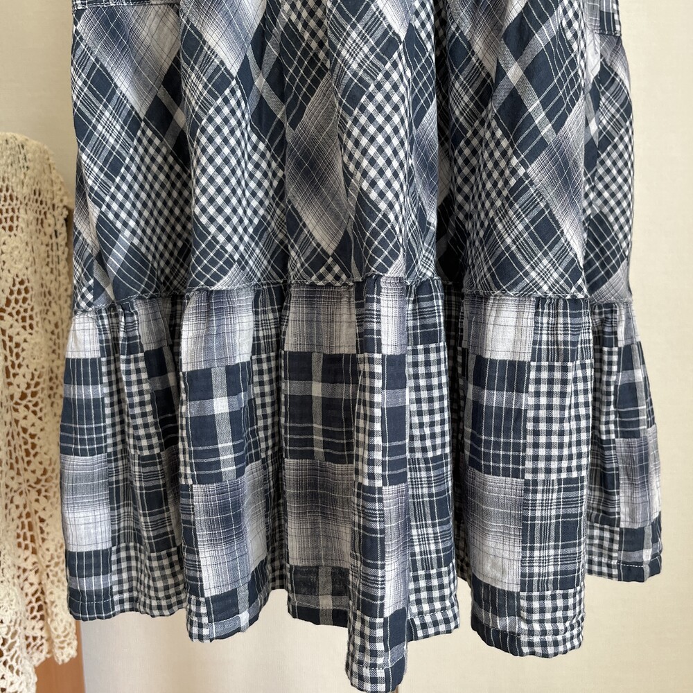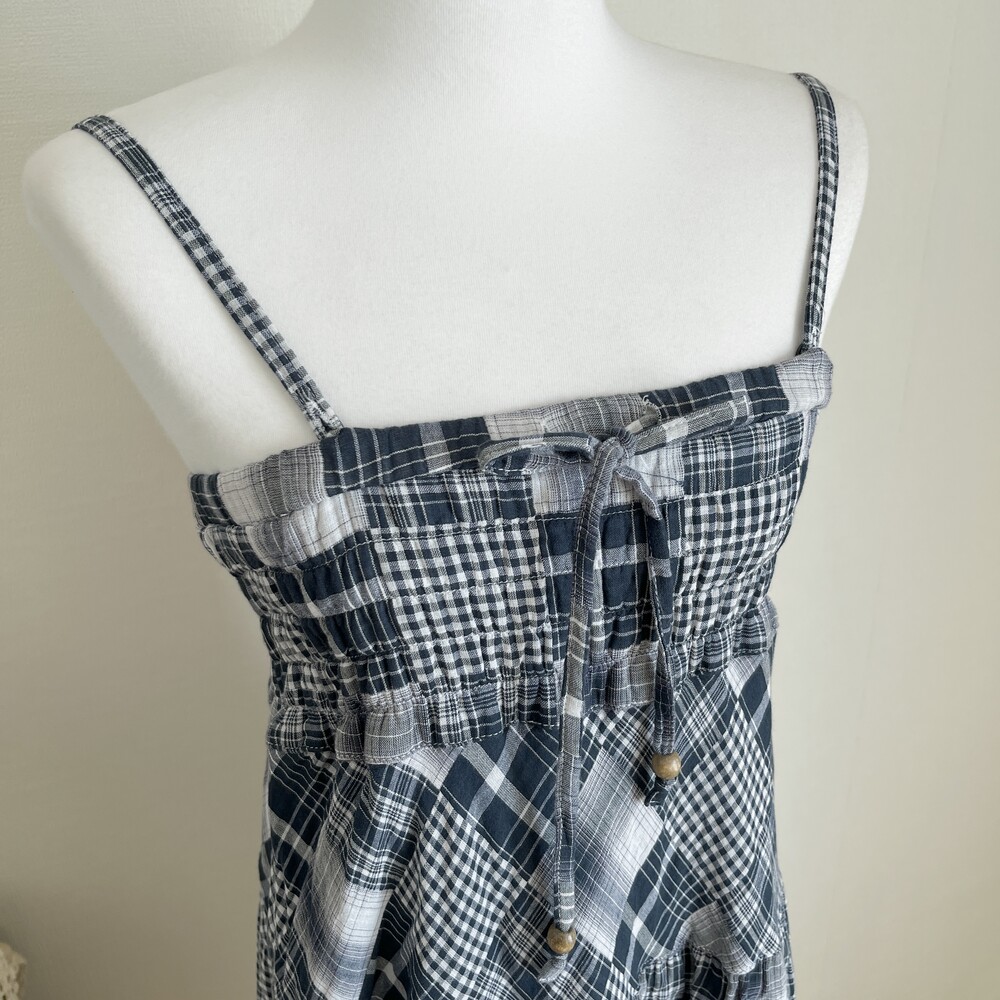 네이비 색감의 패치 체크 코튼 끈원피스예요