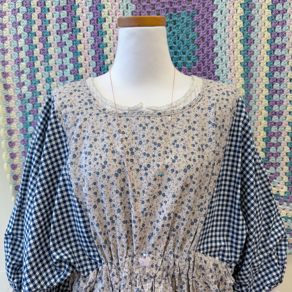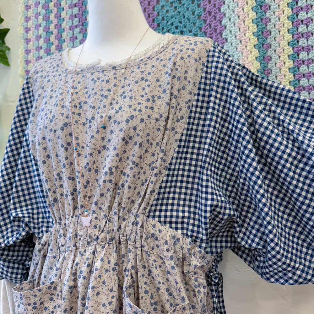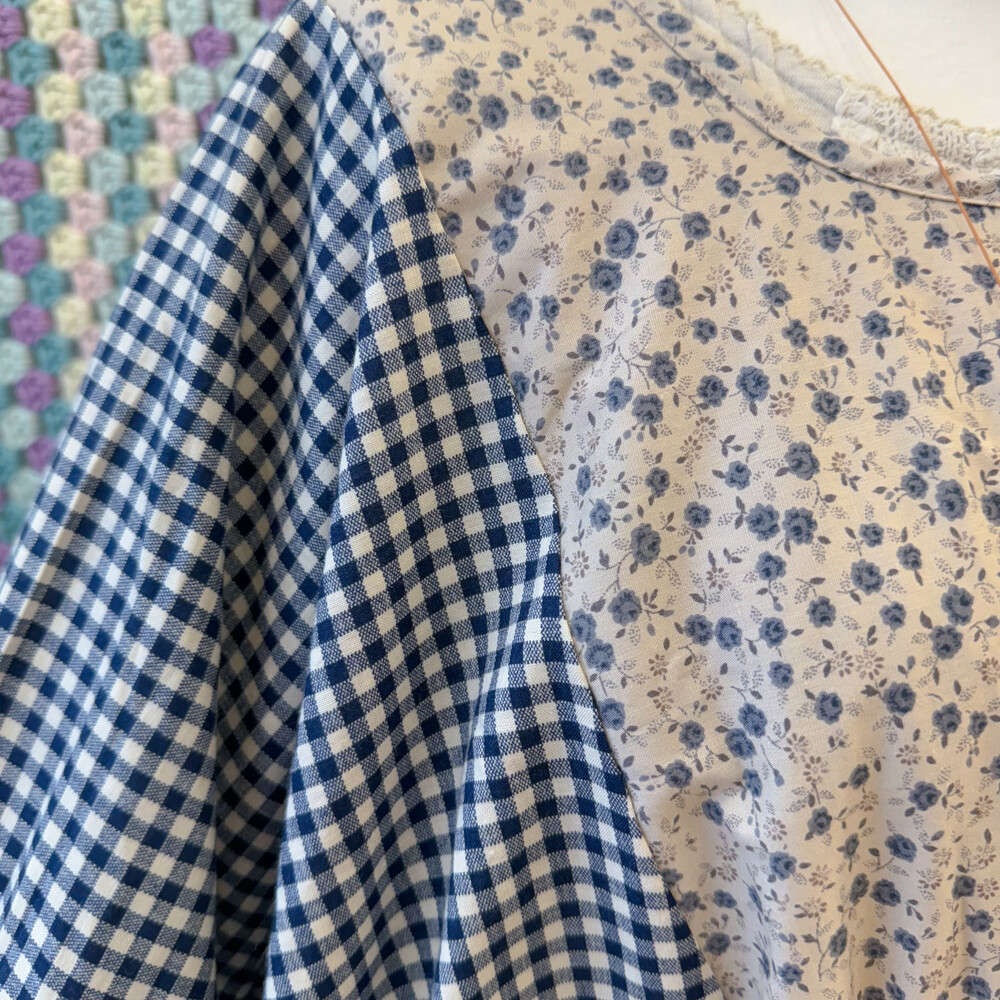 팔부분과 밑단은 체크 원단이고 가운데는 꽃무늬 원단이에요!