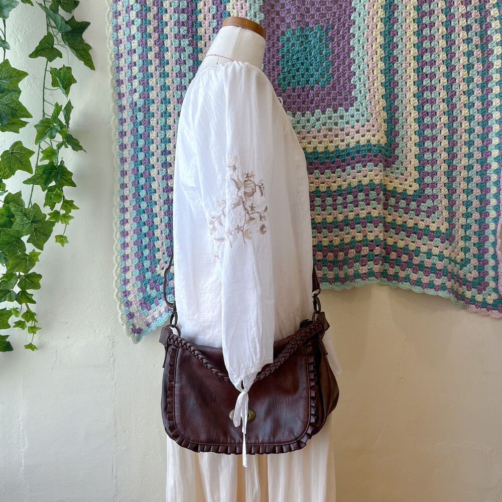 꽈배기 스트랩 포인트의 브라운 크로스백이에요