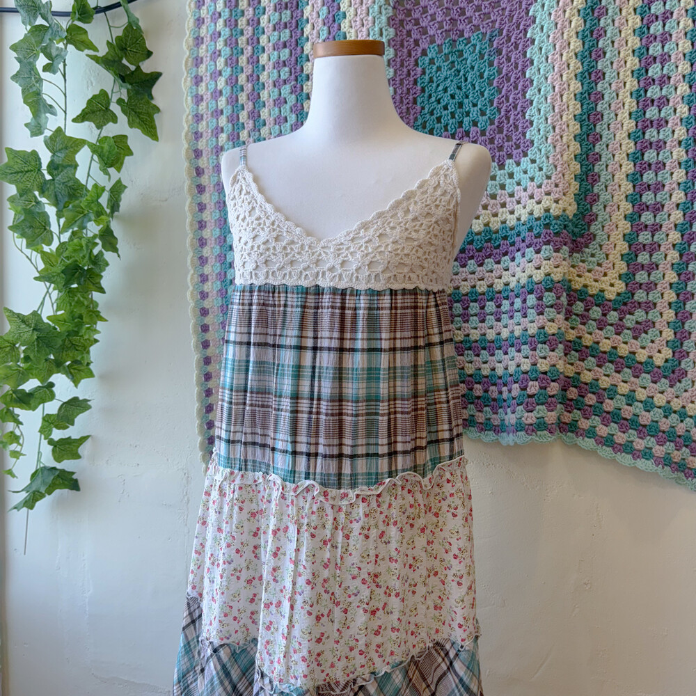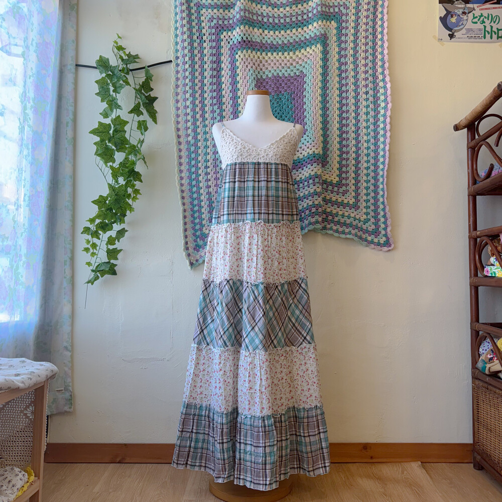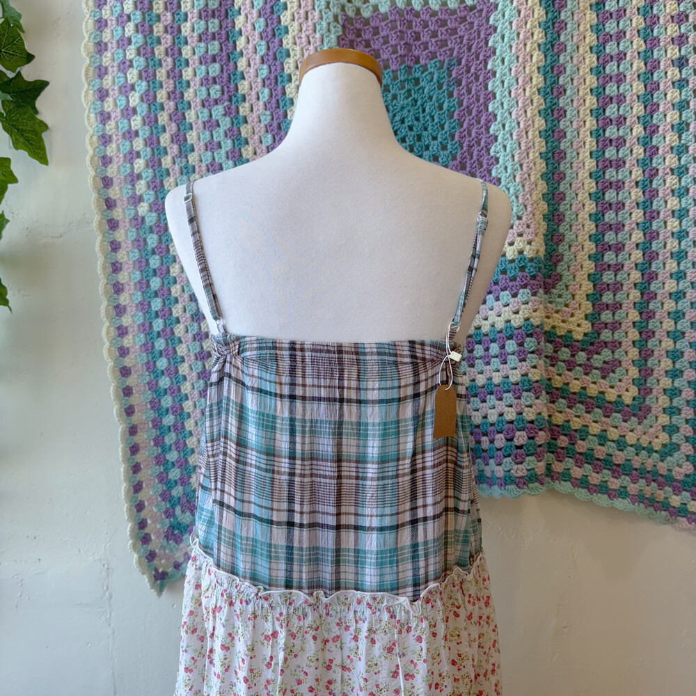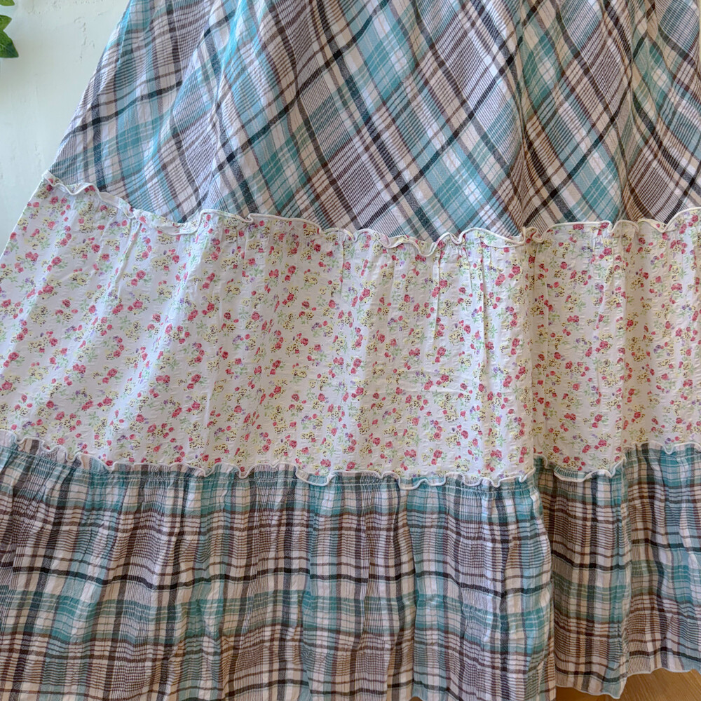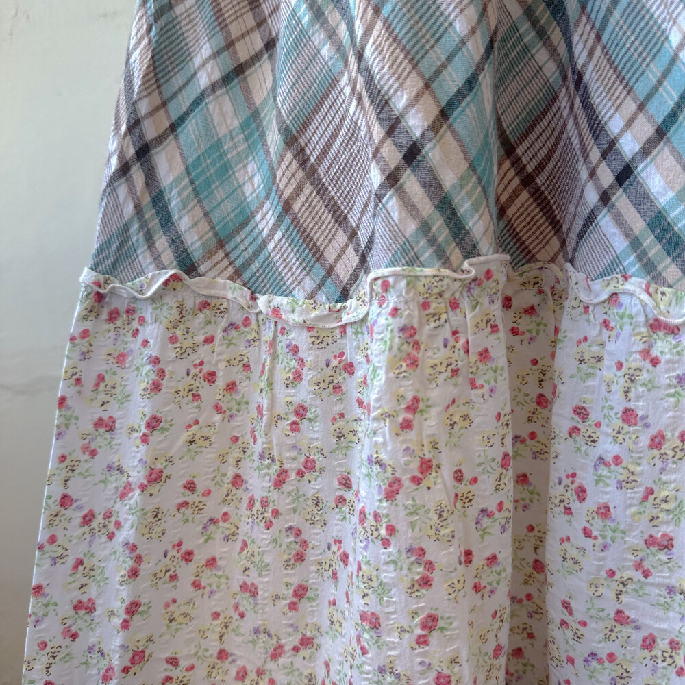청록 체크, 꽃무늬 조합의 패치 코튼 끈원피스예요