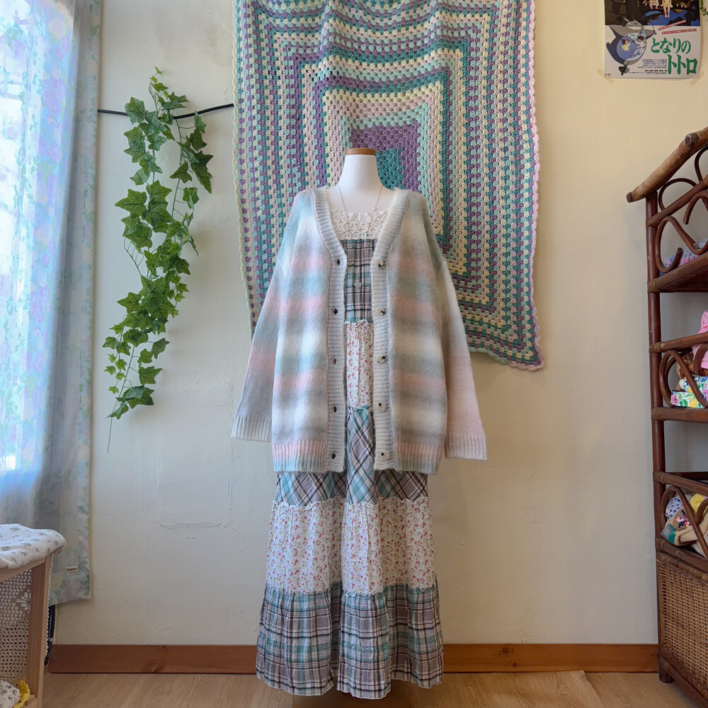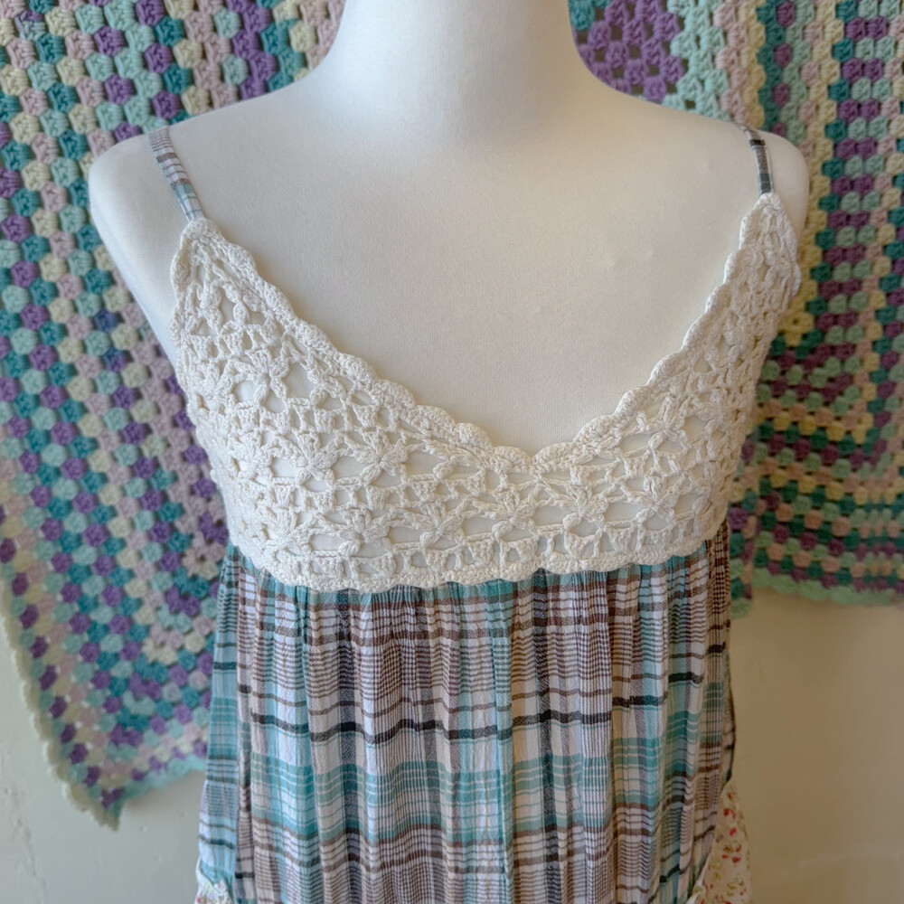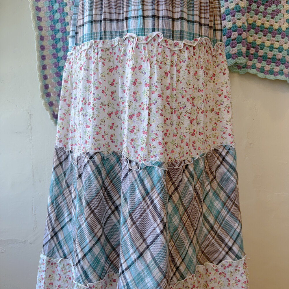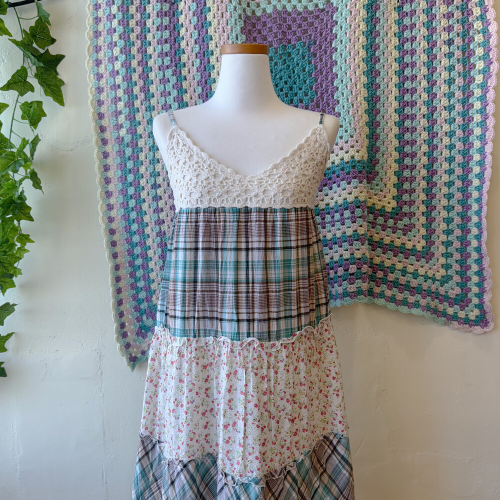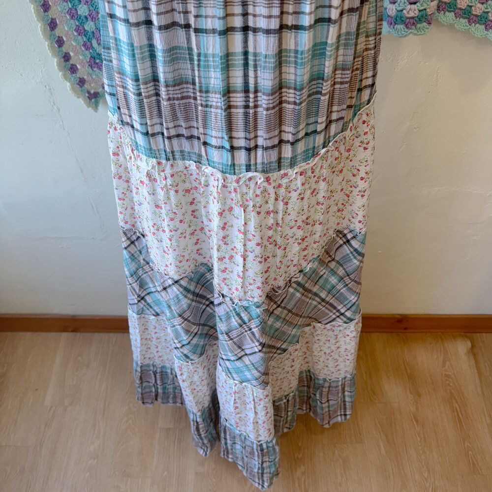 청록 체크, 꽃무늬 조합의 패치 코튼 끈원피스예요