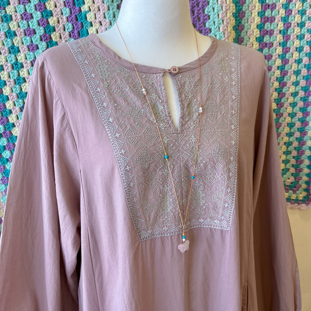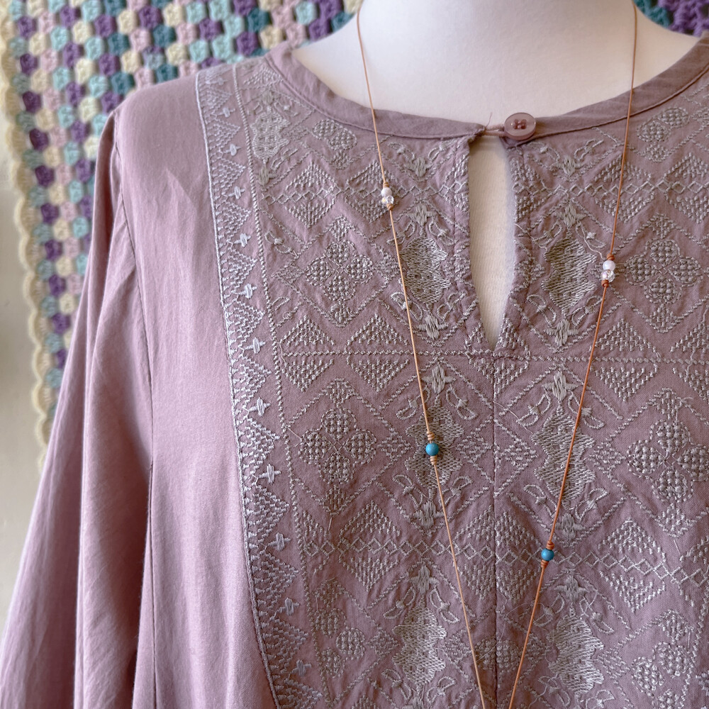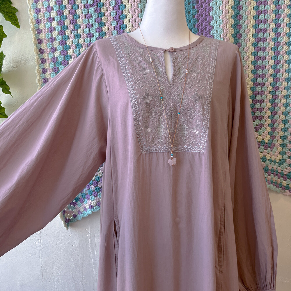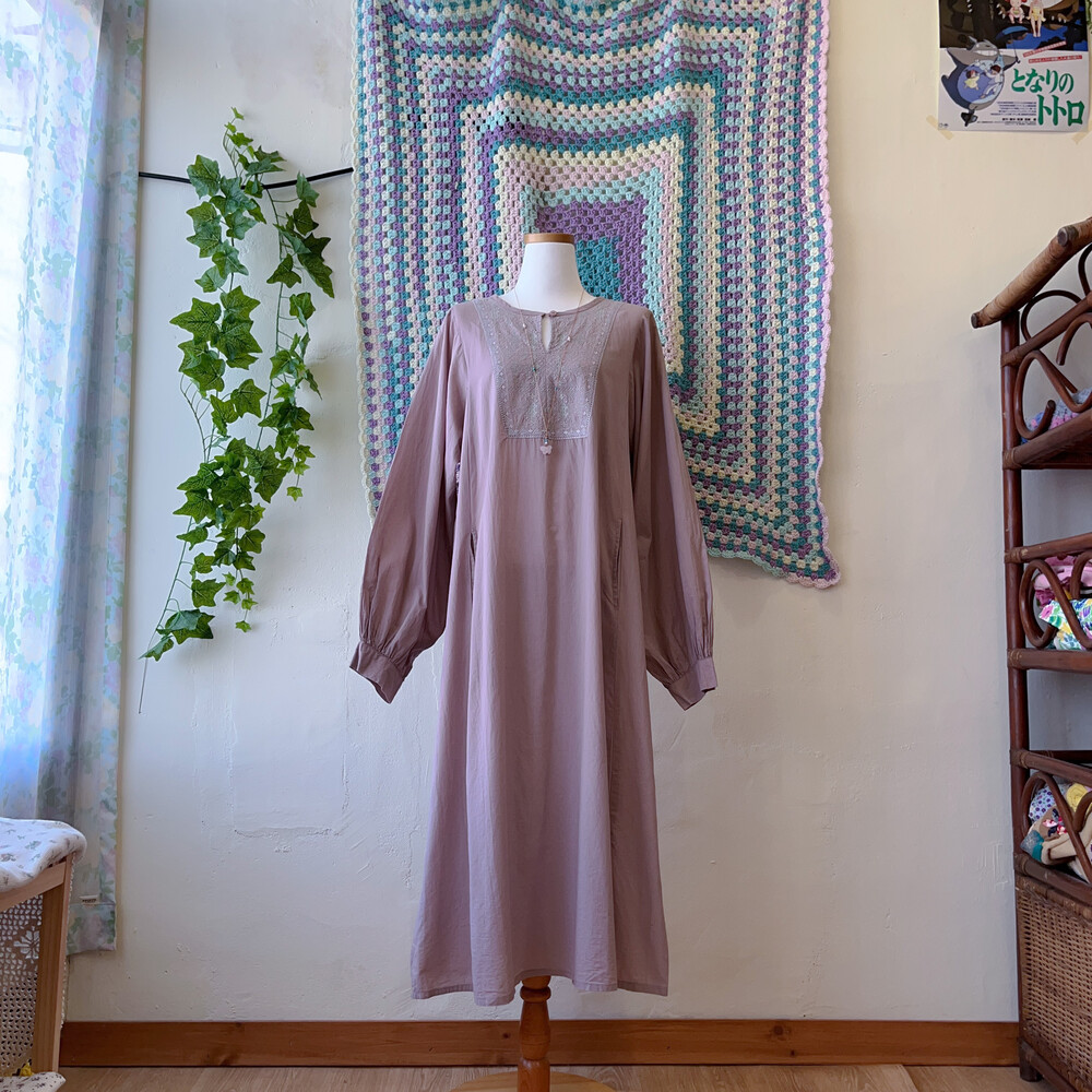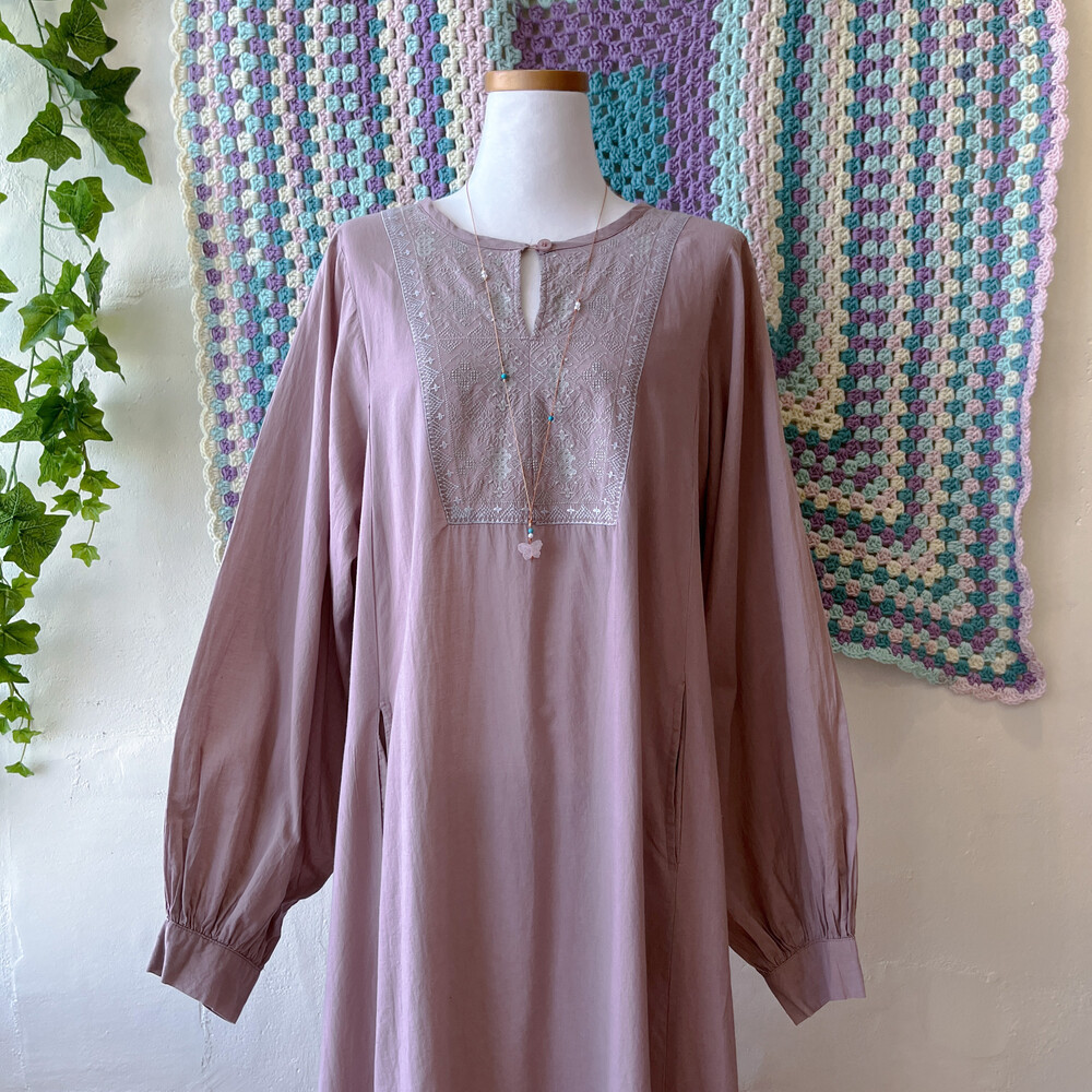 뮤트한 색감의 오버사이즈 자수 코튼 원피스예요