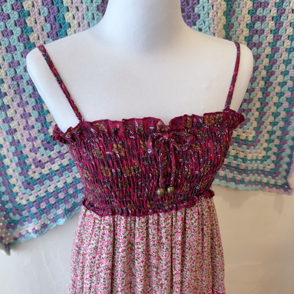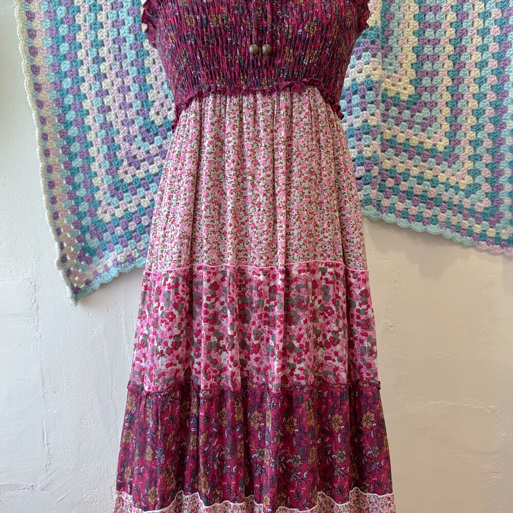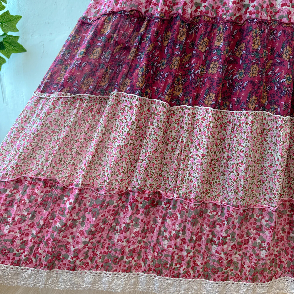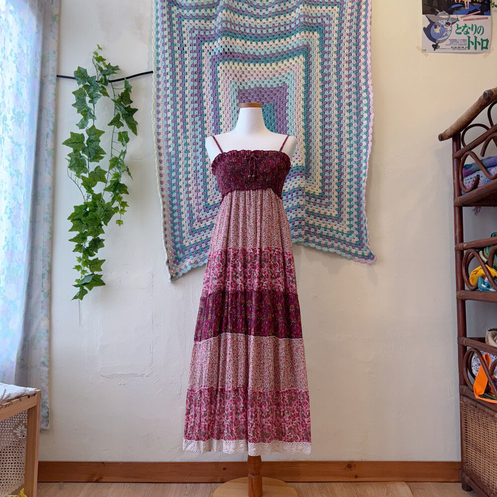 버건디, 핑크 색감의 꽃무늬 패치워크 원피스예요