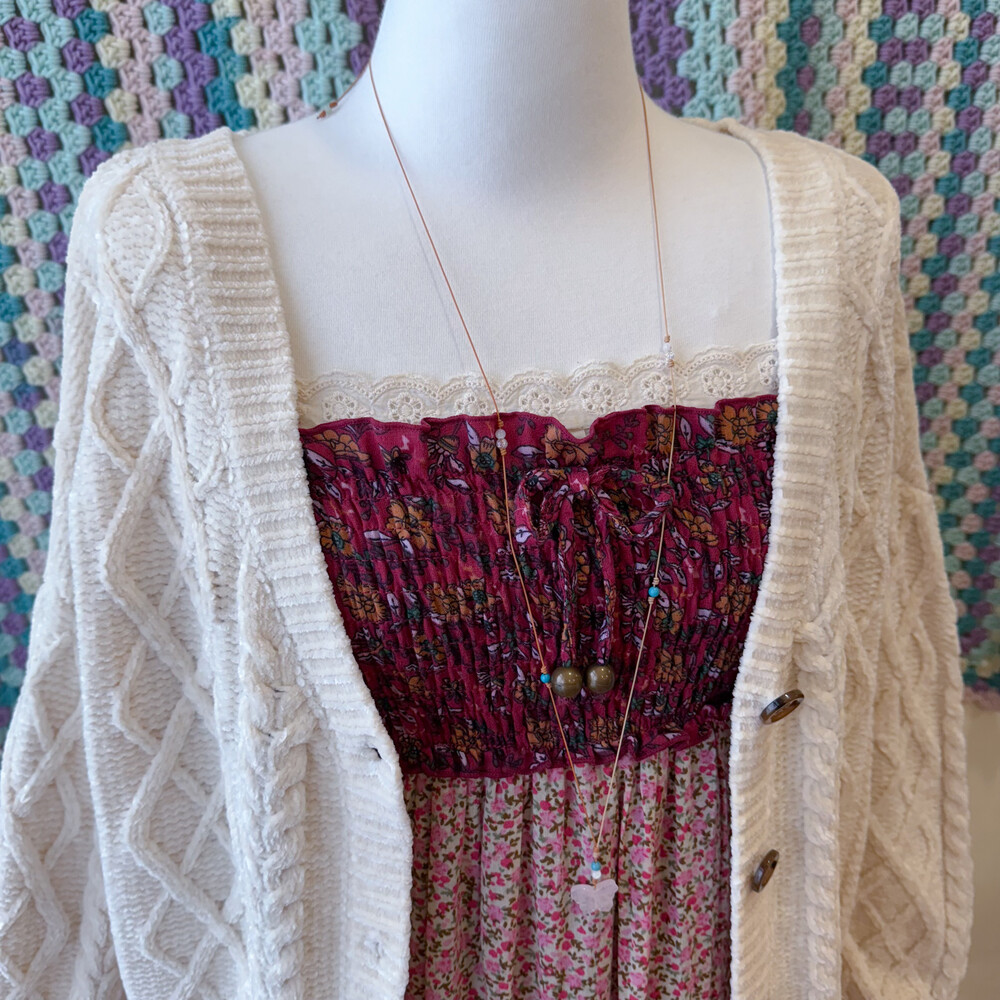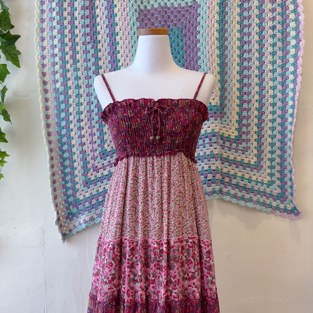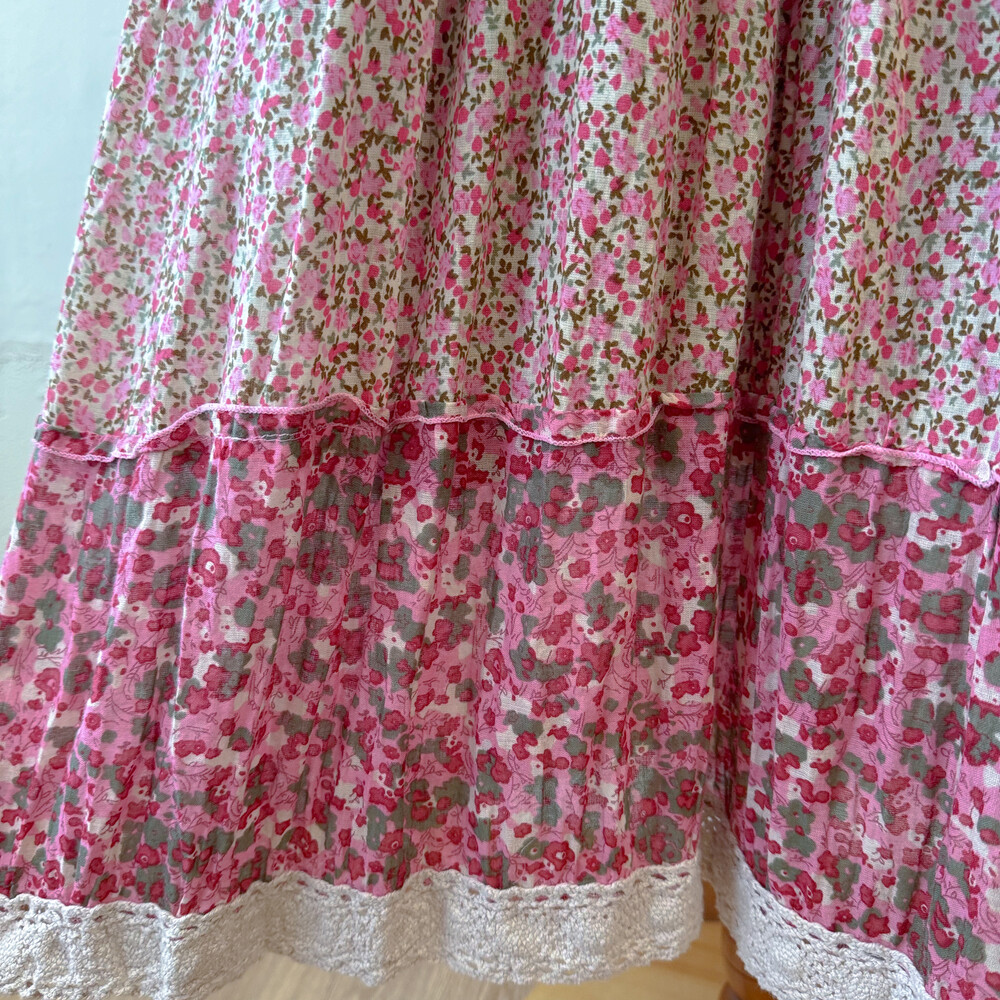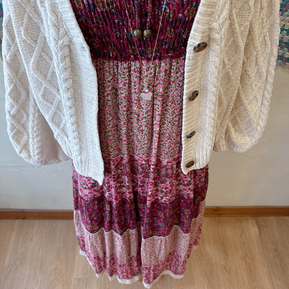 버건디, 핑크 색감의 꽃무늬 패치워크 원피스예요