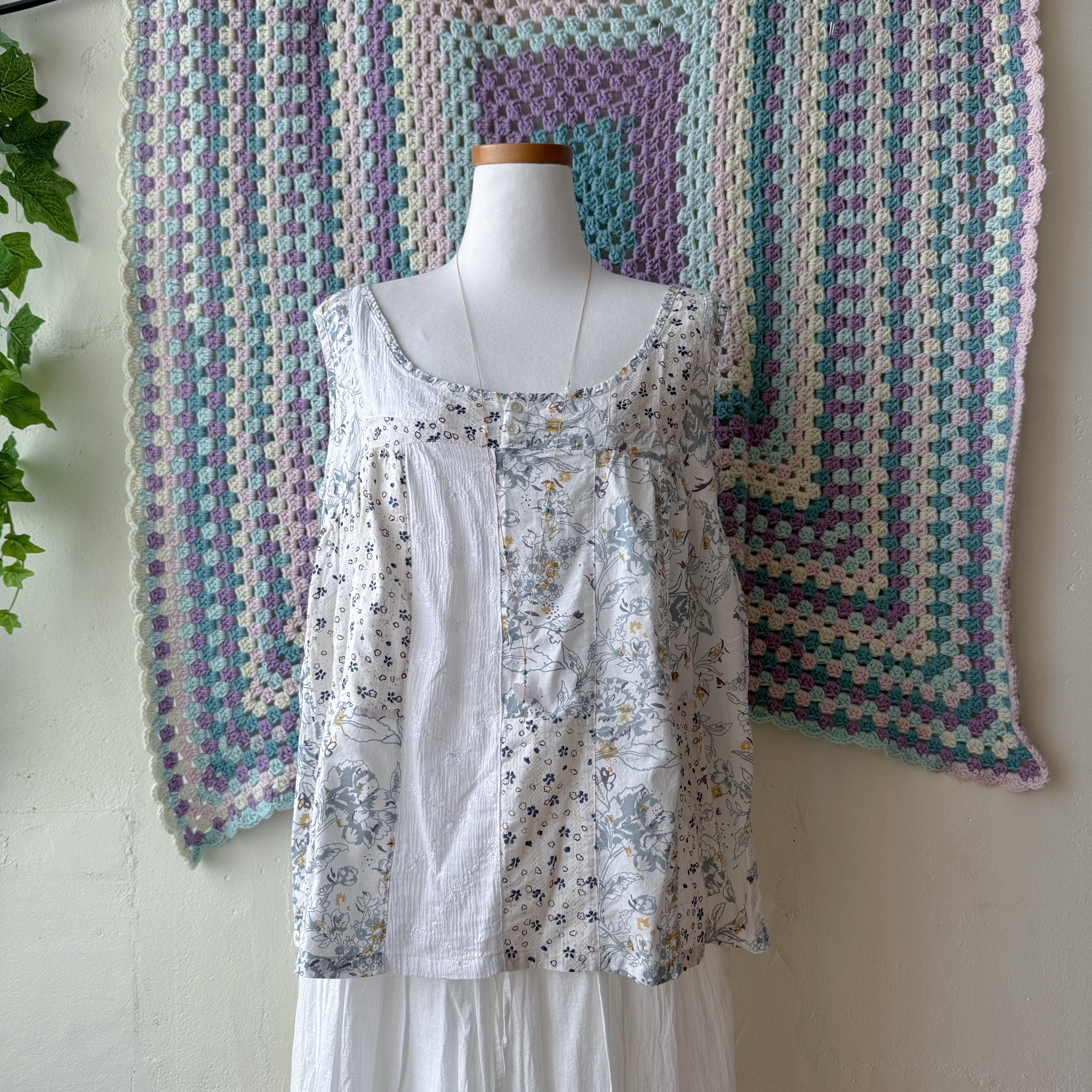 민트그레이, 네이비 꽃무늬 등이 조합된 패치 블라우스예요