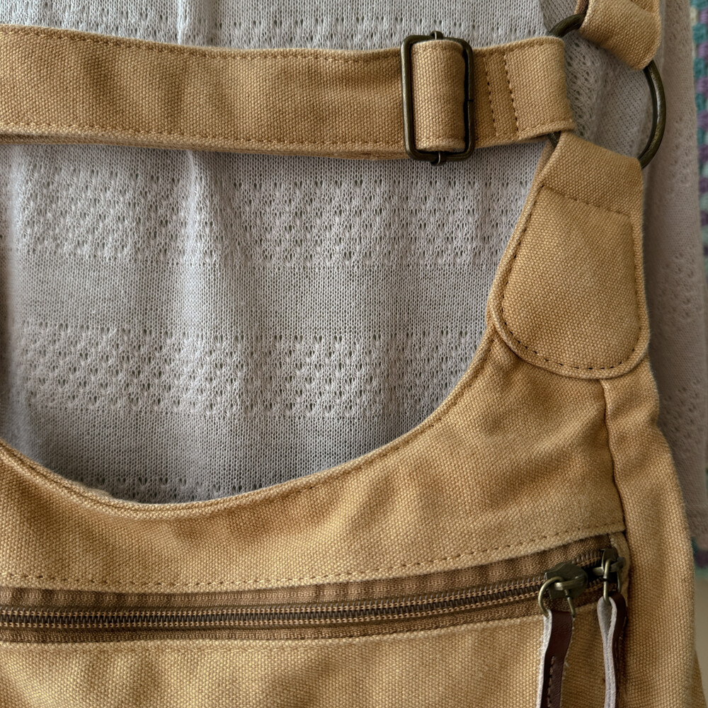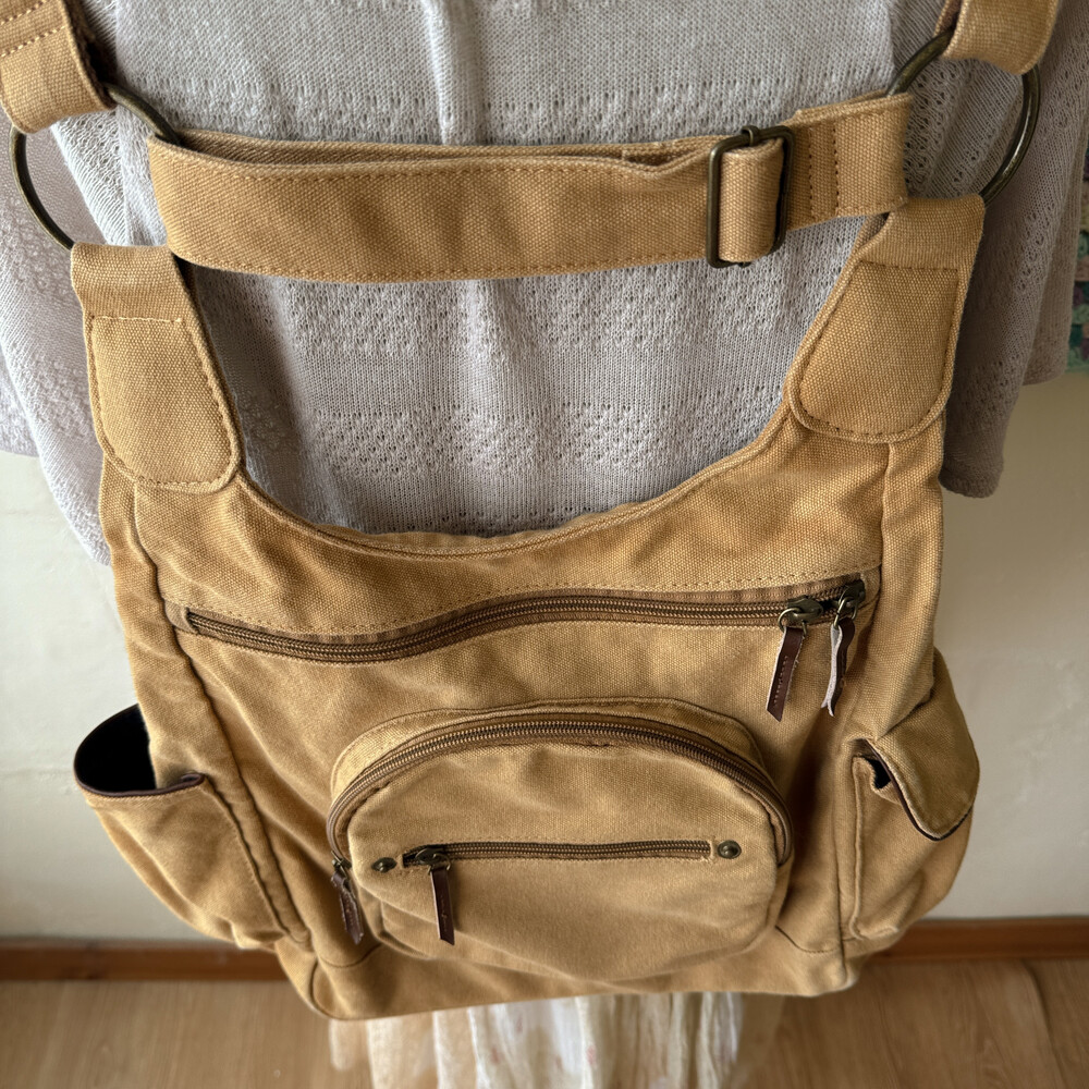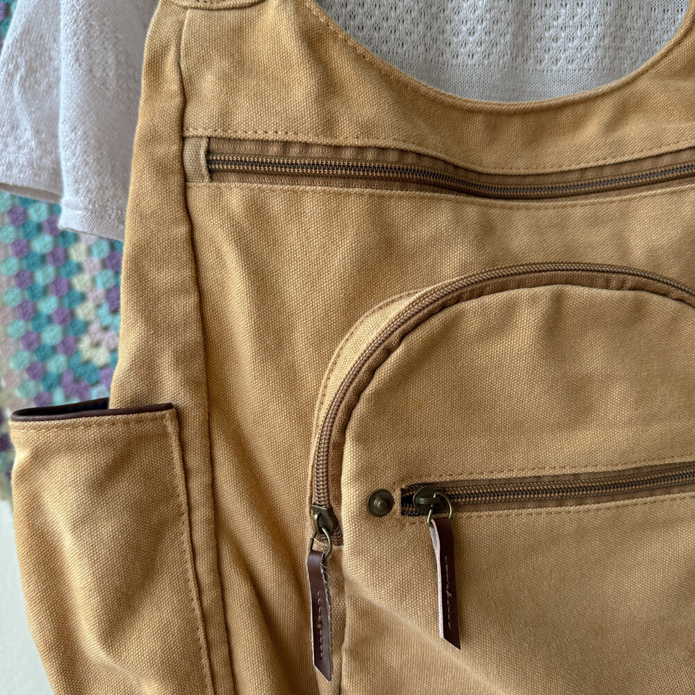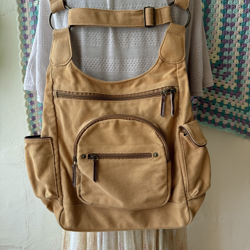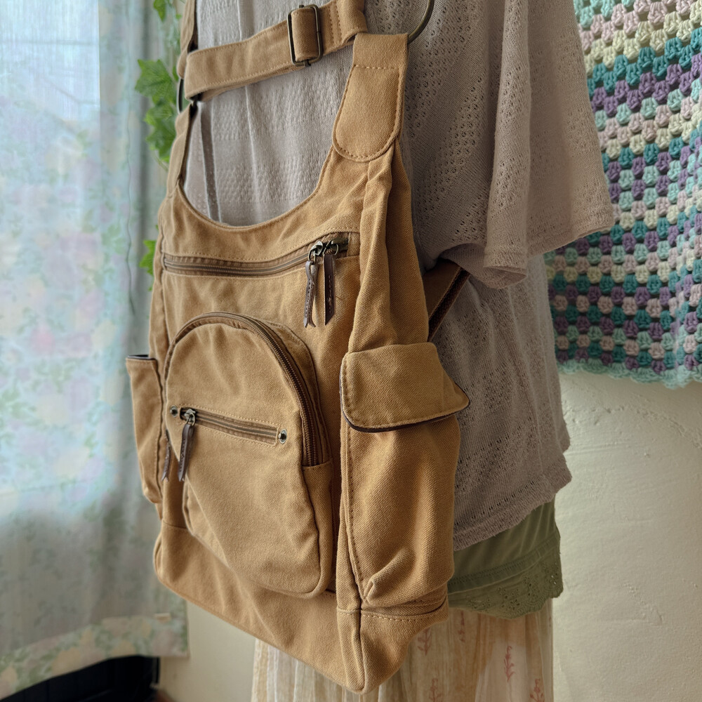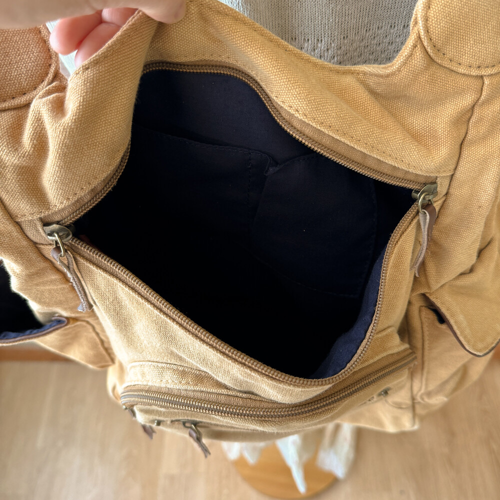 camel vintage pocket strap backpack