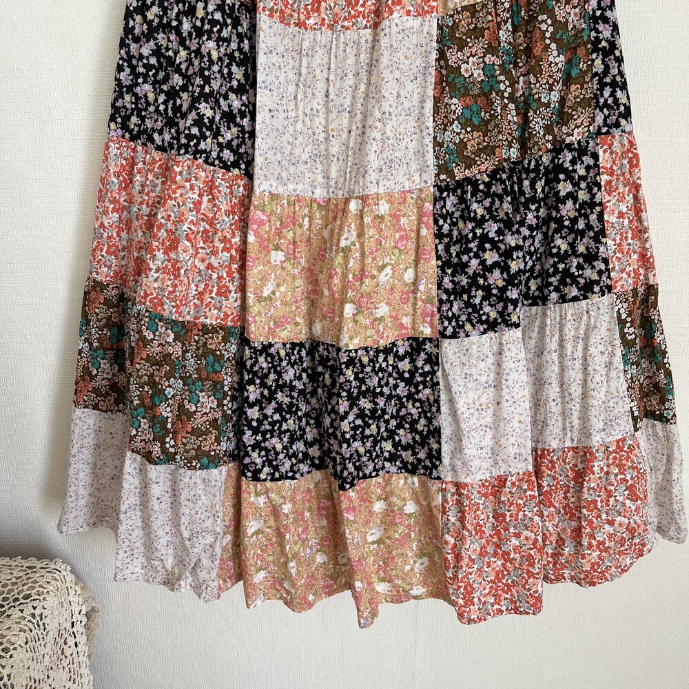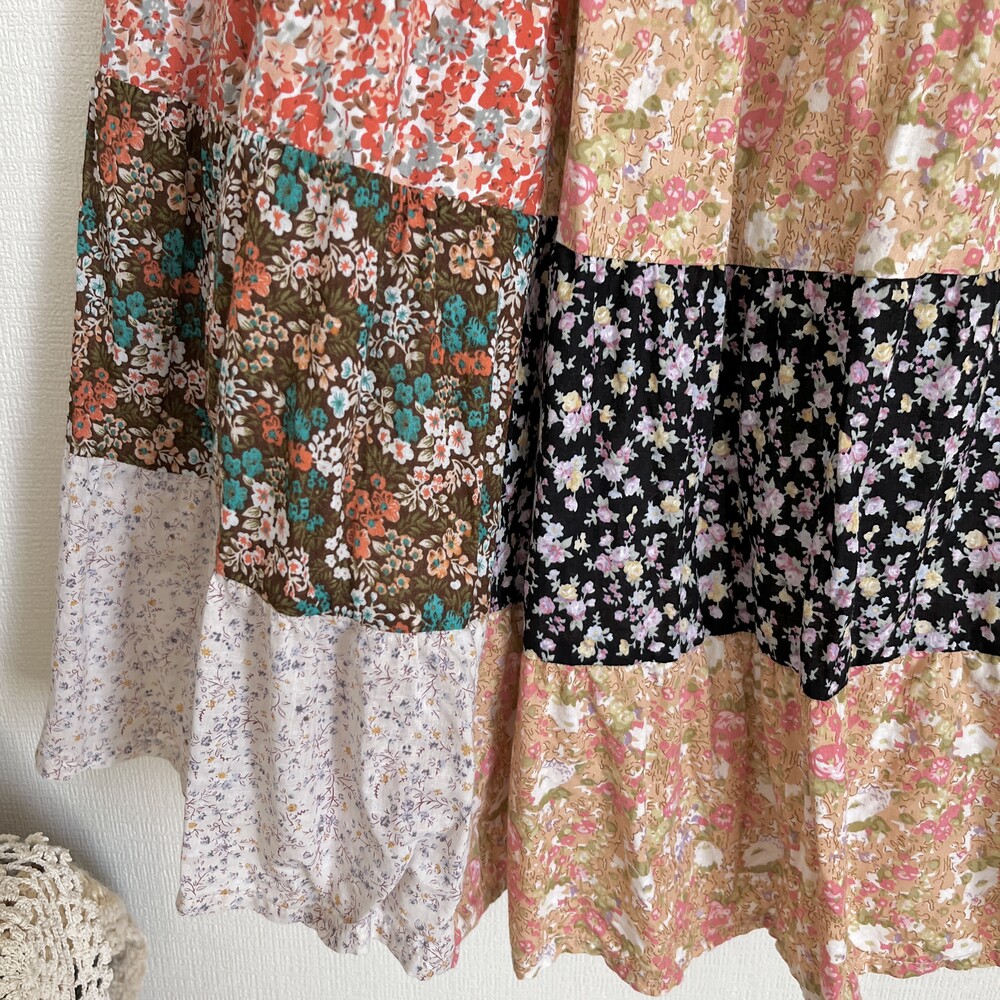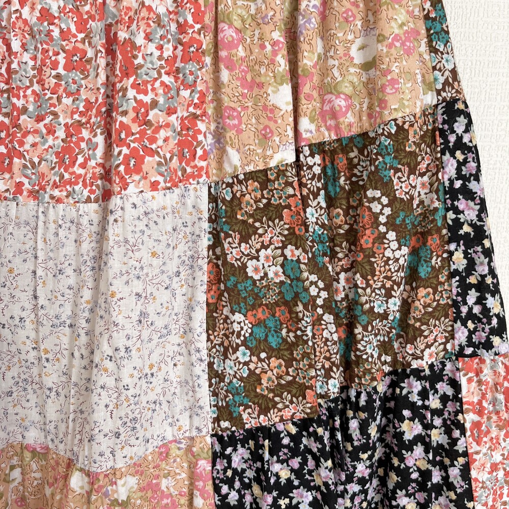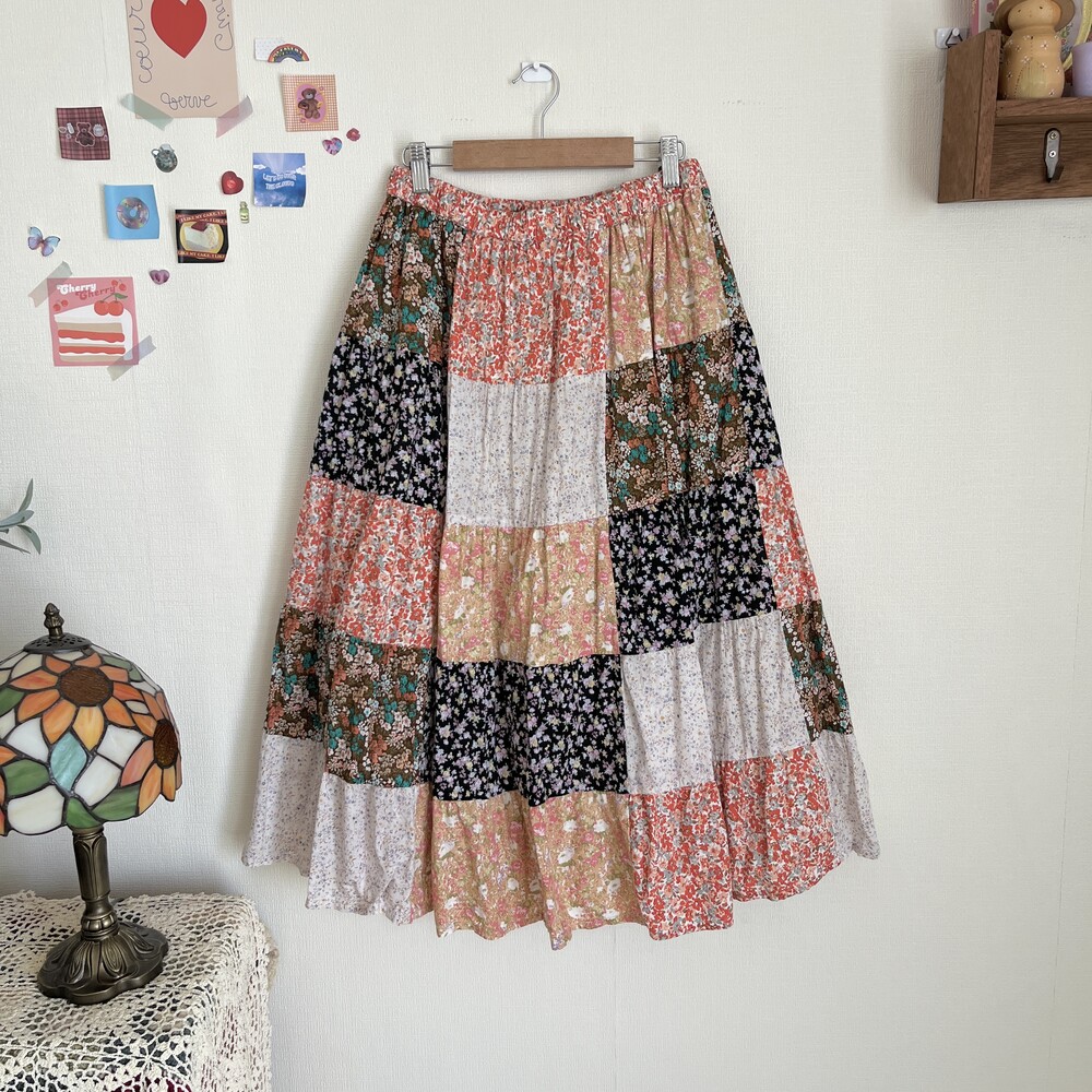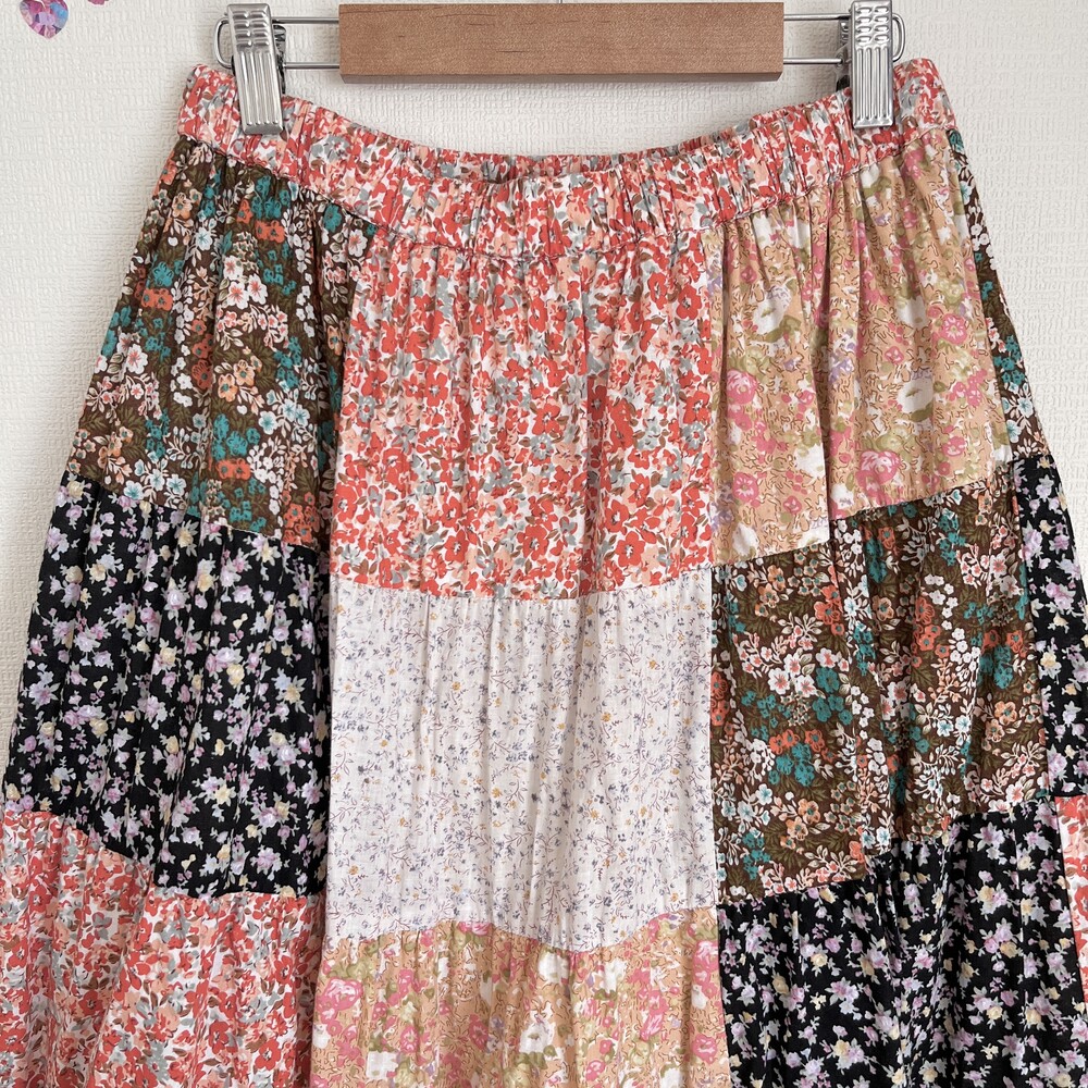 다홍색, 베이지색 베이스의 잔꽃 패치워크 스커트예요