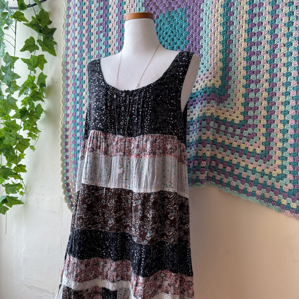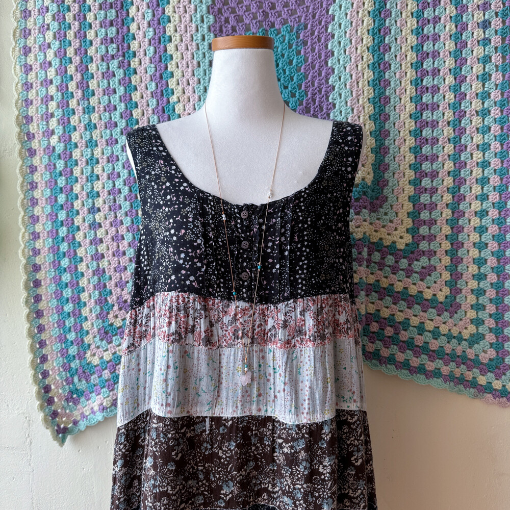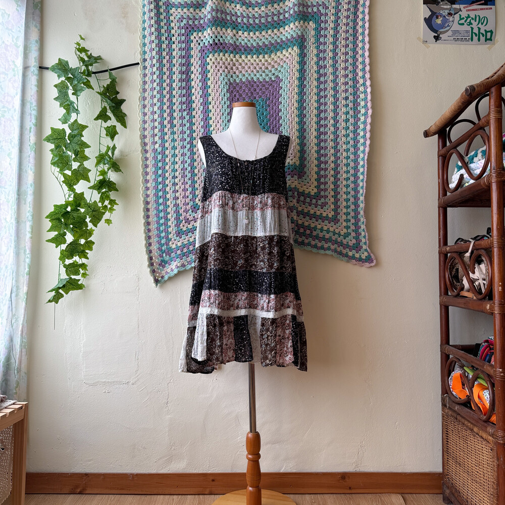 블랙, 밀크, 핑크 색감 조합의 패치워크 민소매 원피스예요
