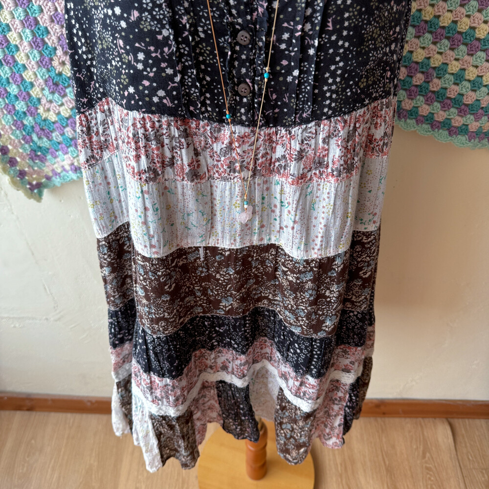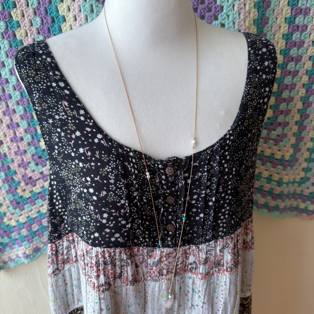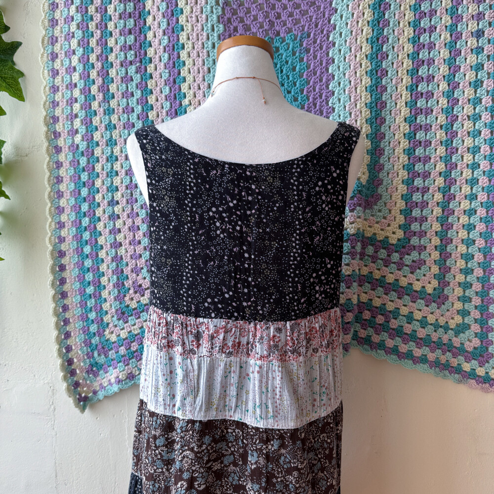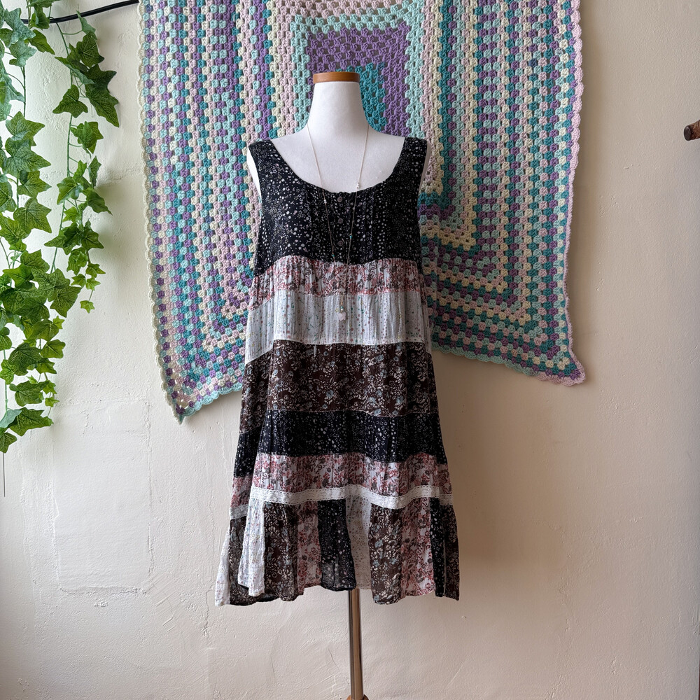 블랙, 밀크, 핑크 색감 조합의 패치워크 민소매 원피스예요