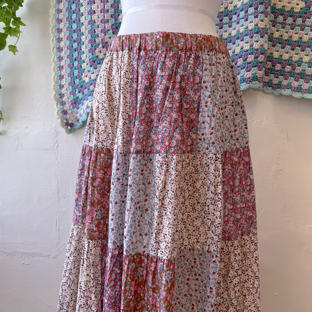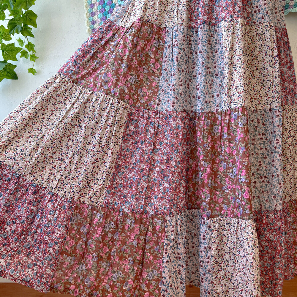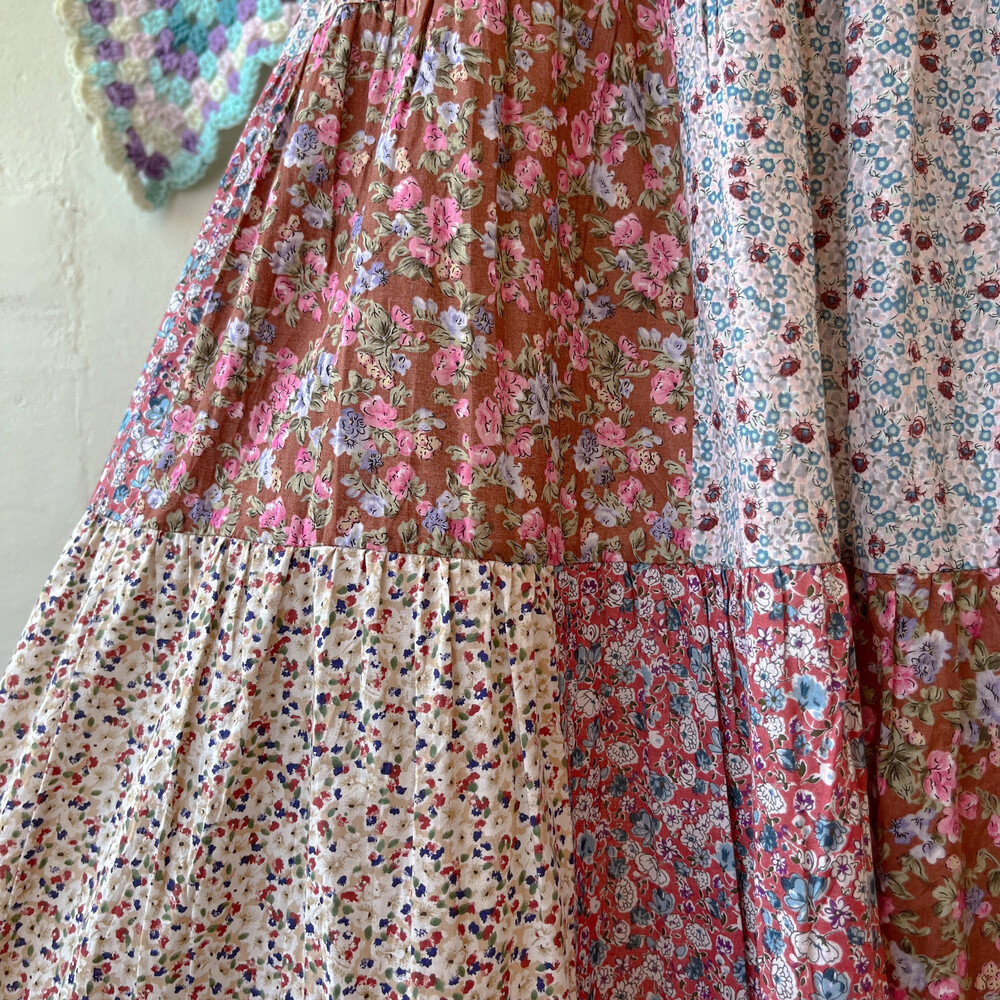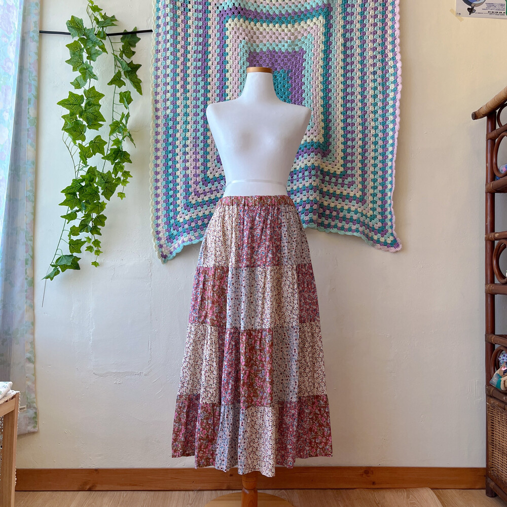 분홍색감 베이스의 패치워크 스커트예요
