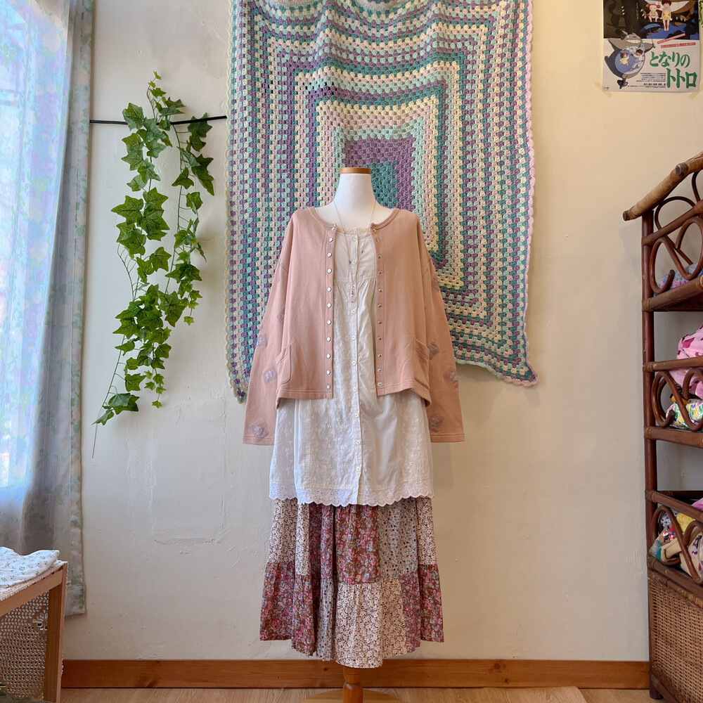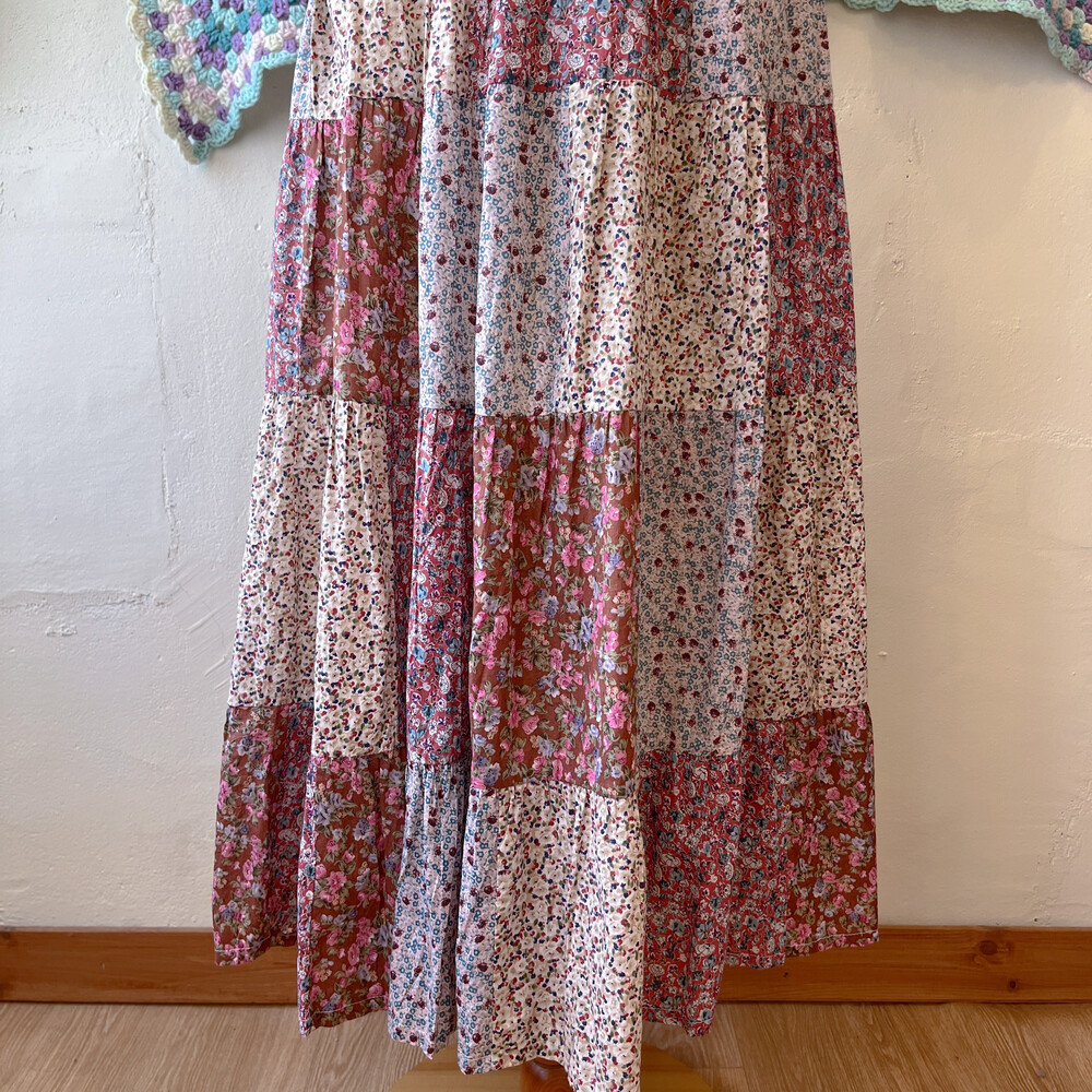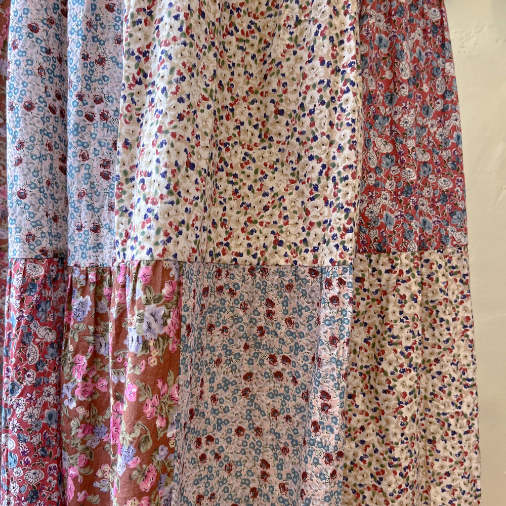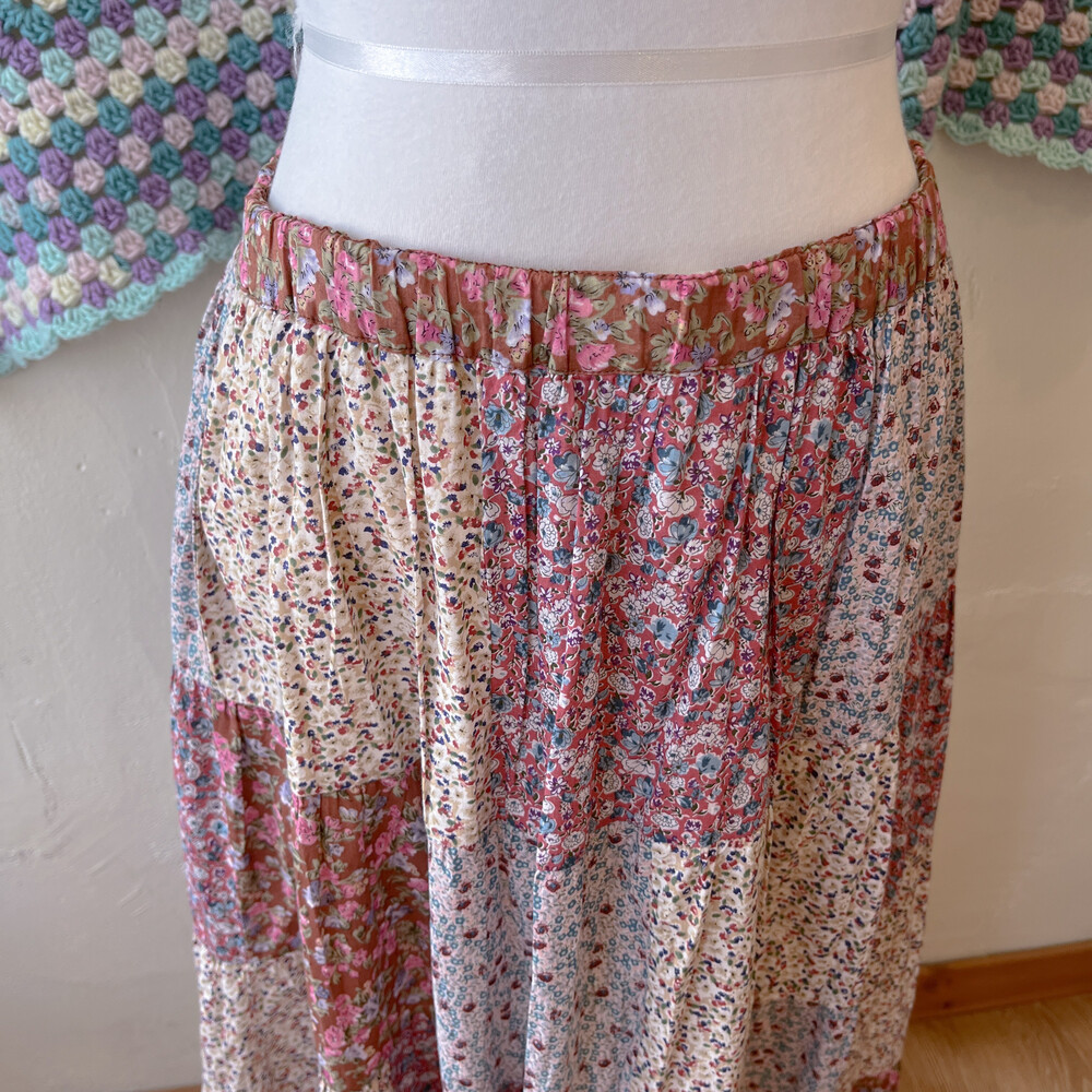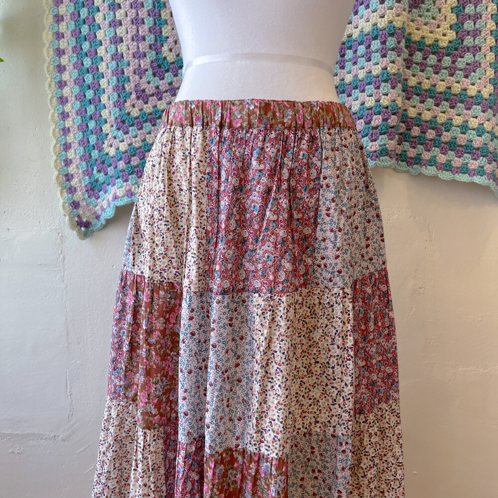 분홍색감 베이스의 패치워크 스커트예요