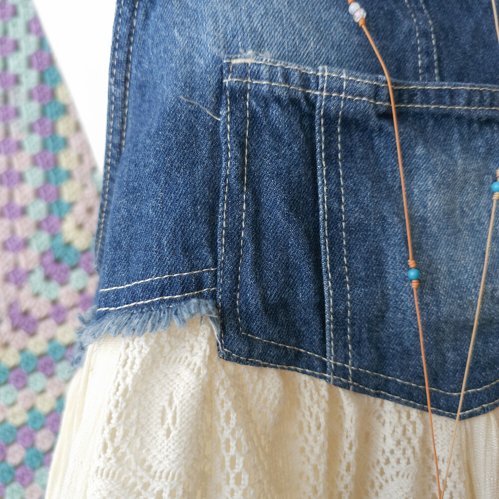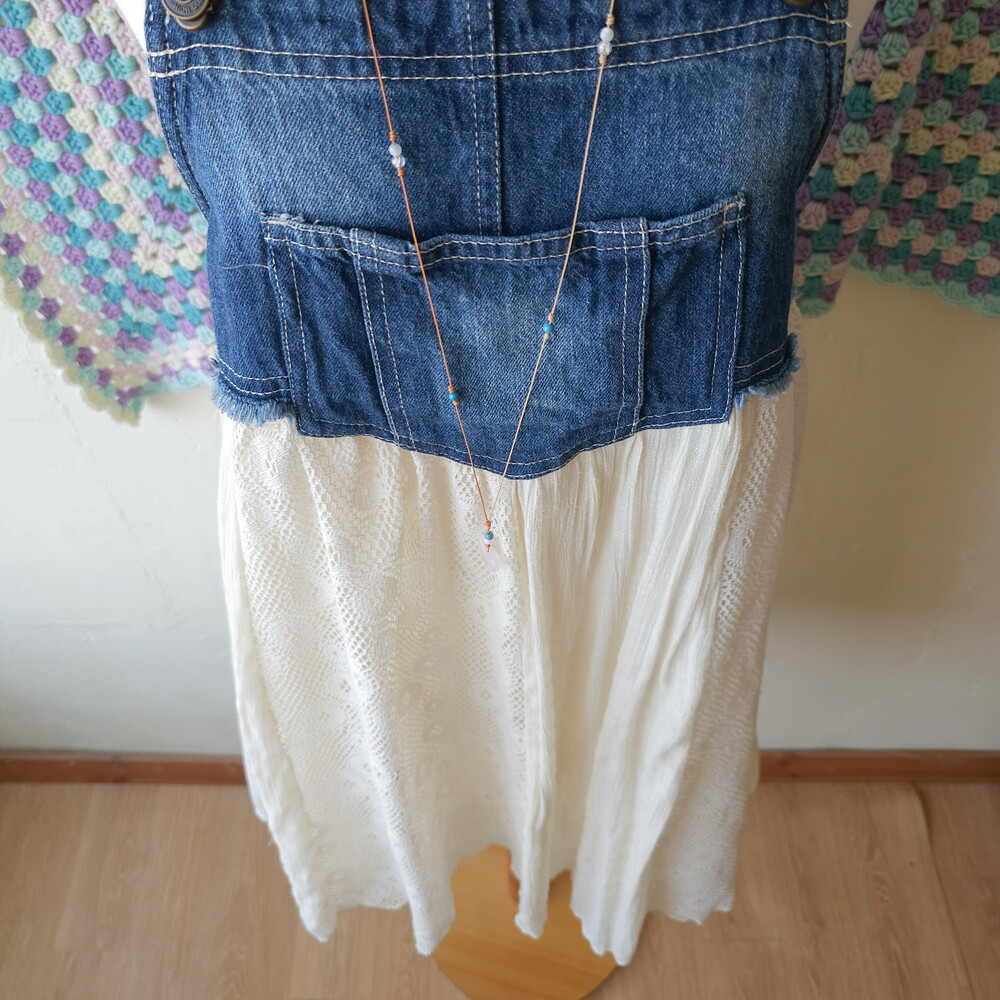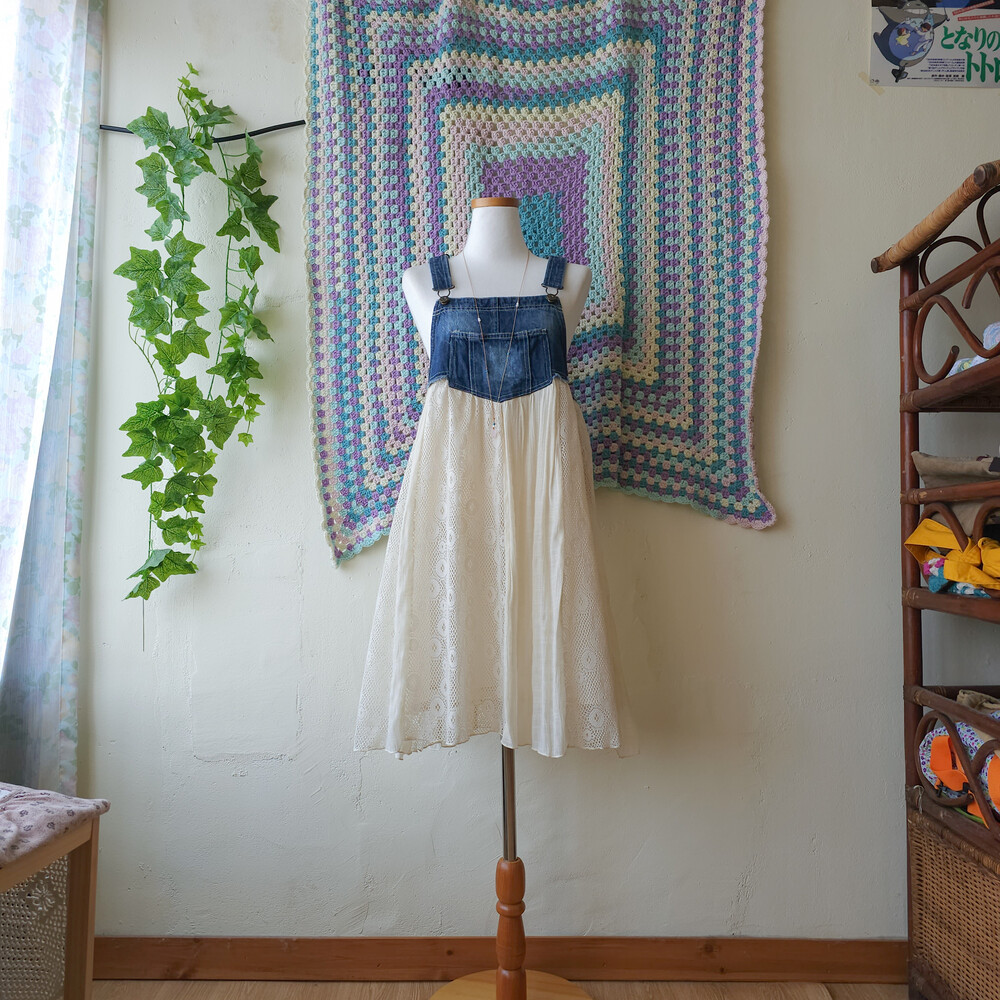 진청 데님 베이스의 세로 패치 멜빵 원피스예요