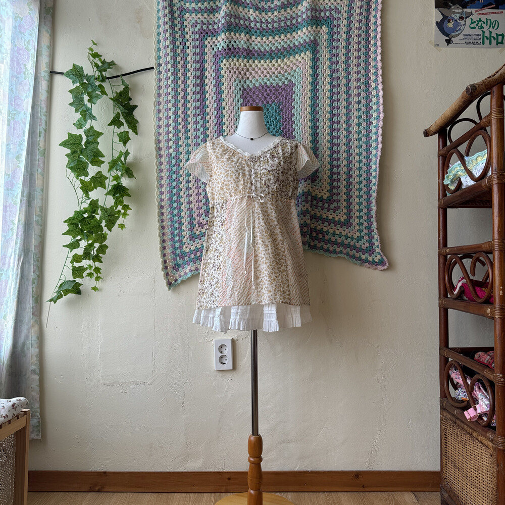 브이넥 디자인이구요, 가슴 아래 끈으로 더 조일 수 있어요!