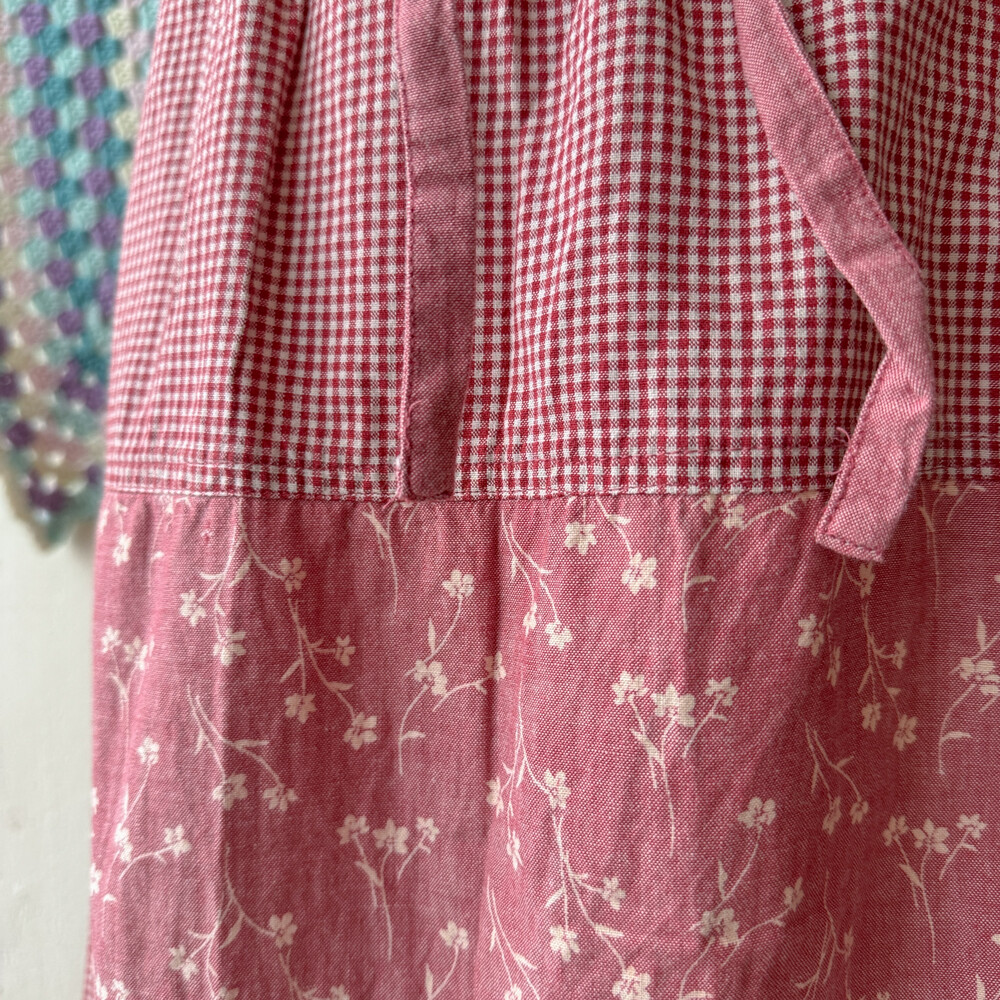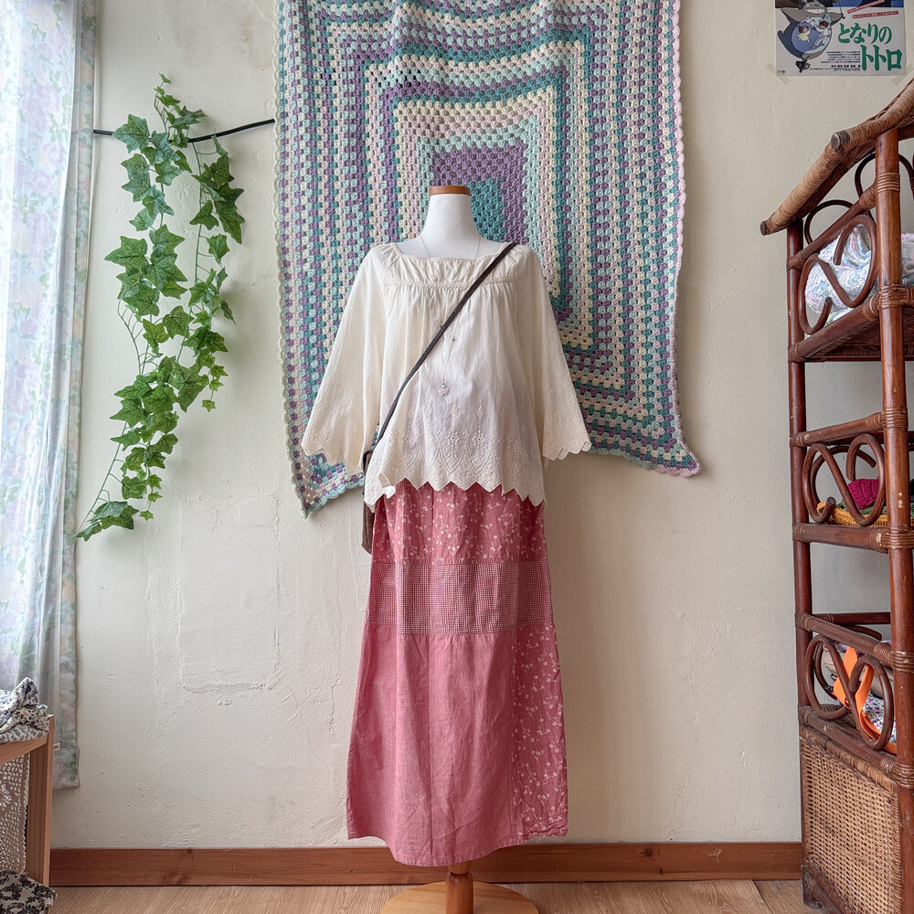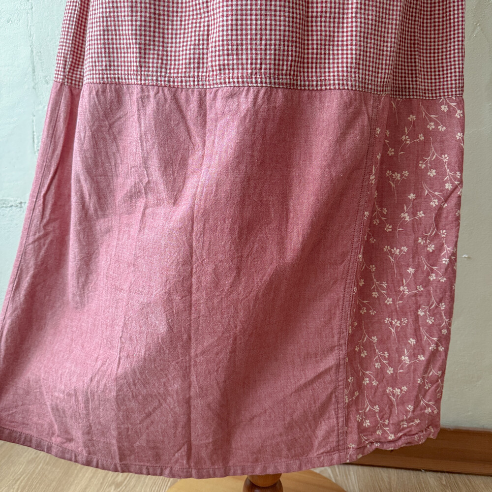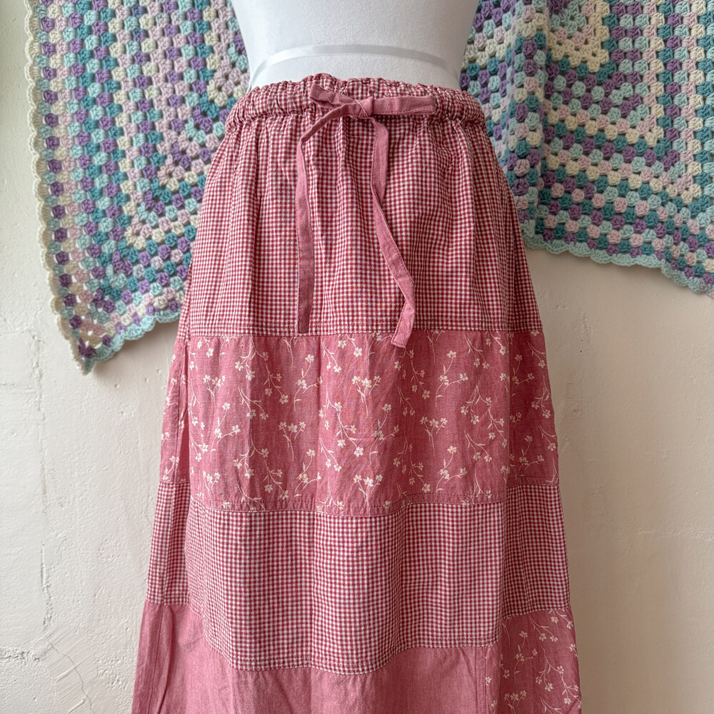 인디핑크와 레드 중간 색감의 패치워크 스커트예요
