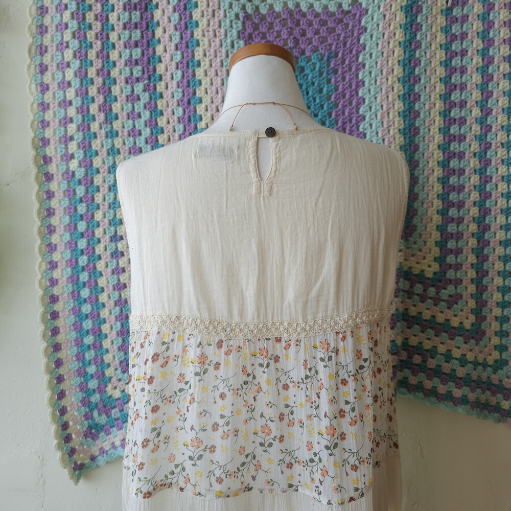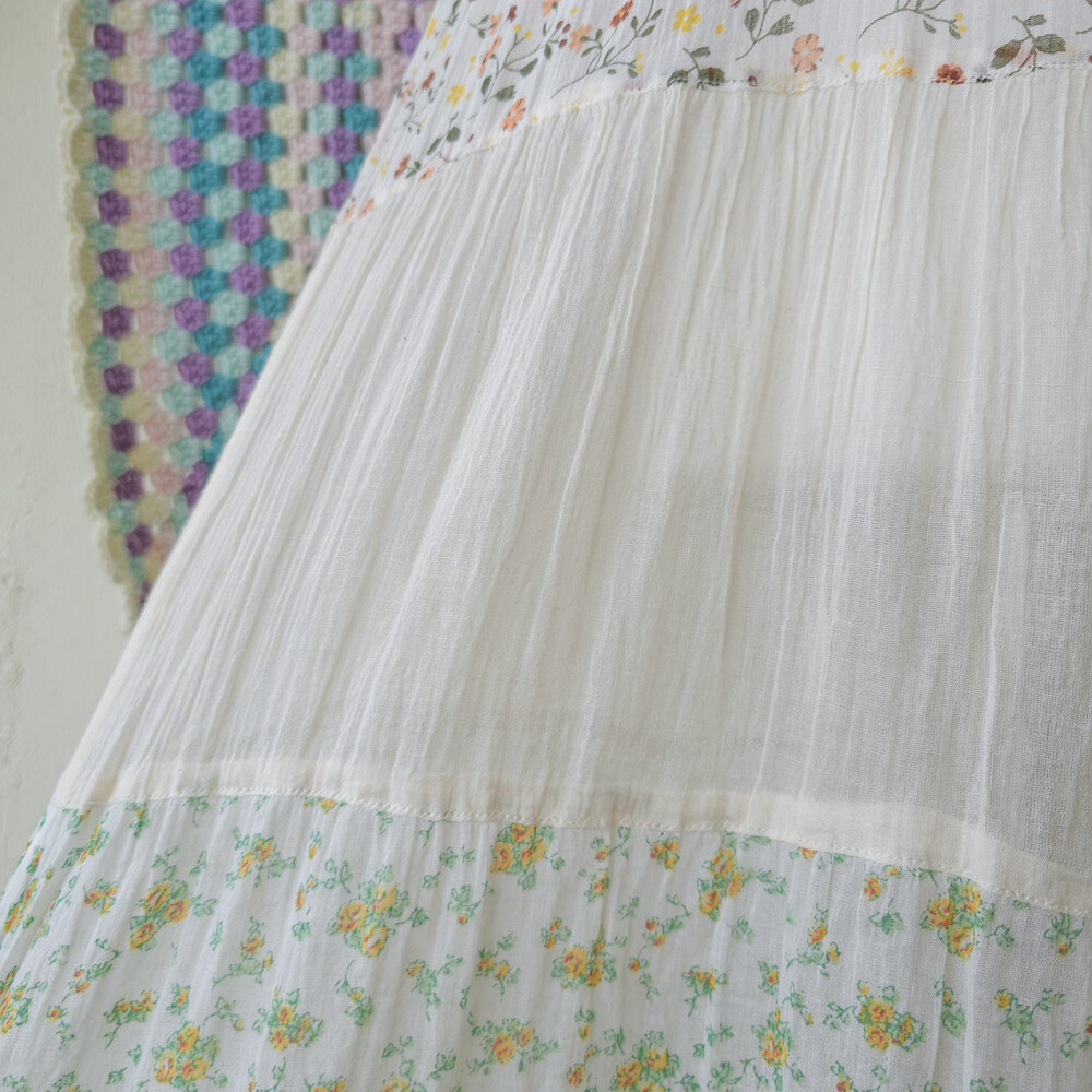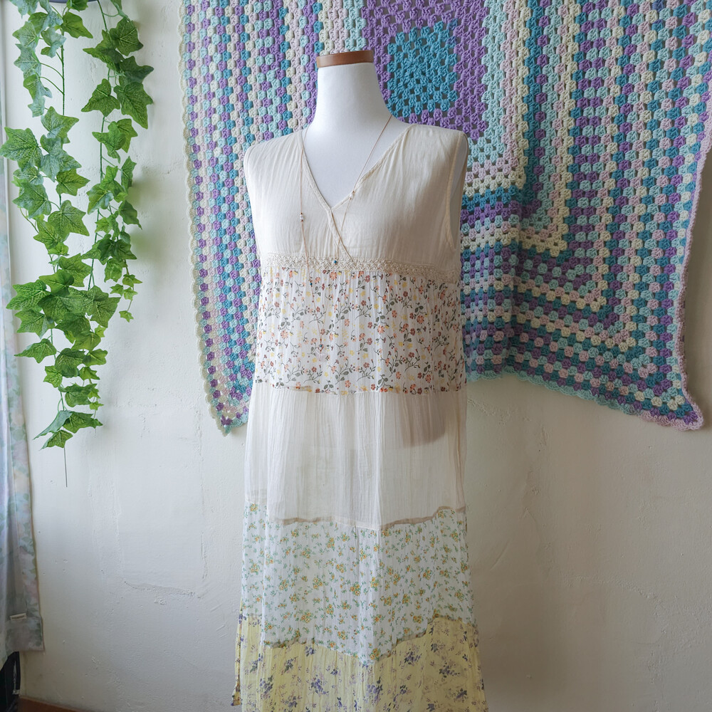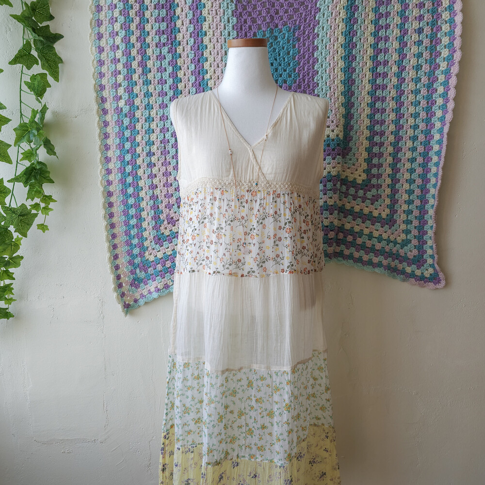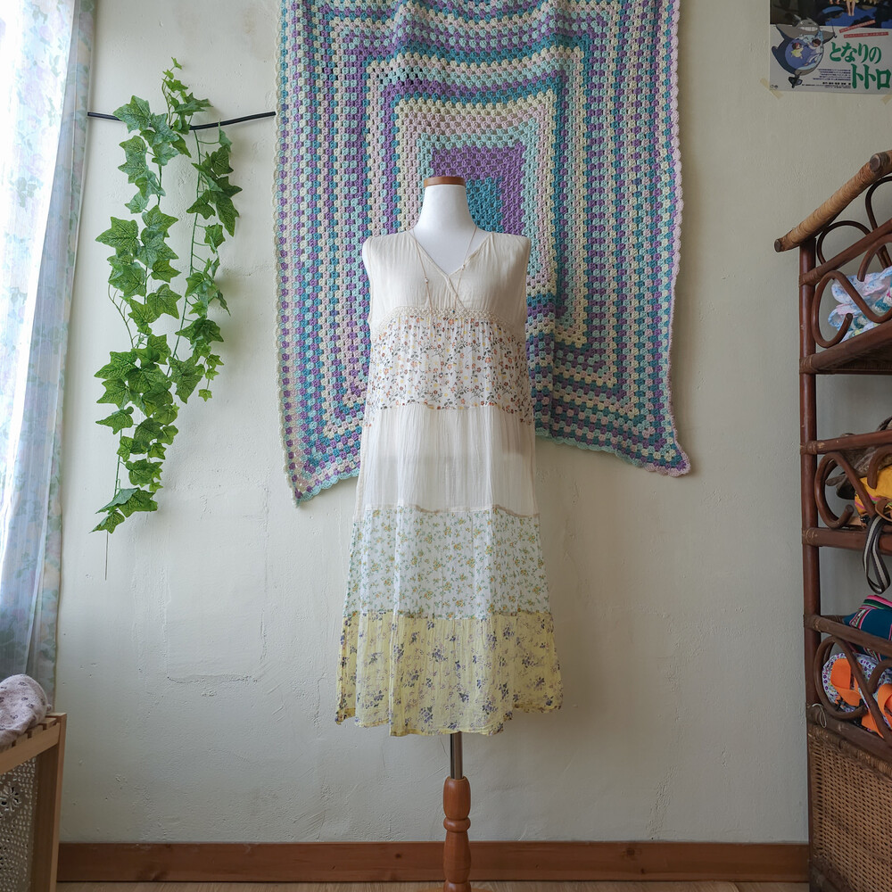 연베이지 색감 베이스의 패치워크 민소매 원피스예요