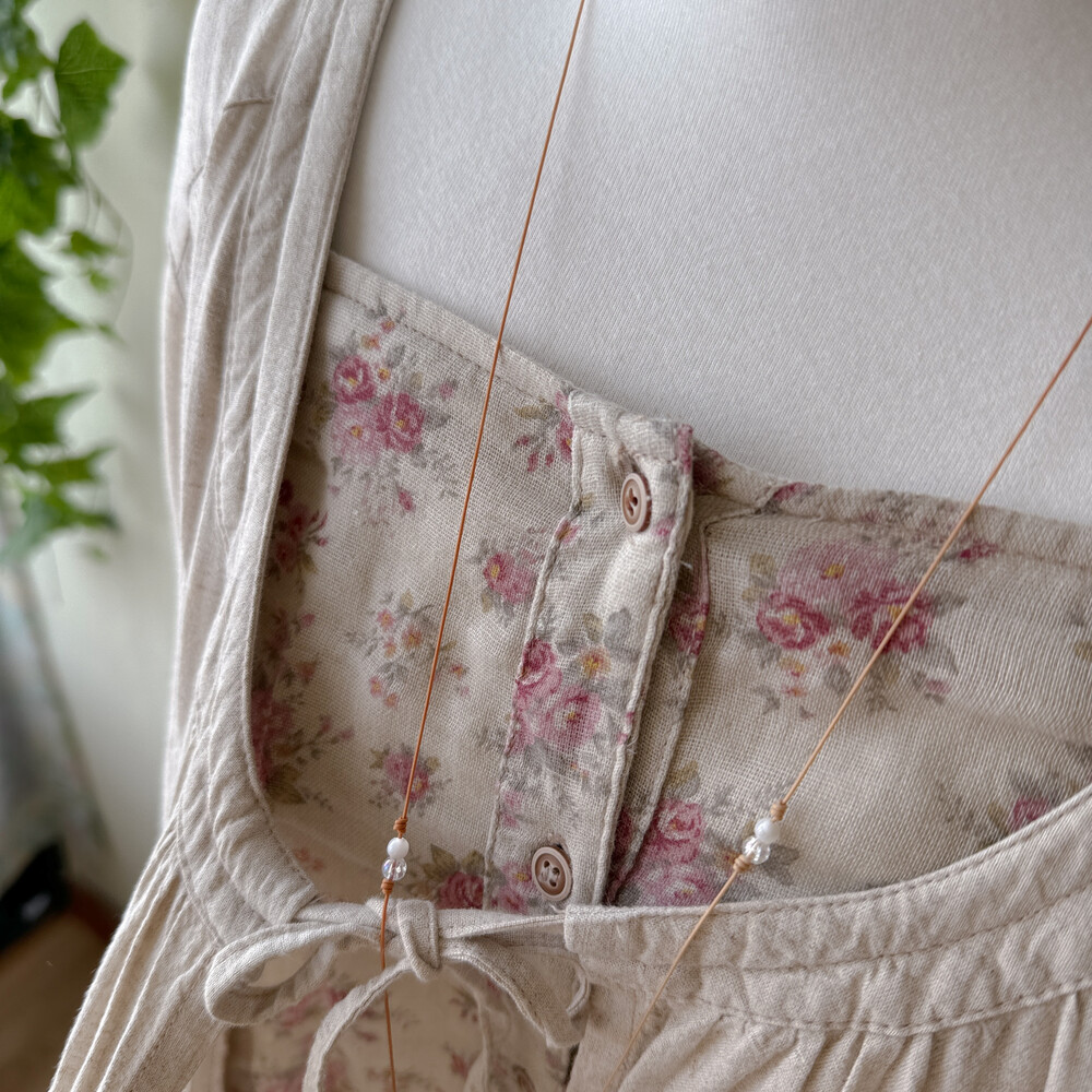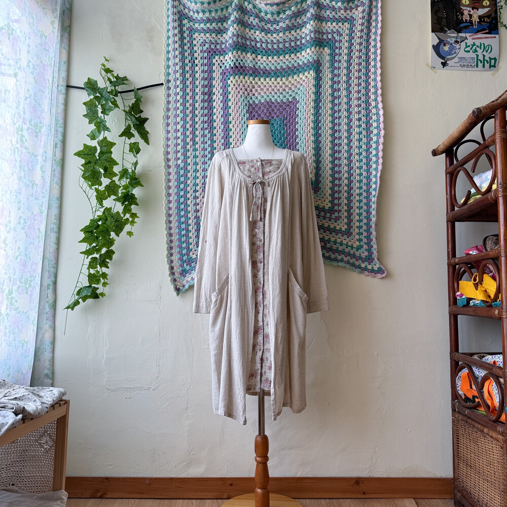 오트밀+핑크 꽃무늬 조합의 바선생 원피스예요