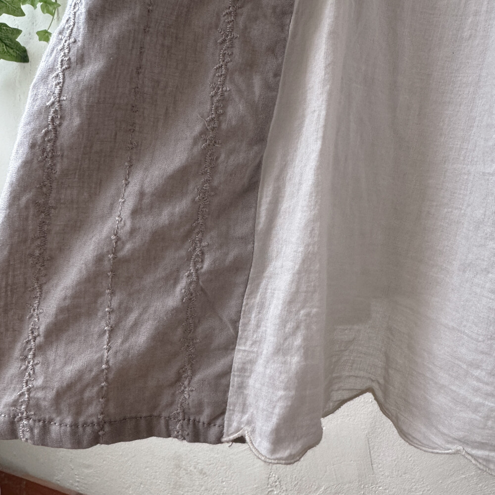 앞 절개 디자인에 오트밀색 천이 패치로 덧대어져 있어서