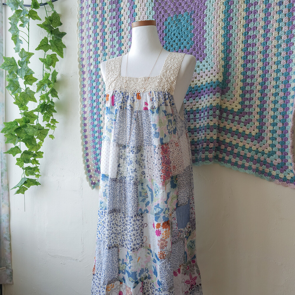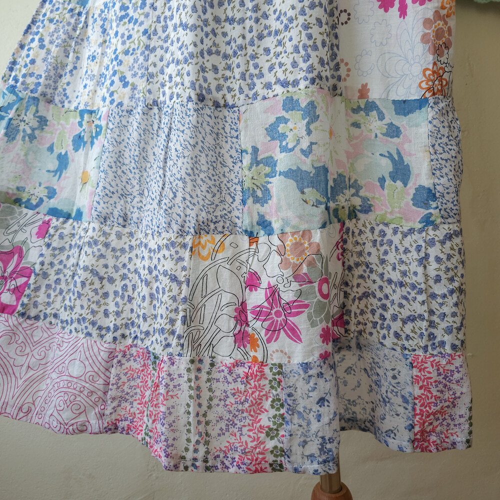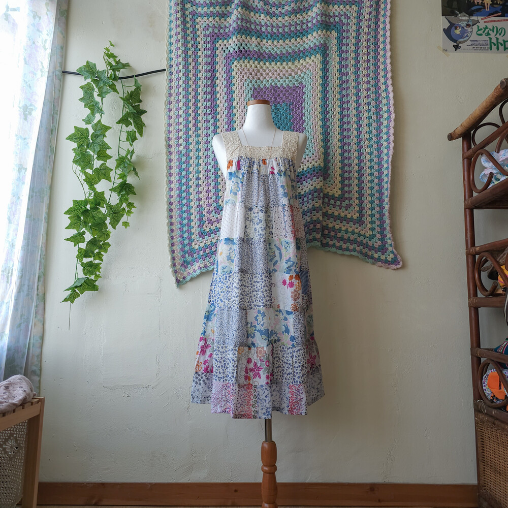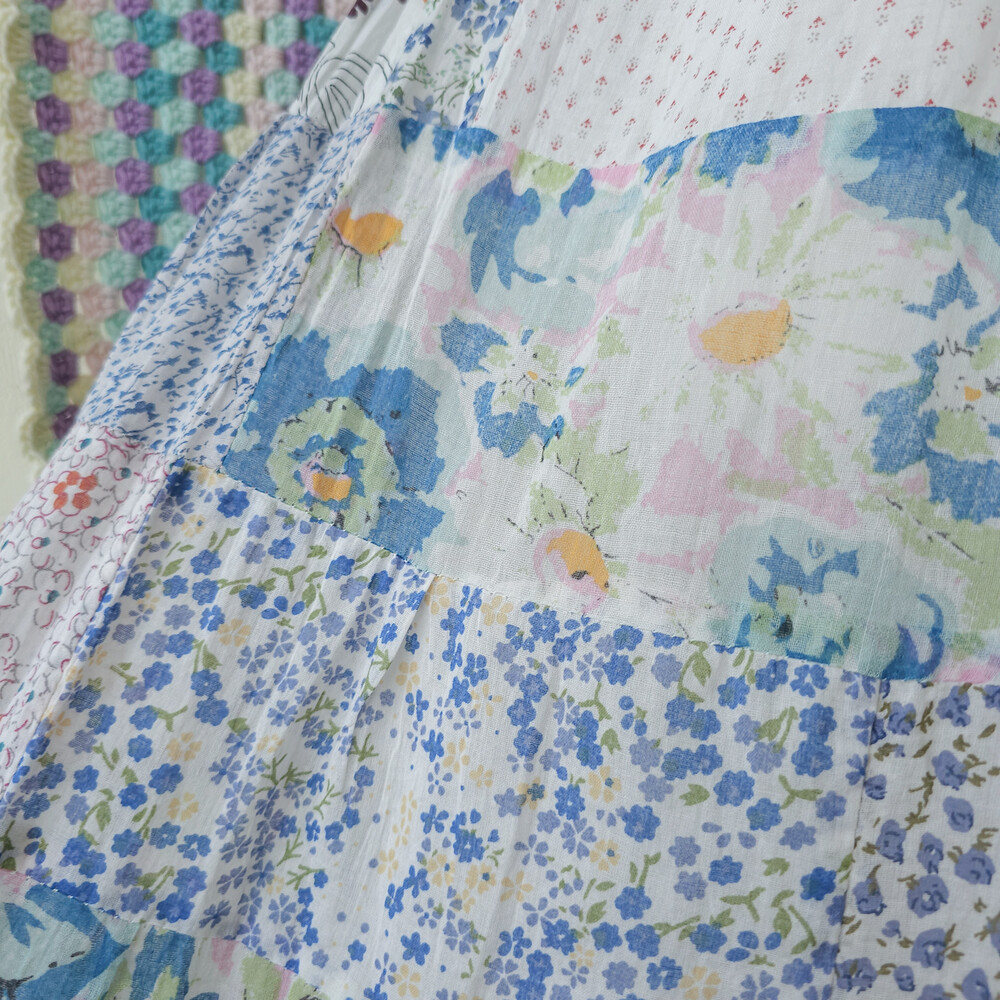 쿨한 색감의 블루, 핑크 조합의 패치워크 원피스예요