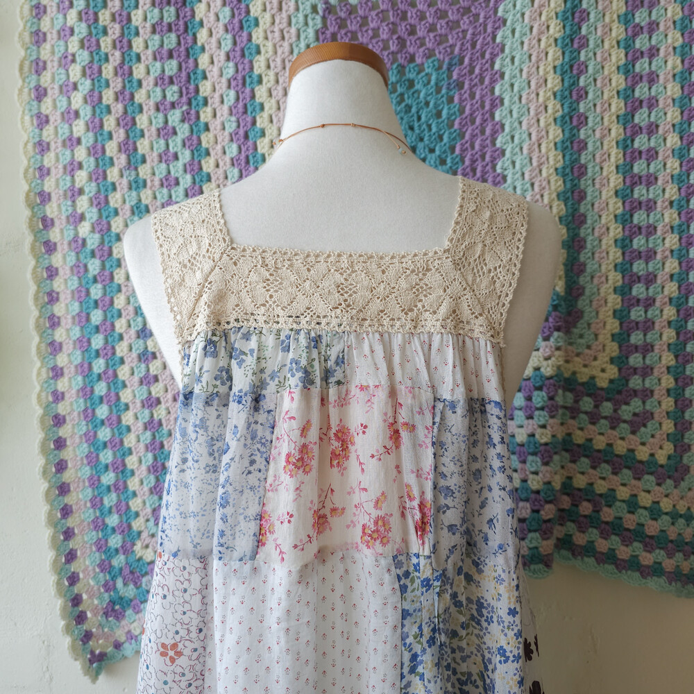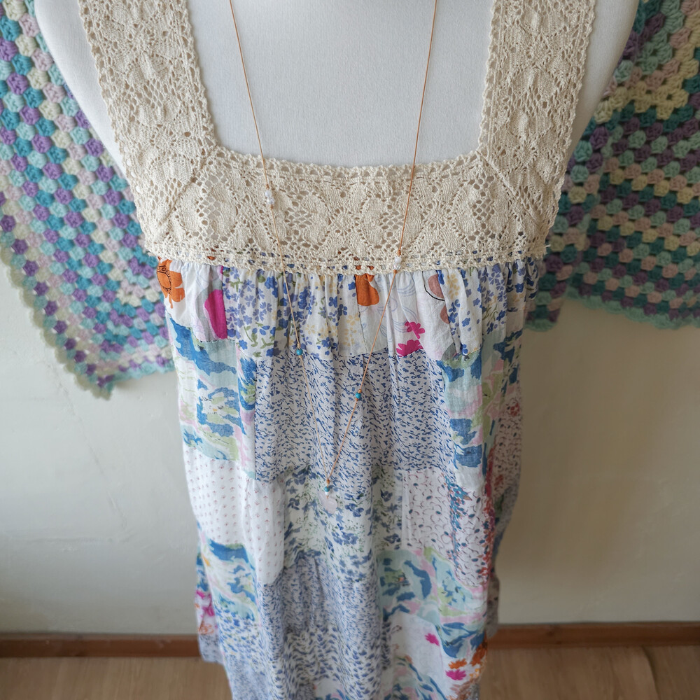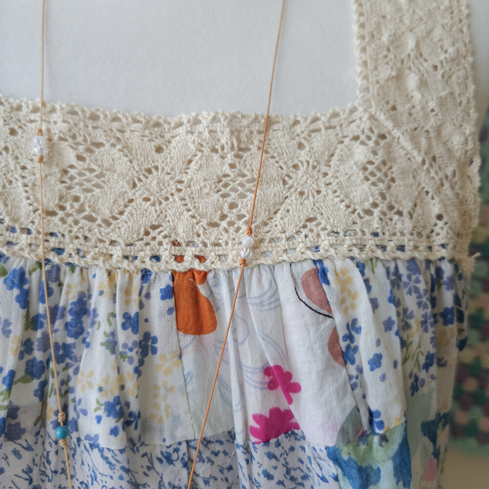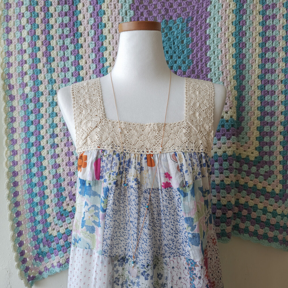 쿨한 색감의 블루, 핑크 조합의 패치워크 원피스예요