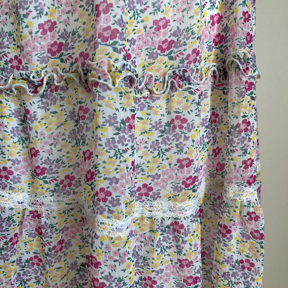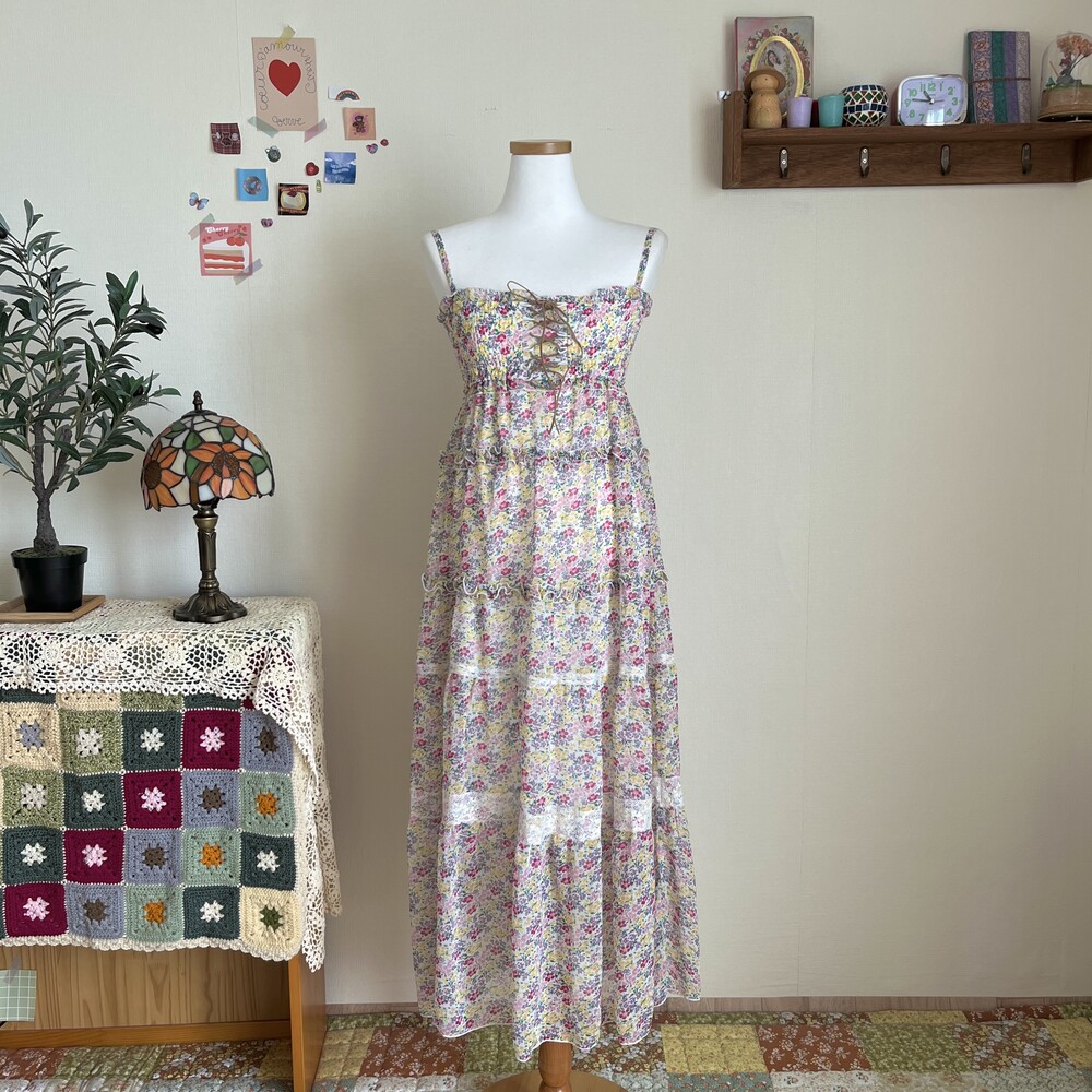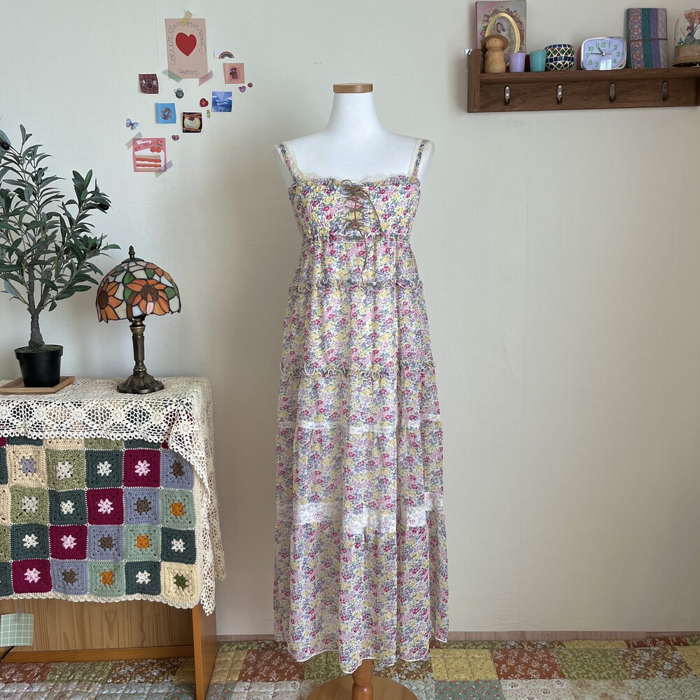 보라 분홍 잔꽃 패턴의 아일렛 쉬폰 끈원피스예요