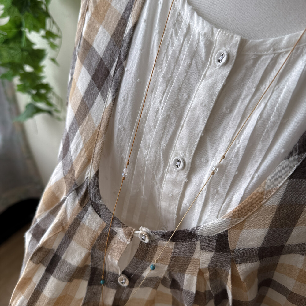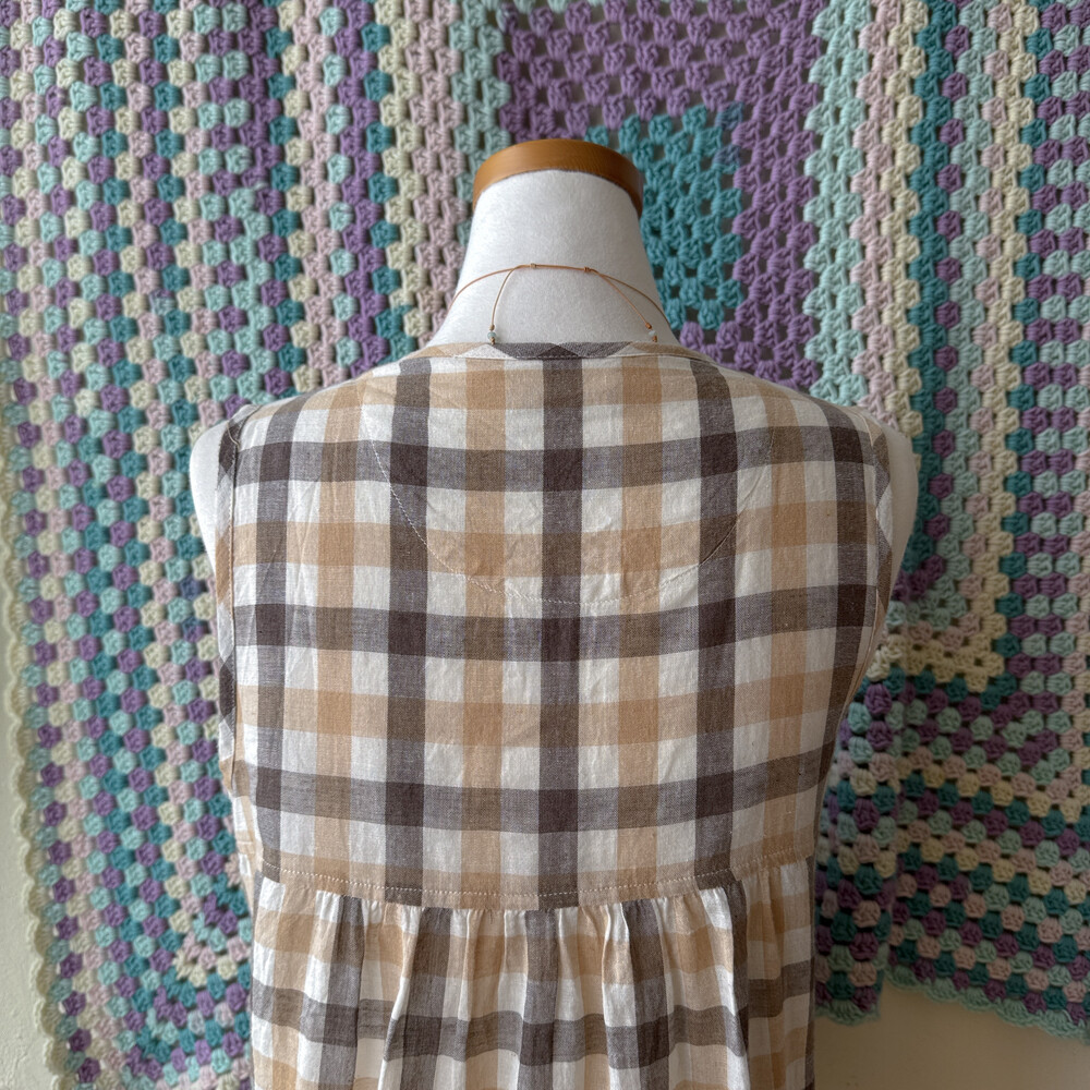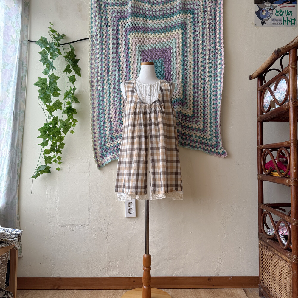 브라운 체크 패턴의 민소매 바선생 원피스예요