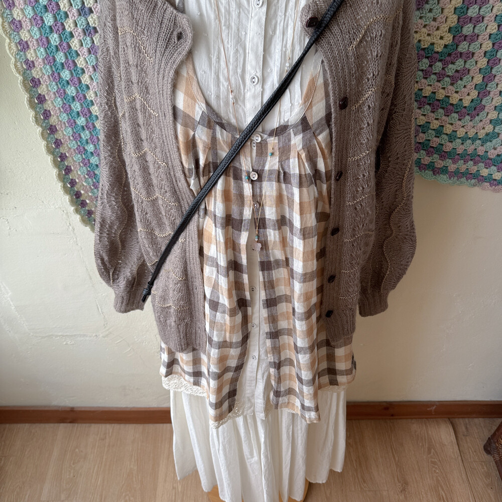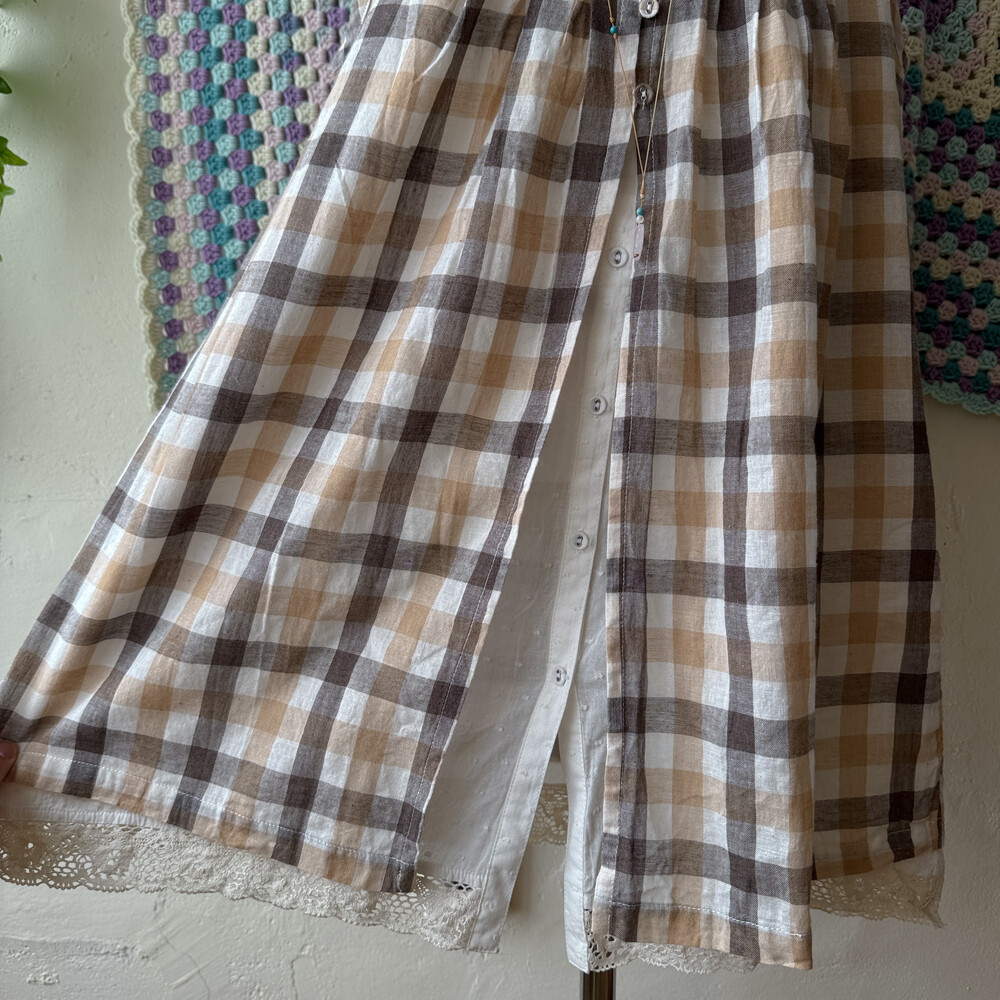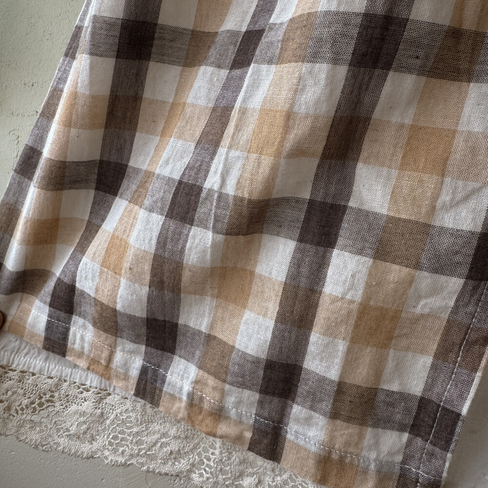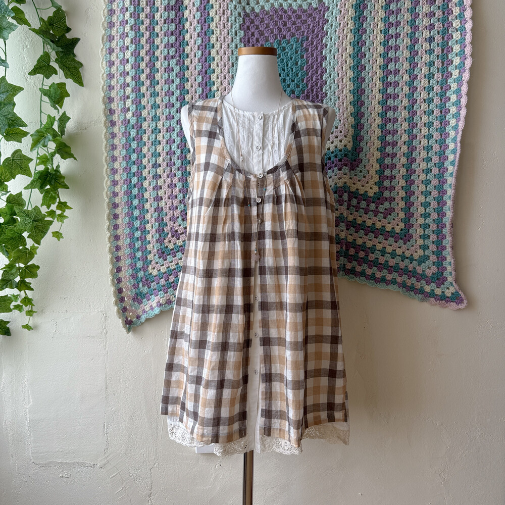 브라운 체크 패턴의 민소매 바선생 원피스예요