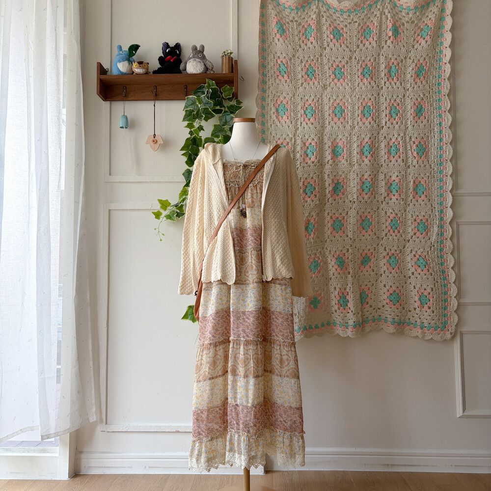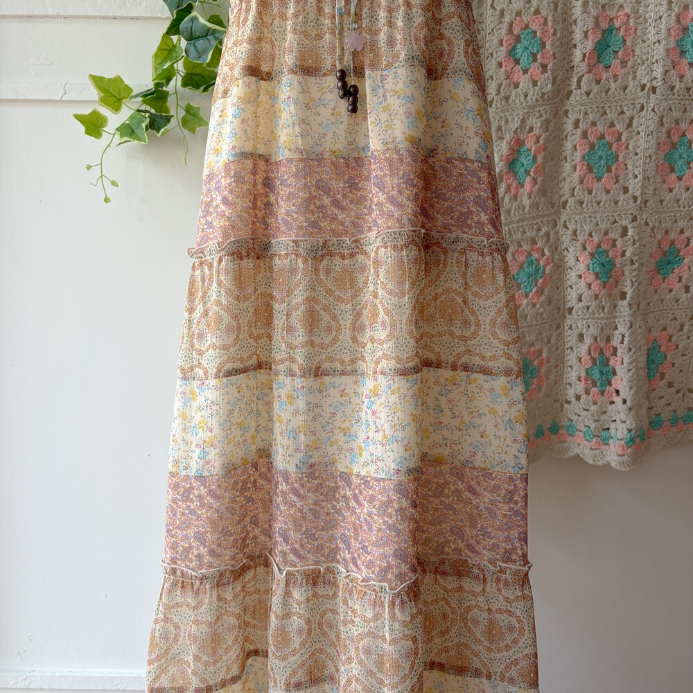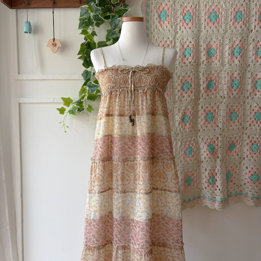 잔잔한 패턴들이 들어간 쉬폰 패치워크 끈원피스예요