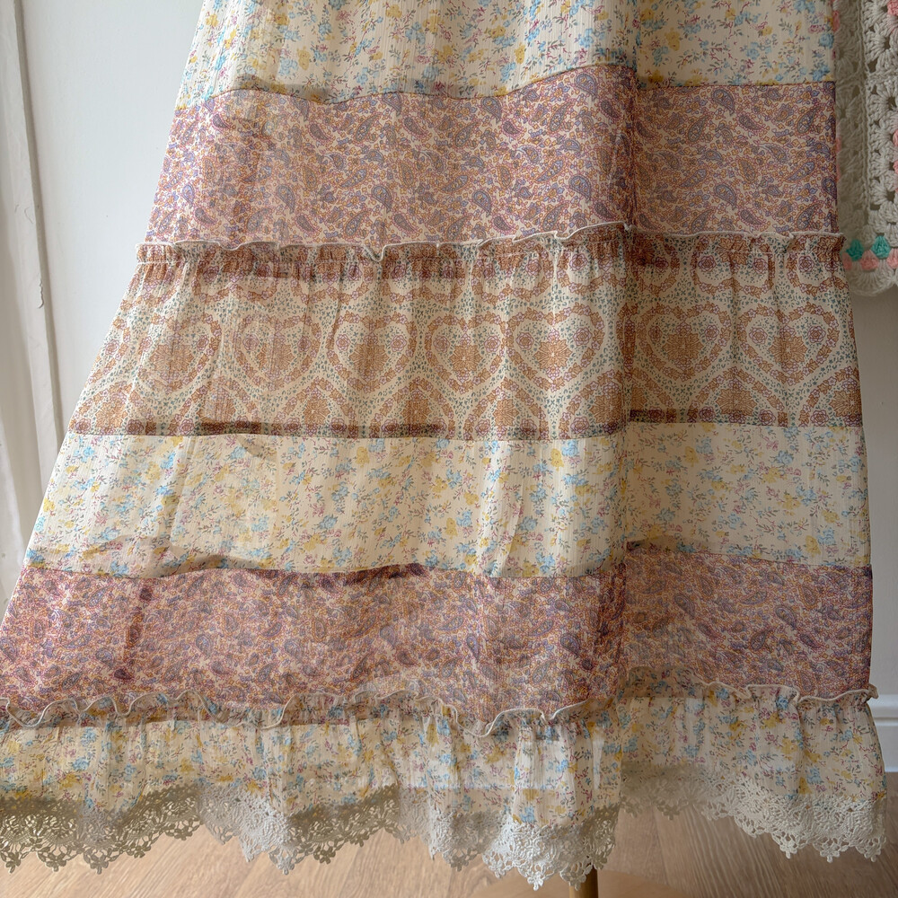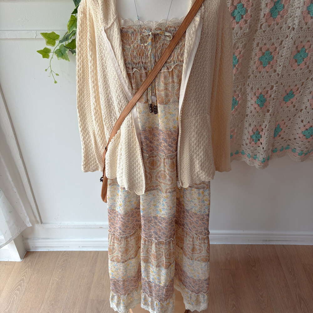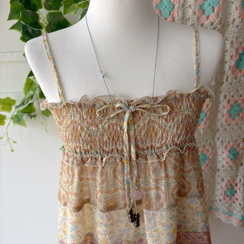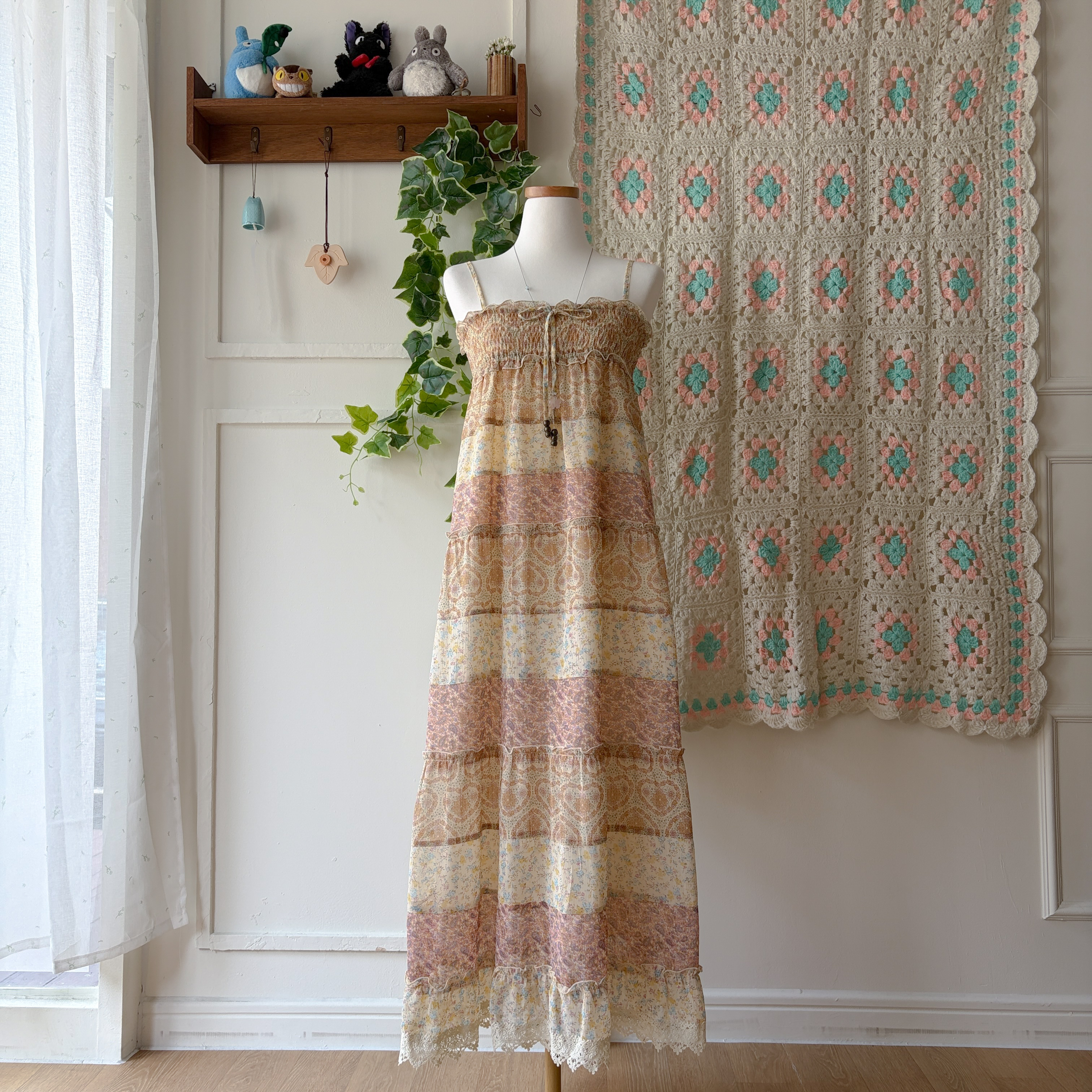 잔잔한 패턴들이 들어간 쉬폰 패치워크 끈원피스예요