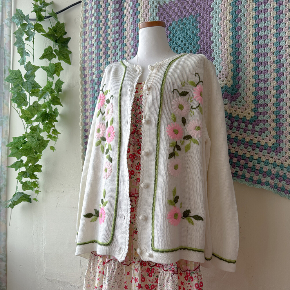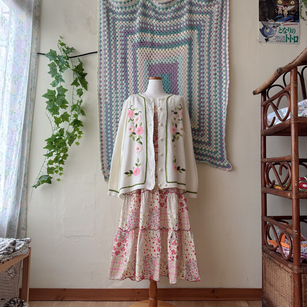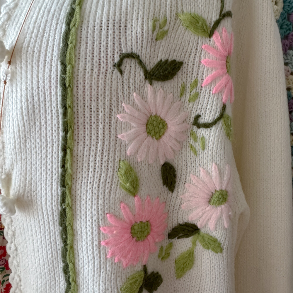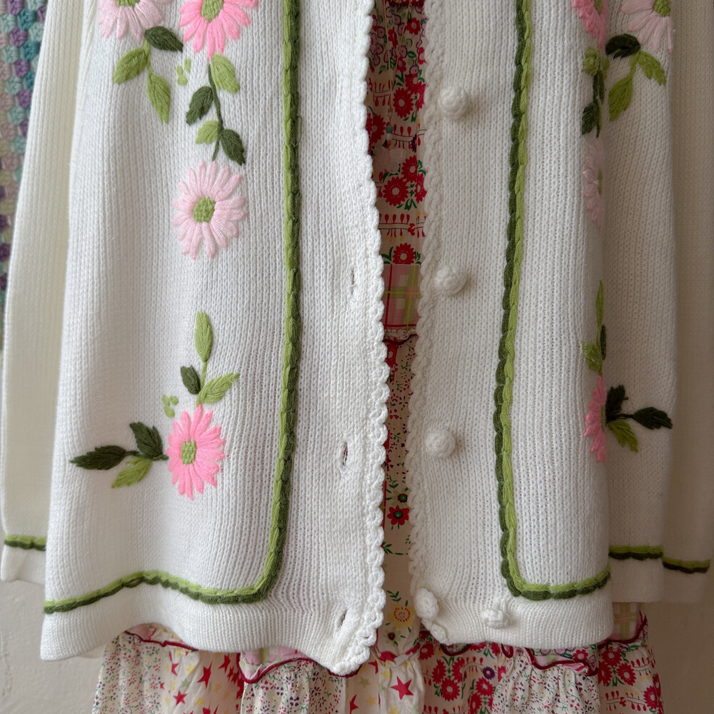 핑크 자수 포인트의 아이보리 가디건이에요