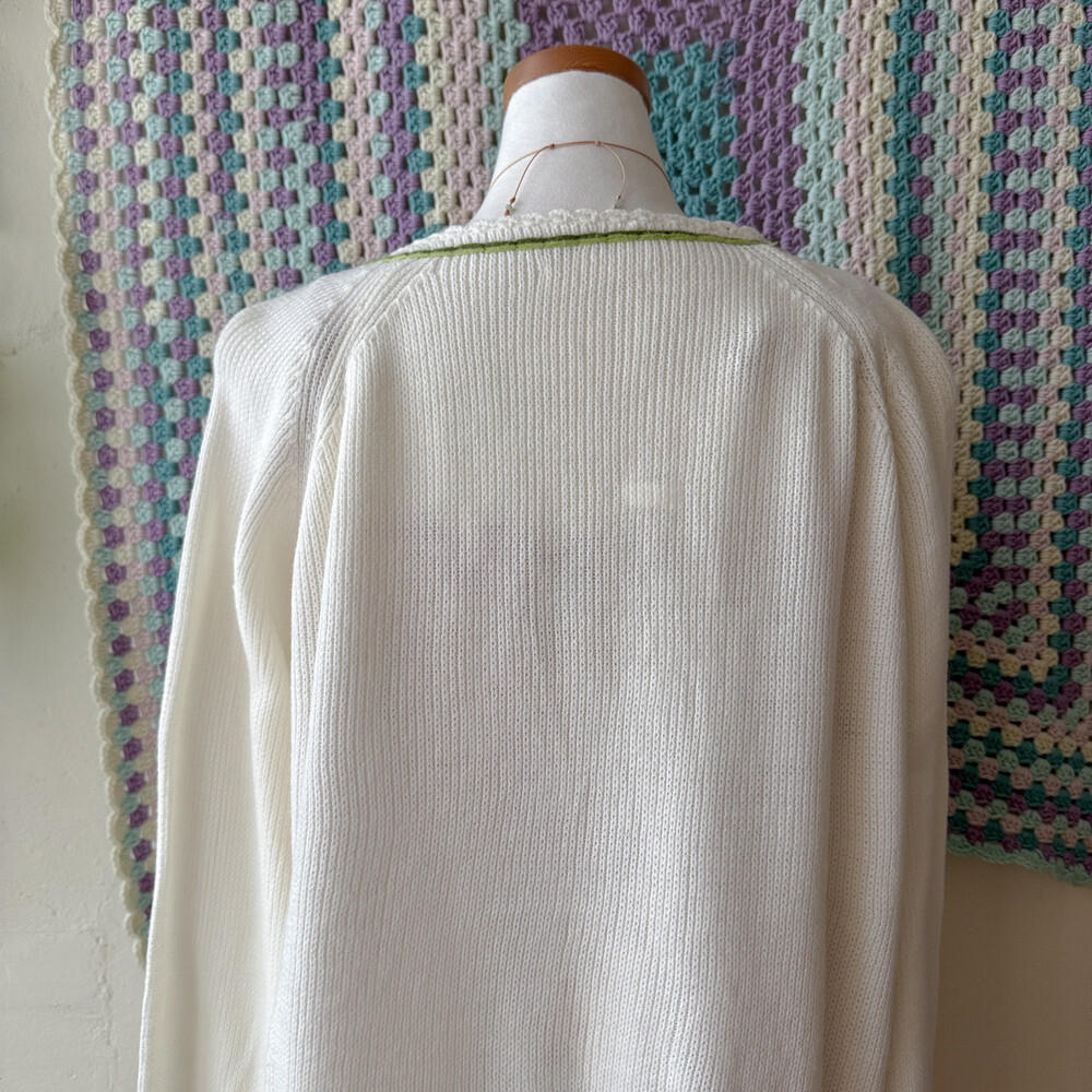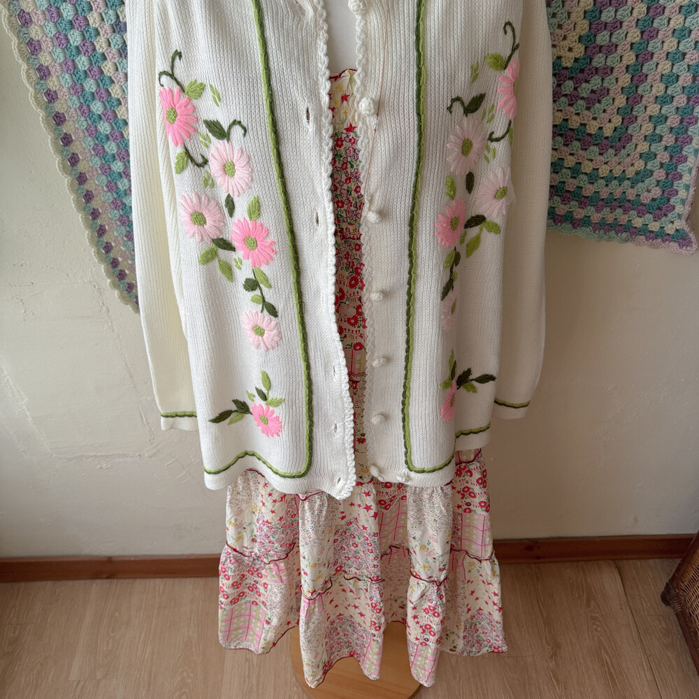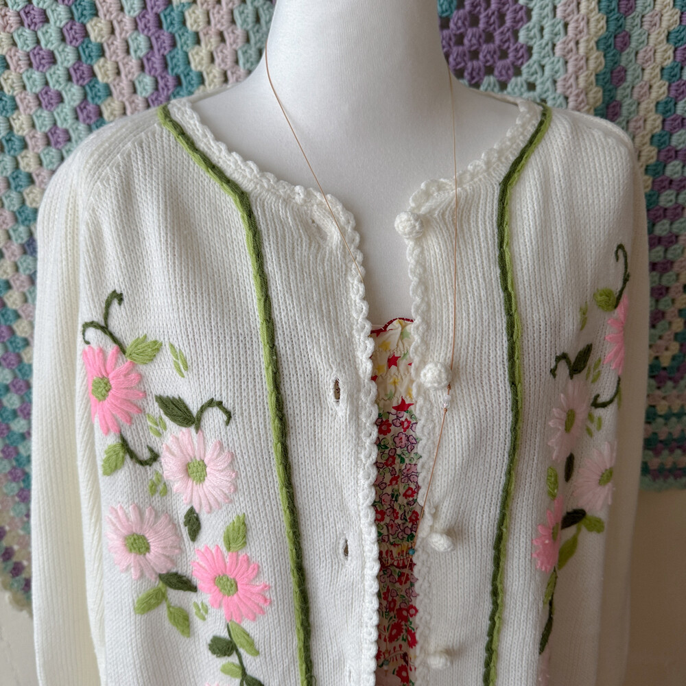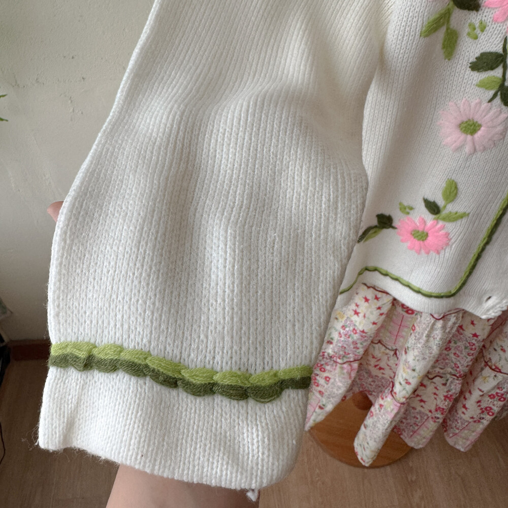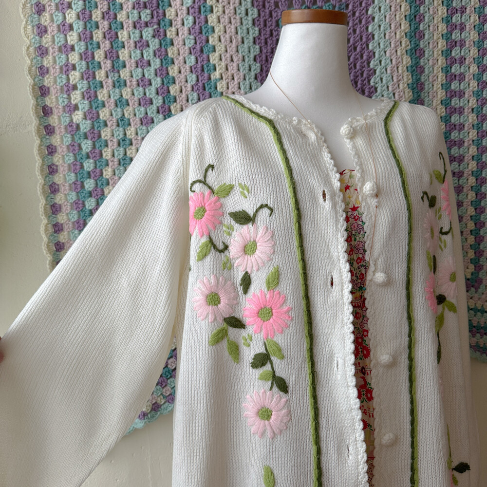 핑크 자수 포인트의 아이보리 가디건이에요