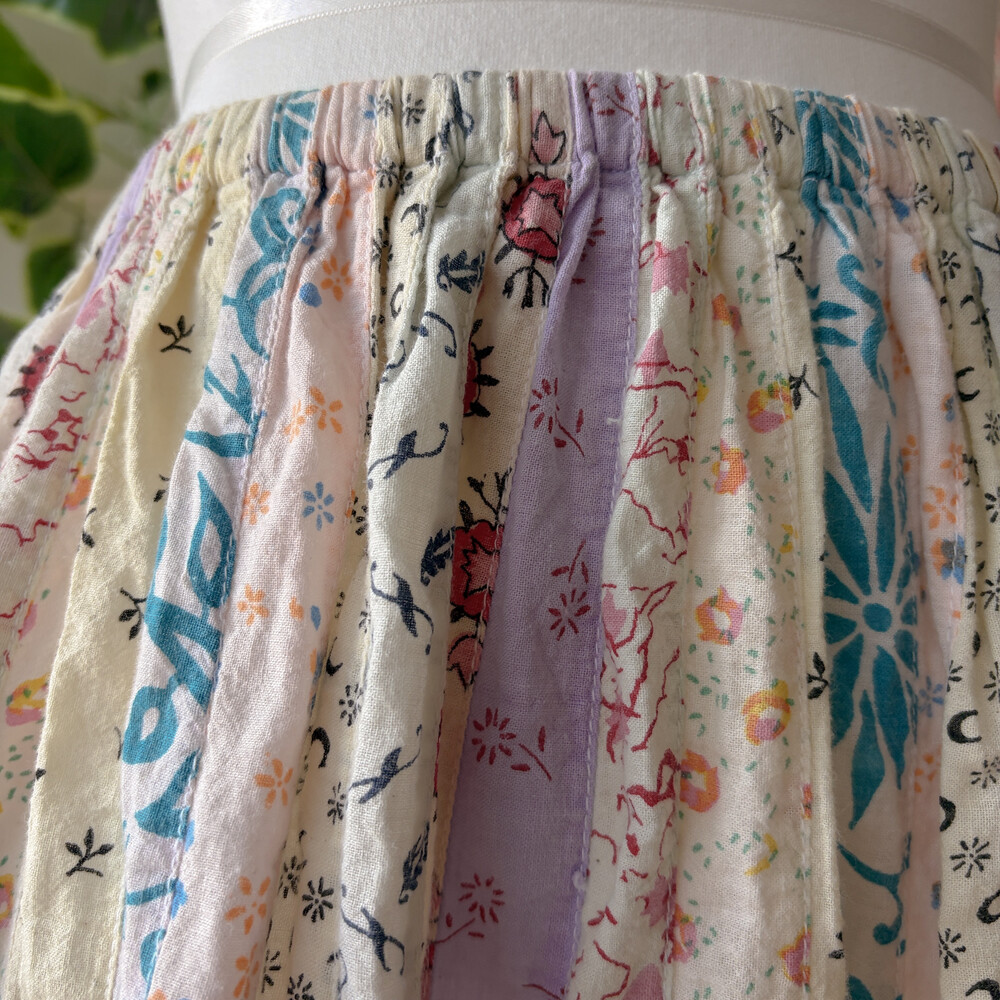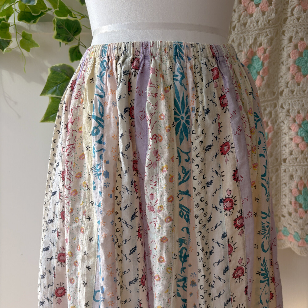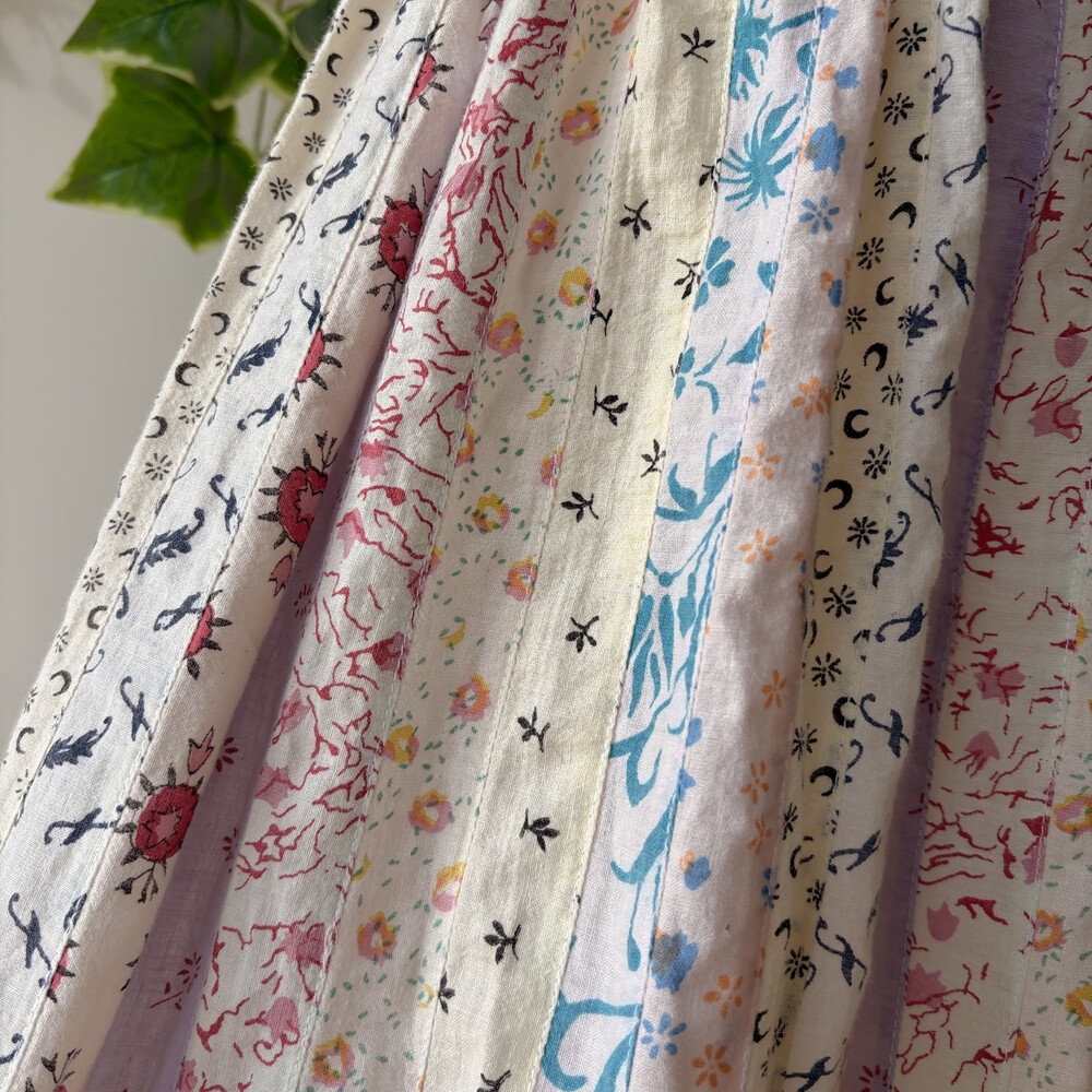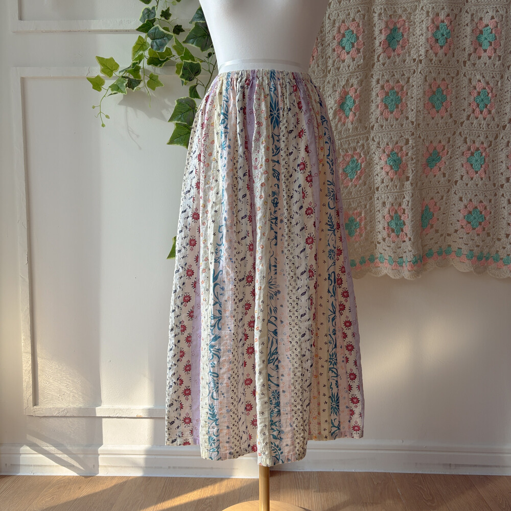 퍼플 색감 베이스의 세로 패치워크 스커트예요