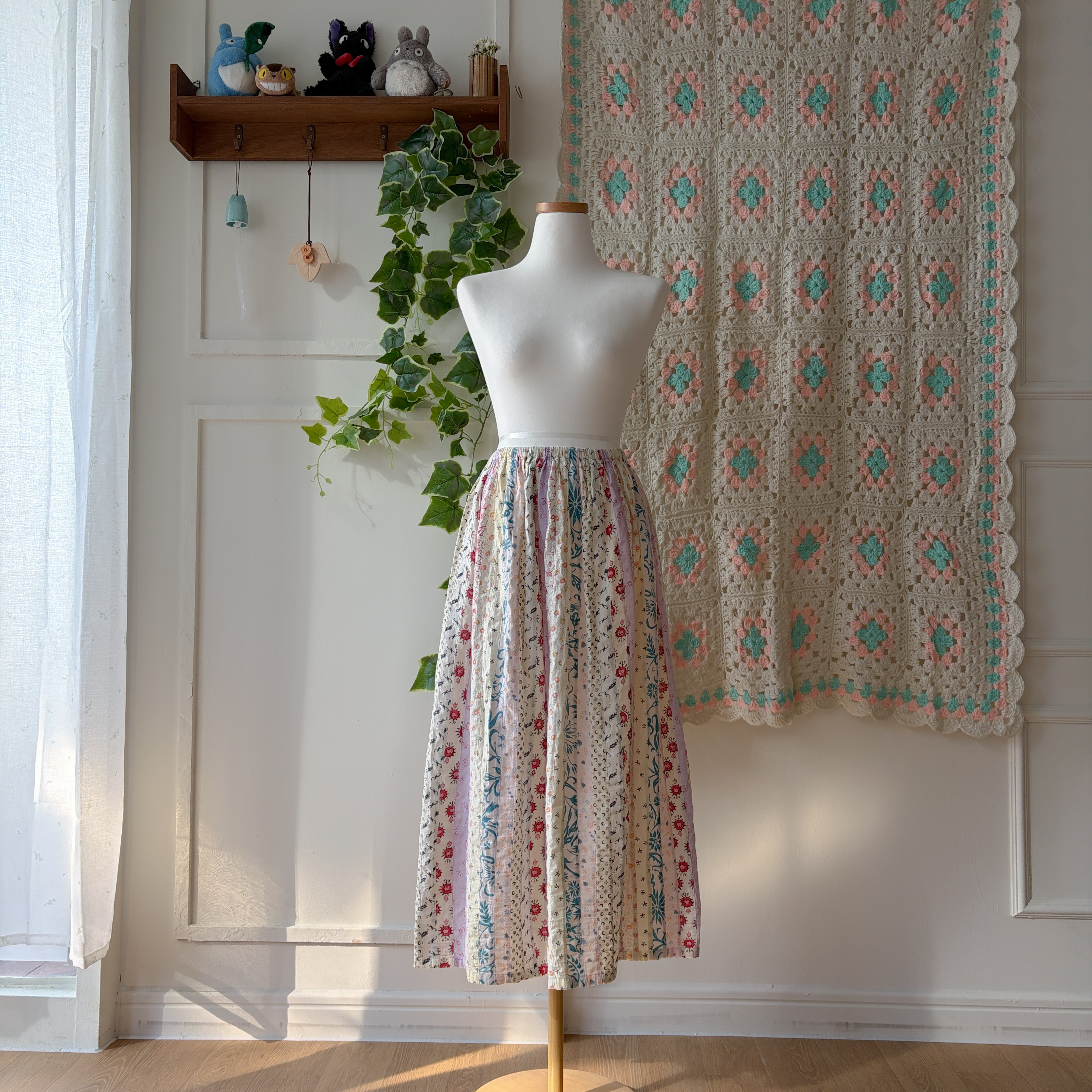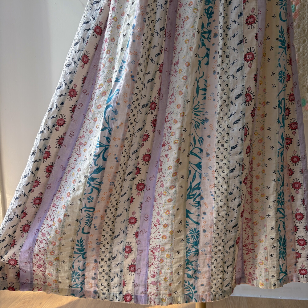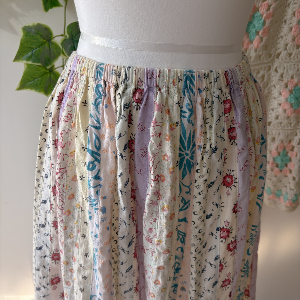 퍼플 색감 베이스의 세로 패치워크 스커트예요