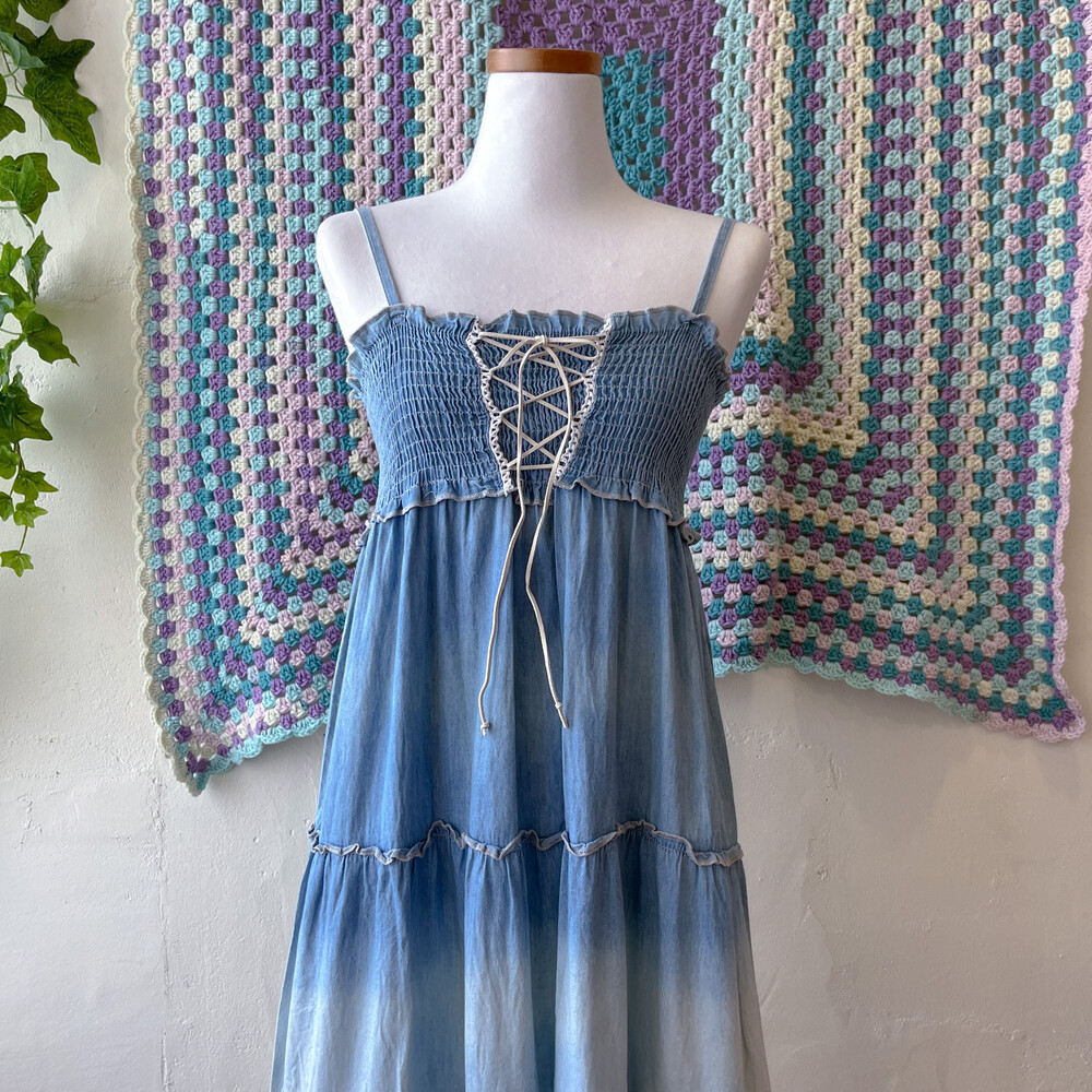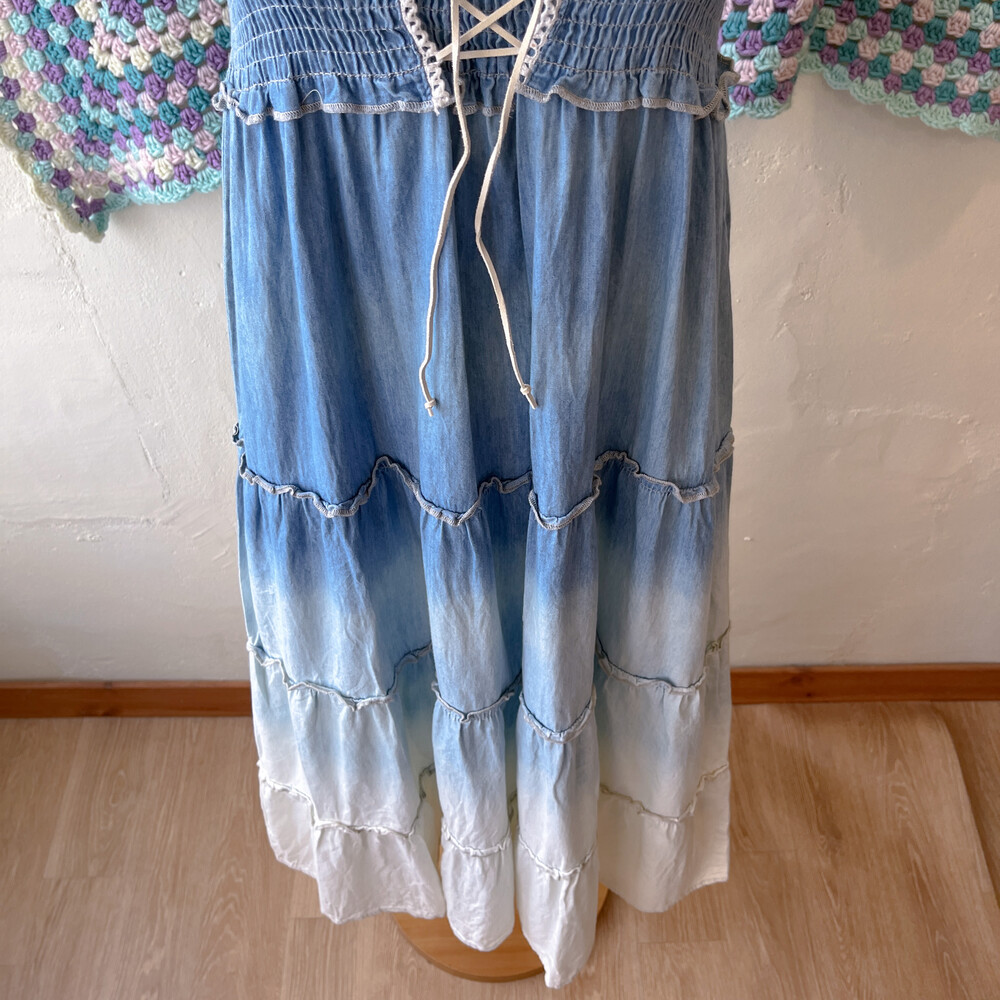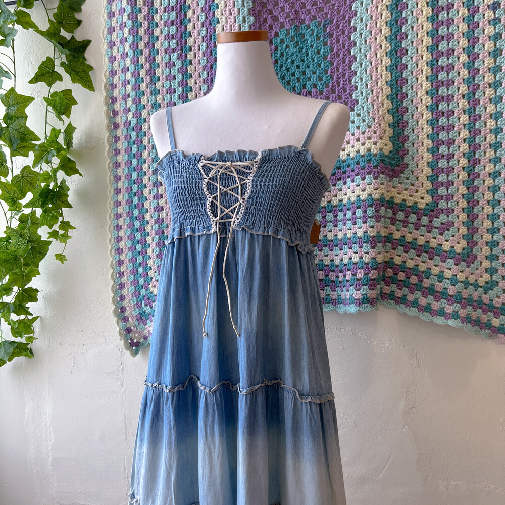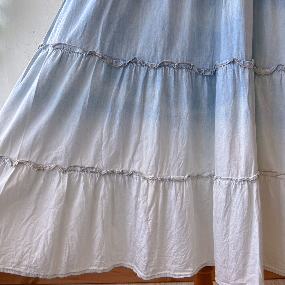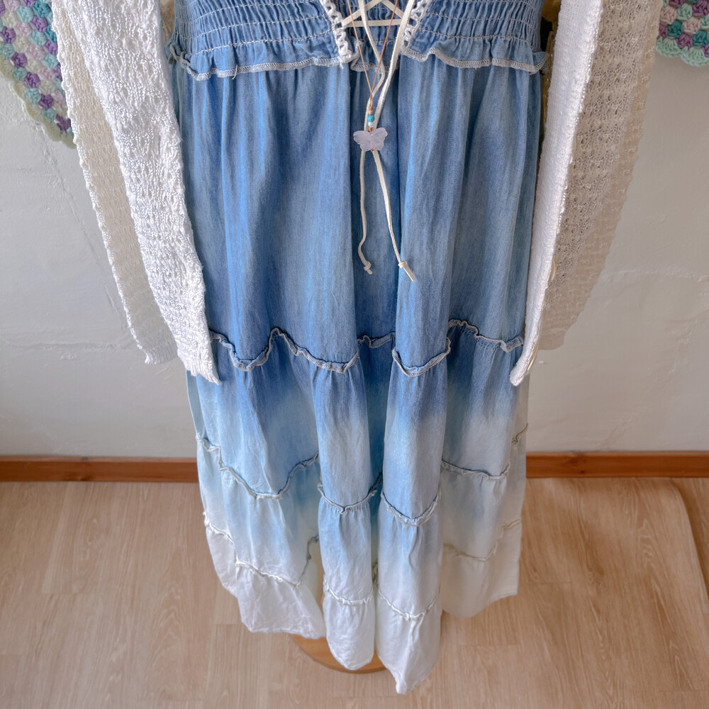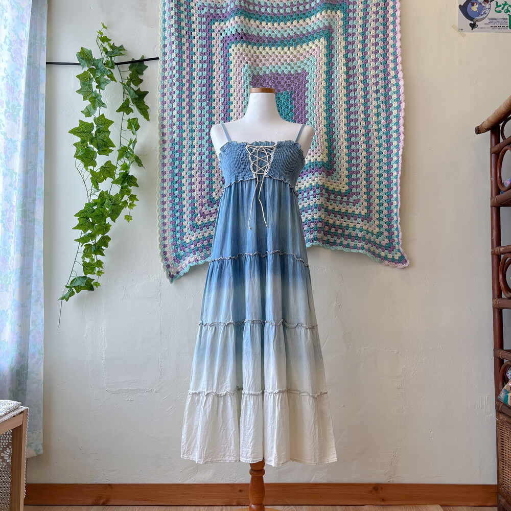 블루 색감의 그라데이션 아일렛 끈원피스예요