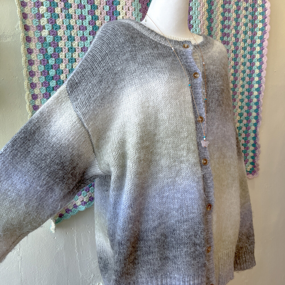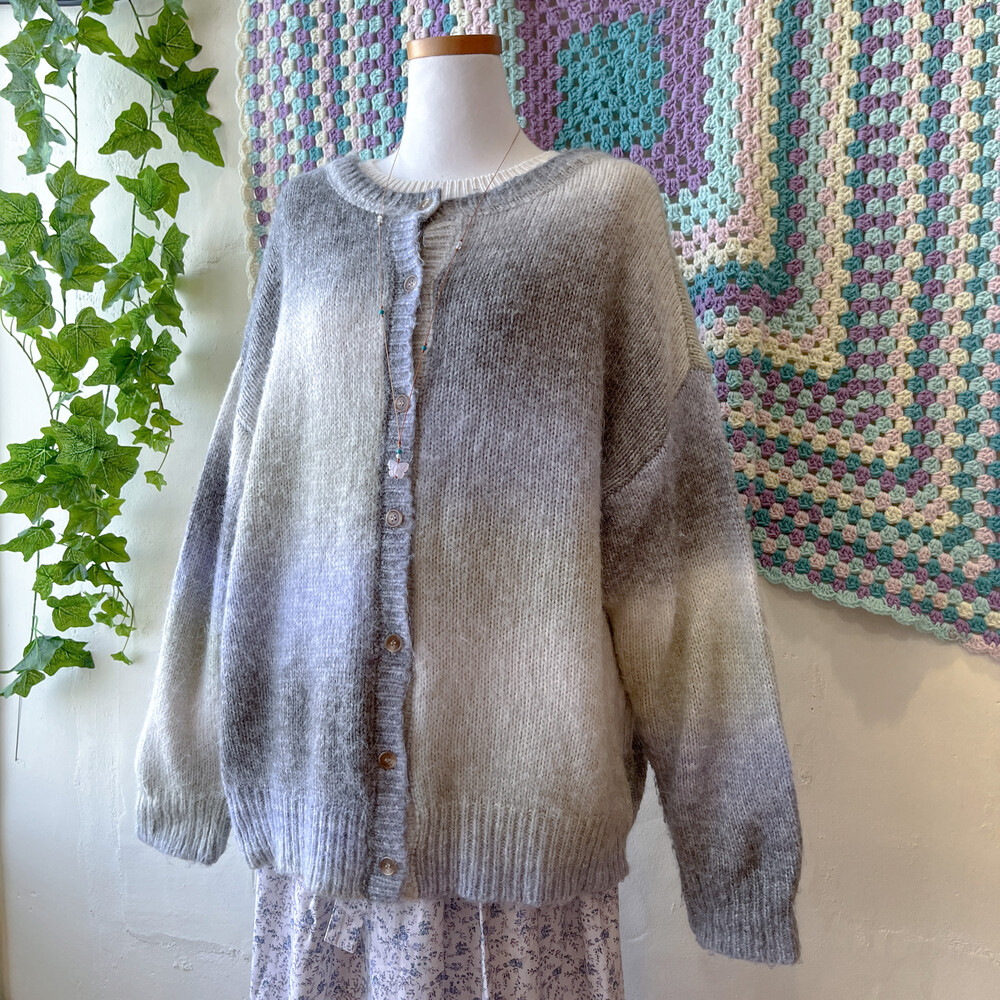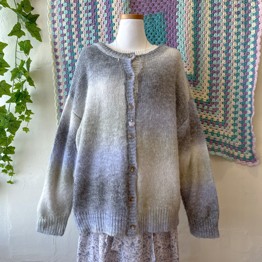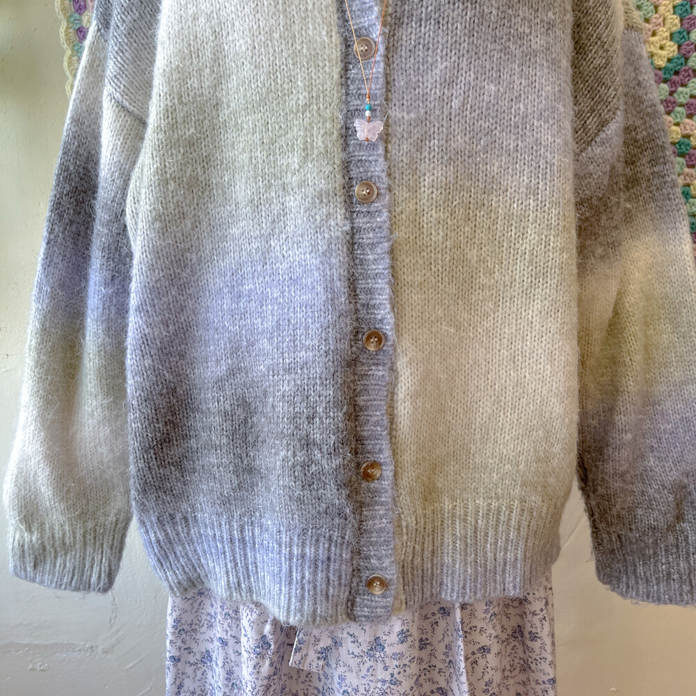 청보라 색감과 블랙 그린이 그라데이션된 오버사이즈 가디건이에요