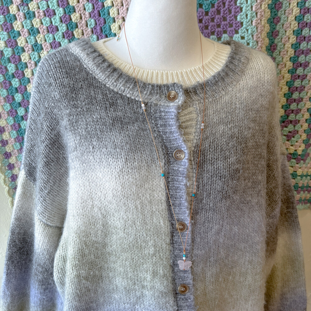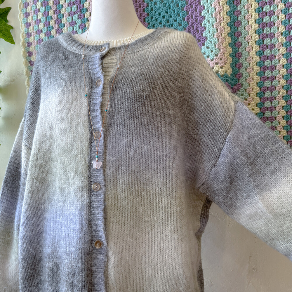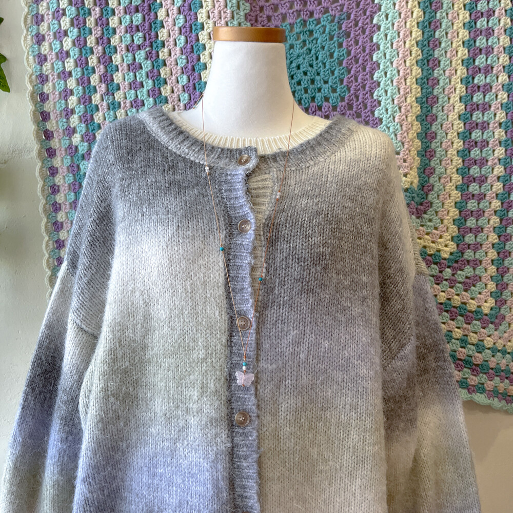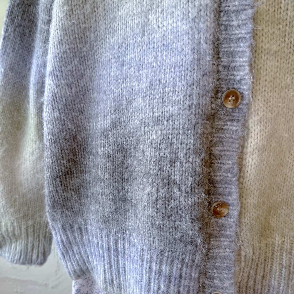 청보라 색감과 블랙 그린이 그라데이션된 오버사이즈 가디건이에요