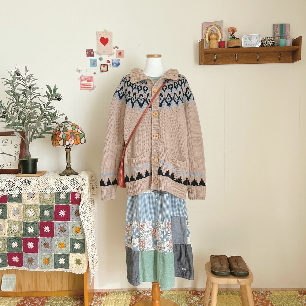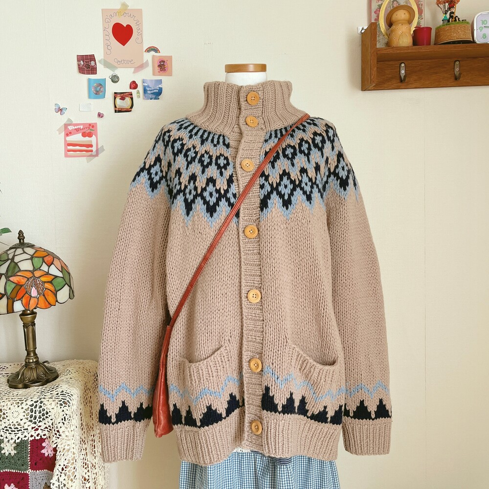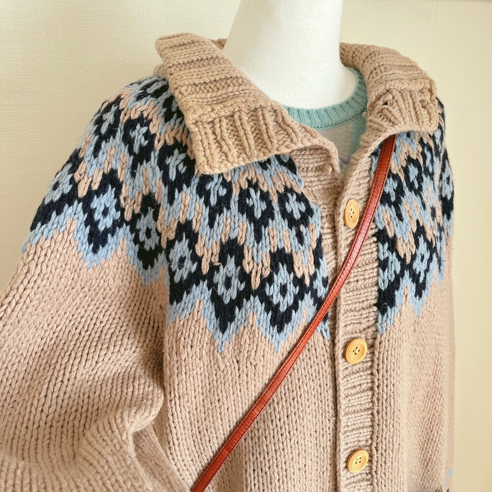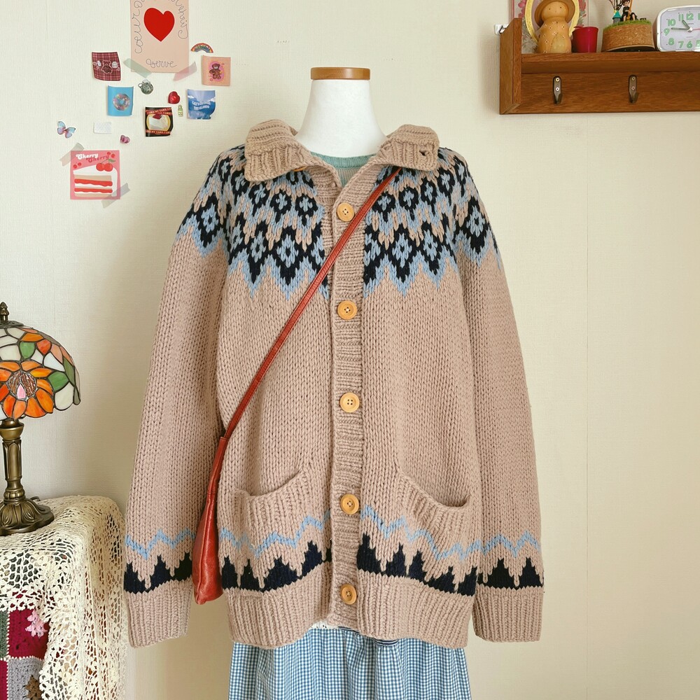 베이지 색감의 노르딕 카라 가디건이에요