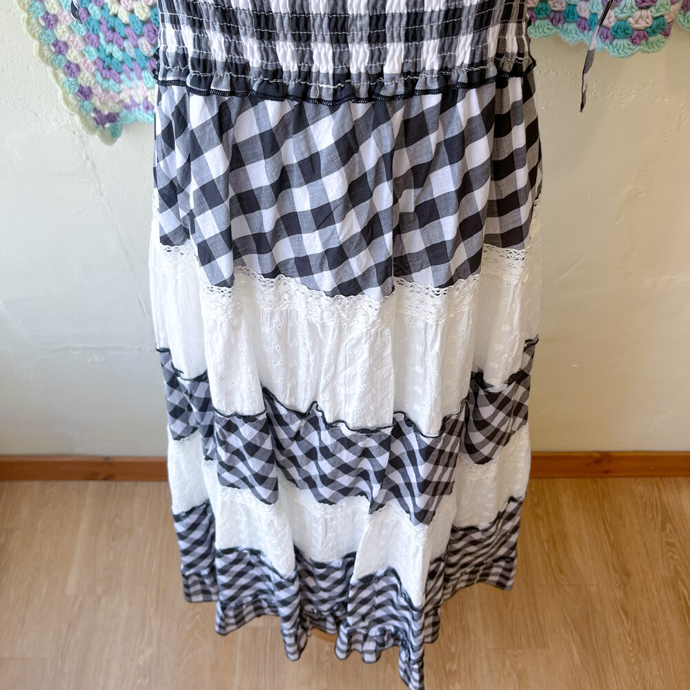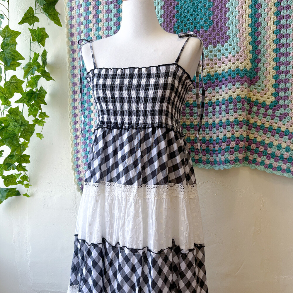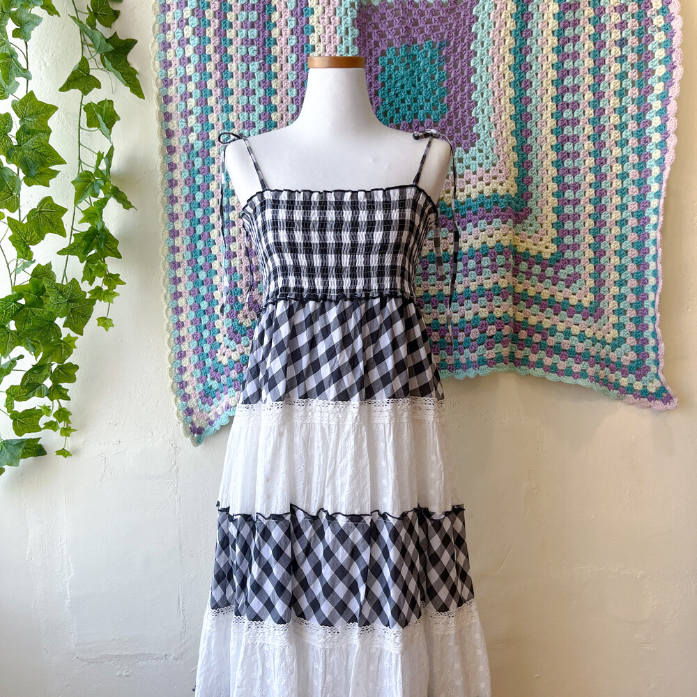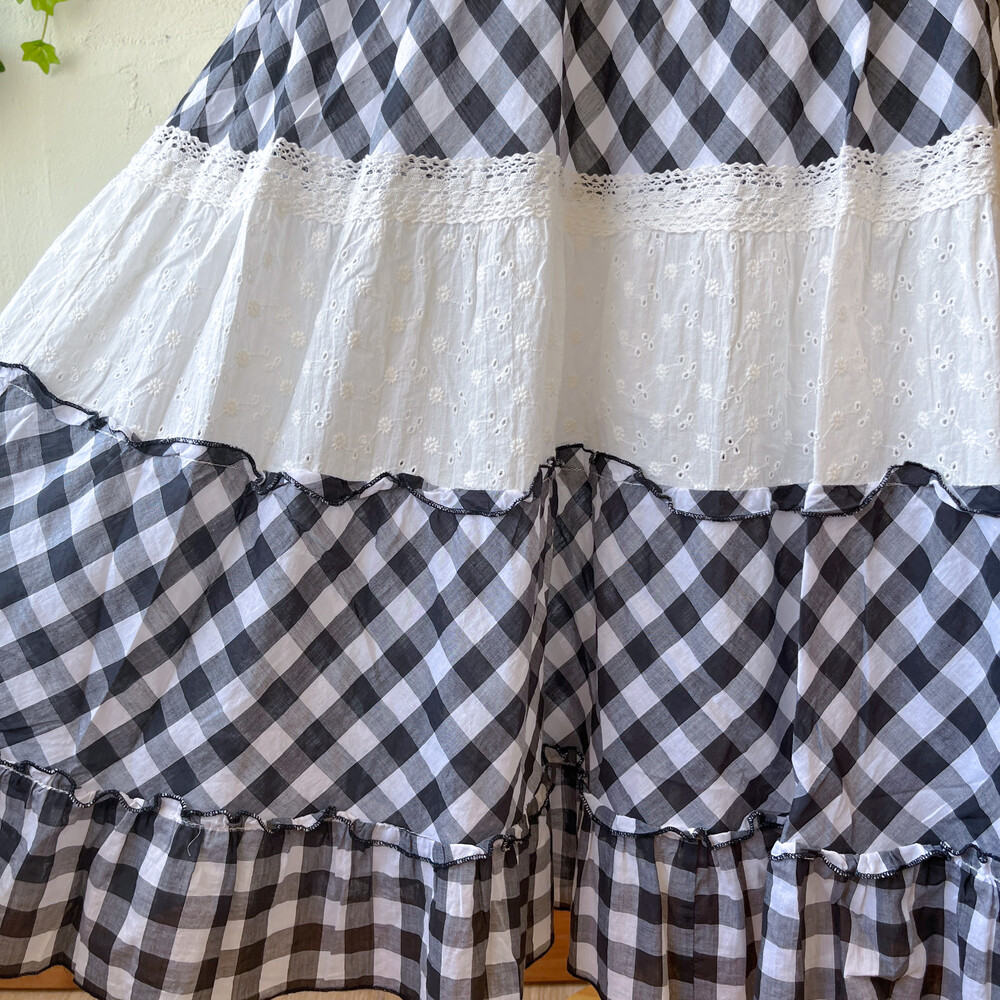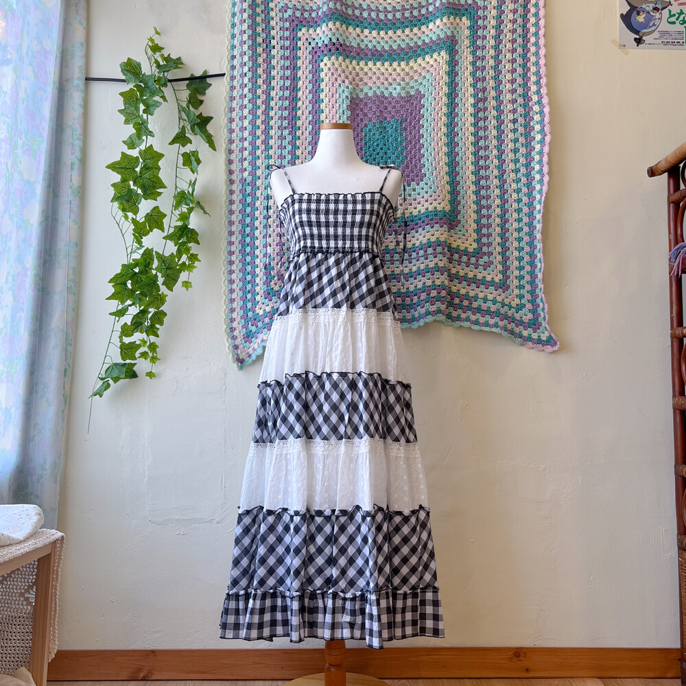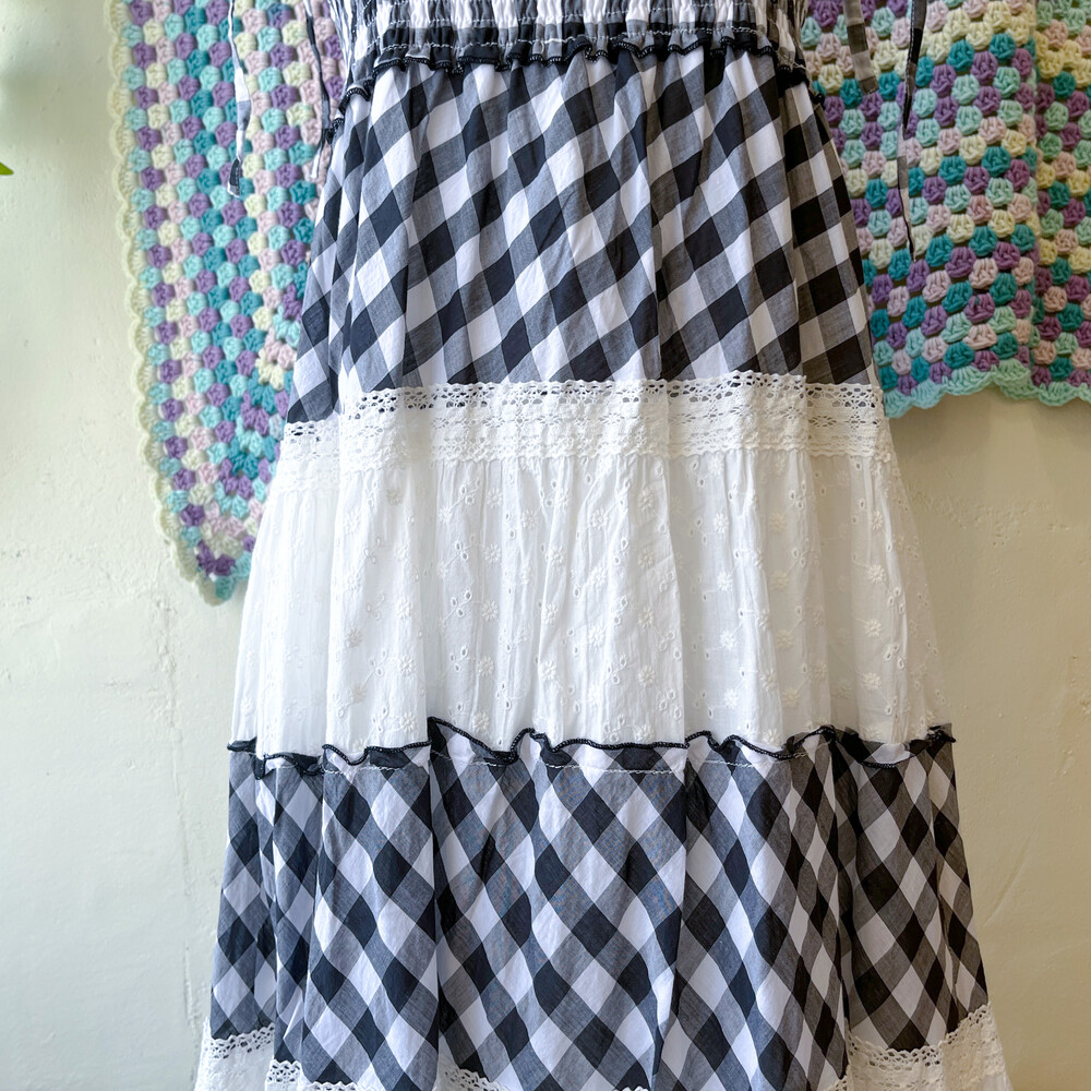 블랙 체크, 화이트 펀칭 코튼 패치 끈원피스예요