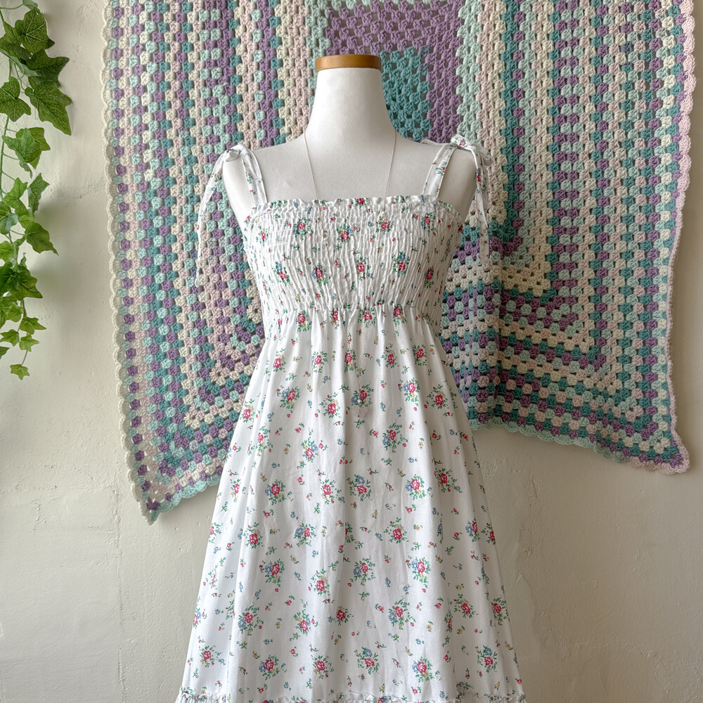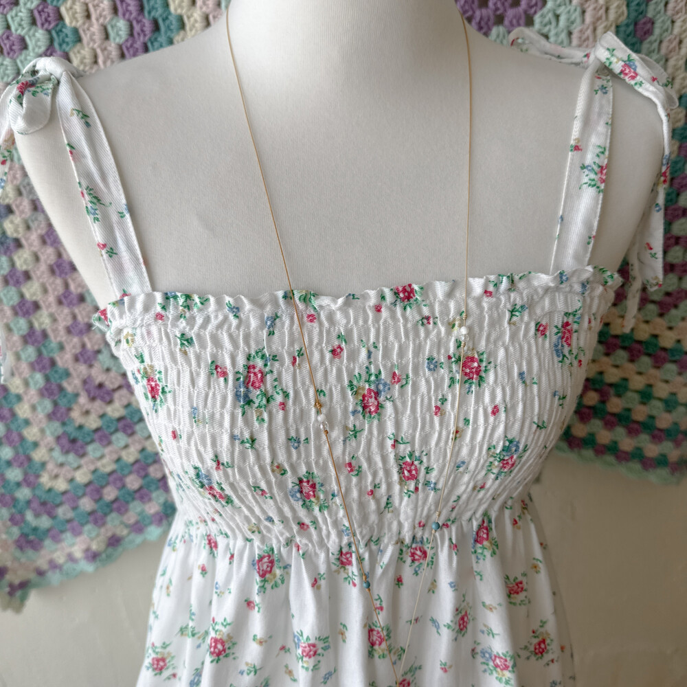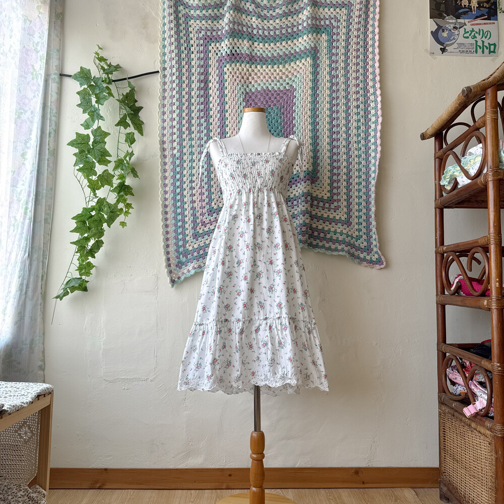 블루, 핑크 등 꽃무늬 패턴의 화이트 끈원피스예요