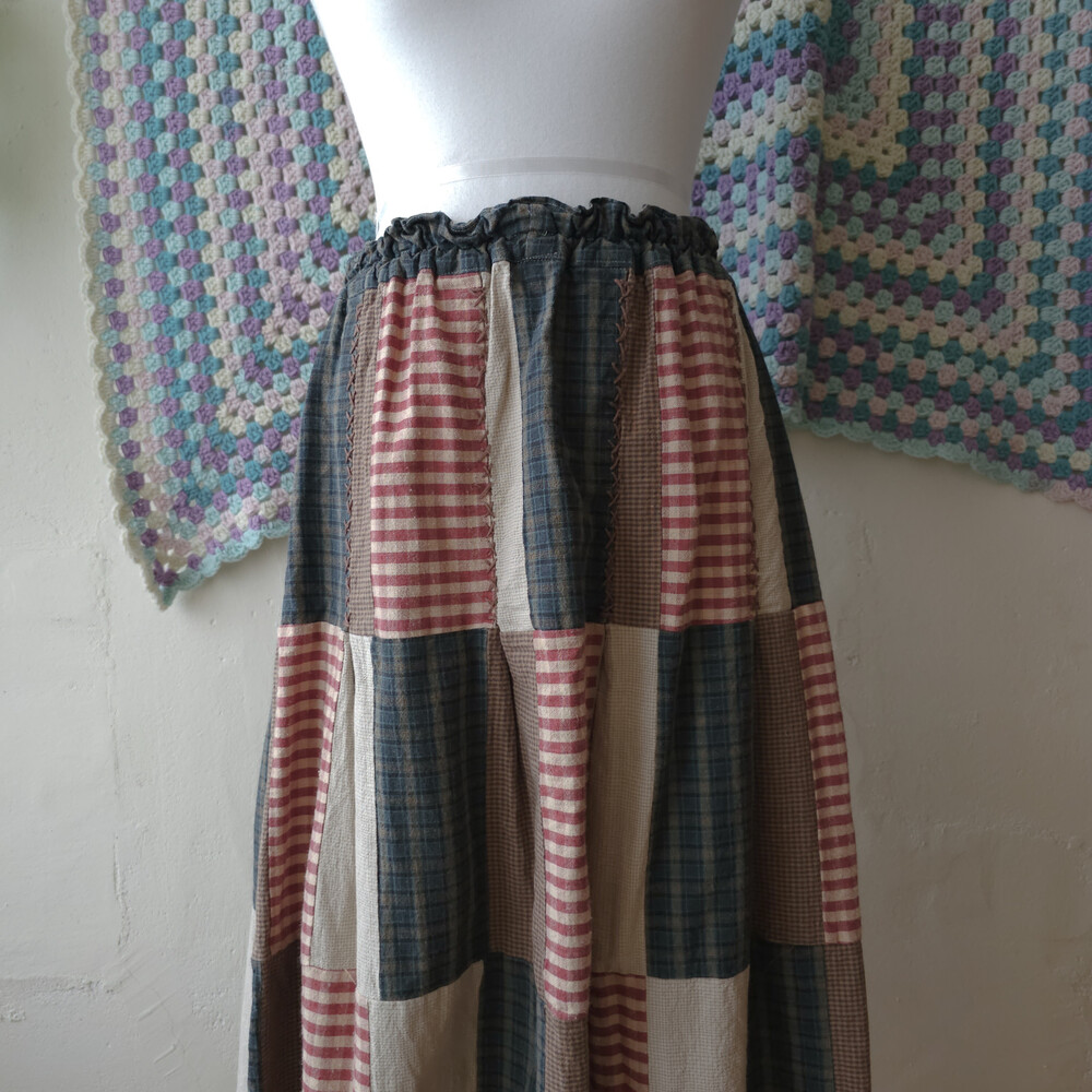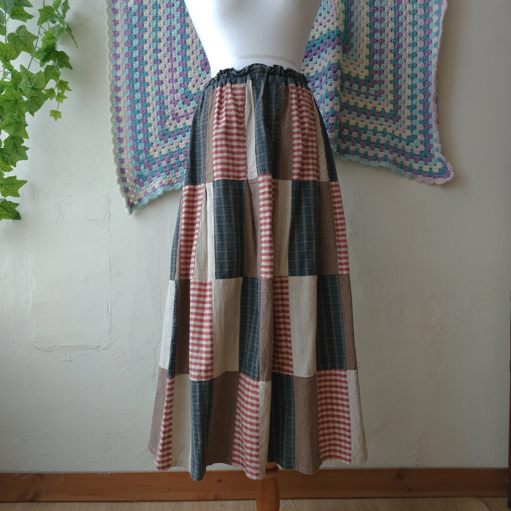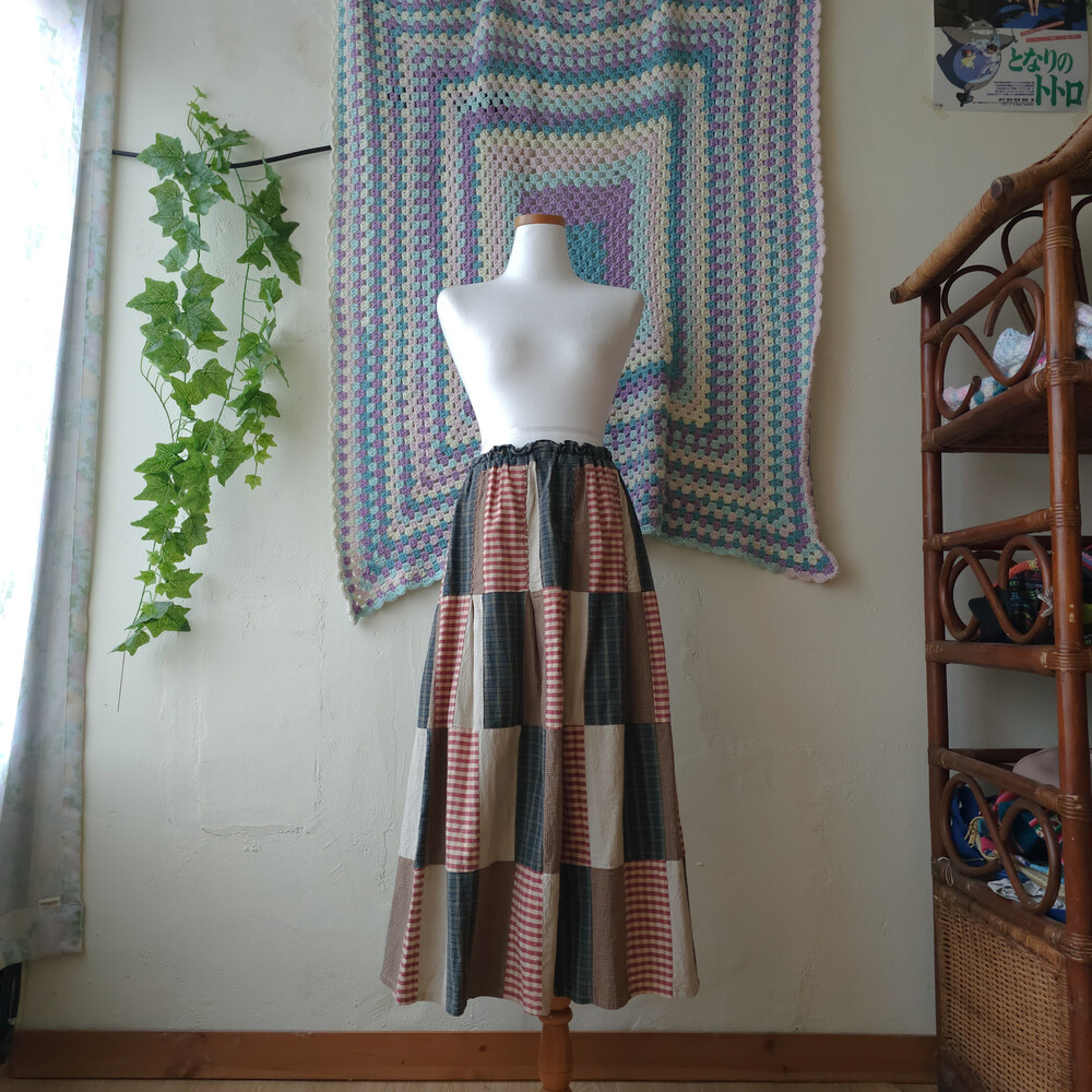 웜한 브라운, 그린 색감 계열의 체크 패치워크 스커트예요