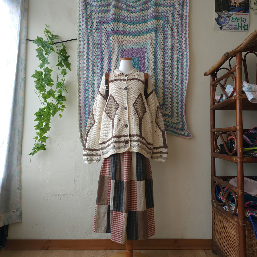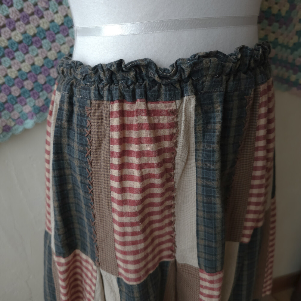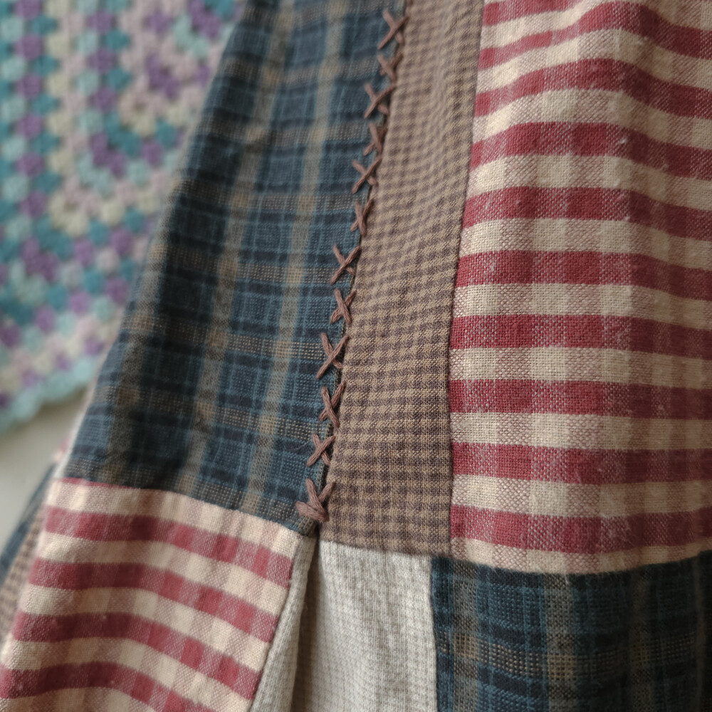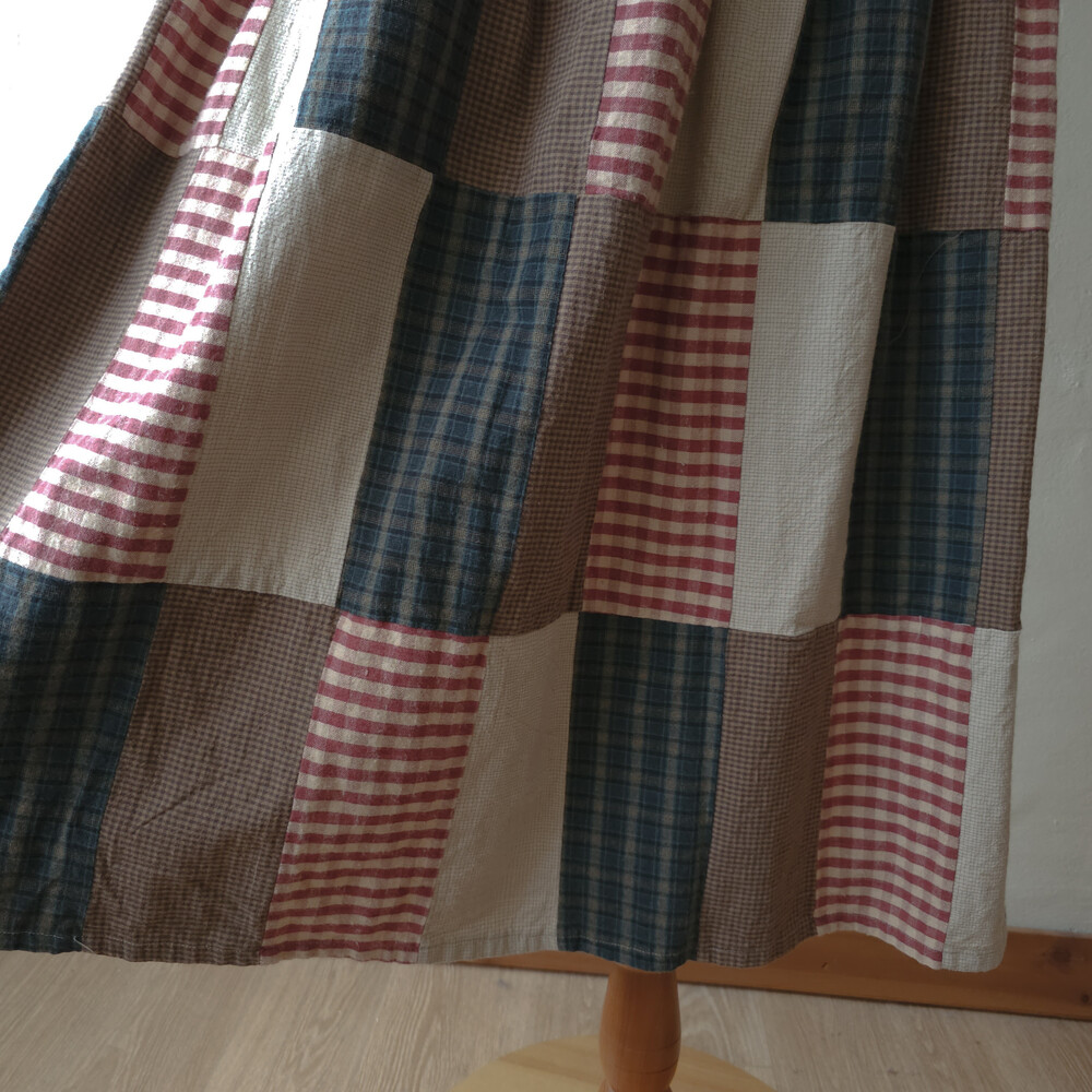 웜한 브라운, 그린 색감 계열의 체크 패치워크 스커트예요