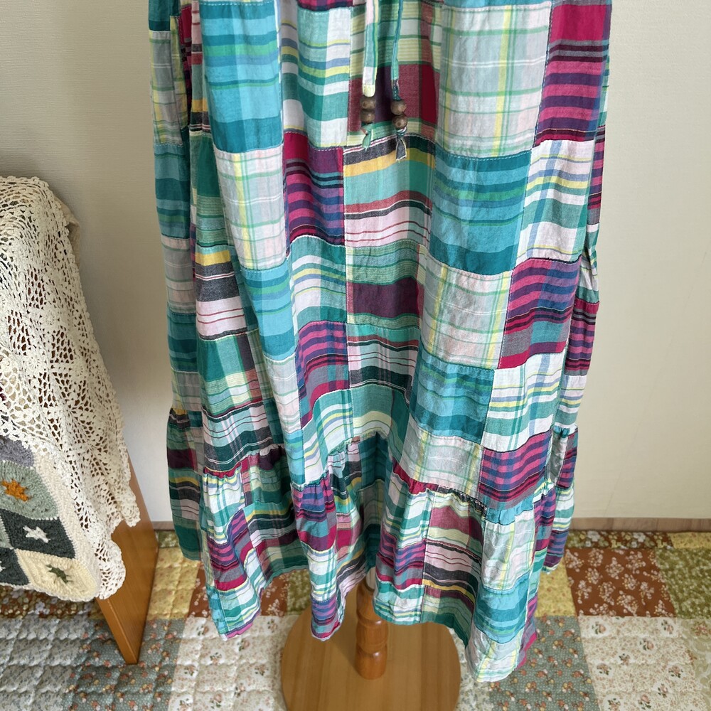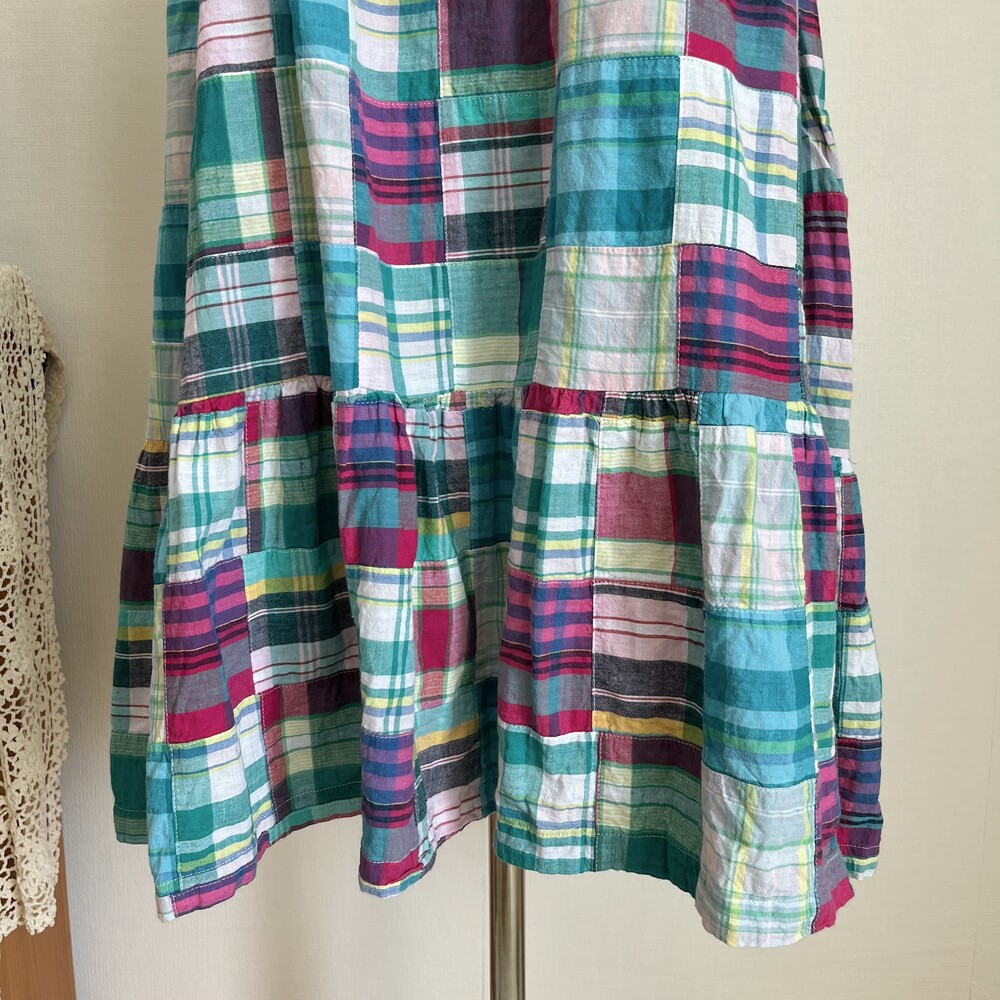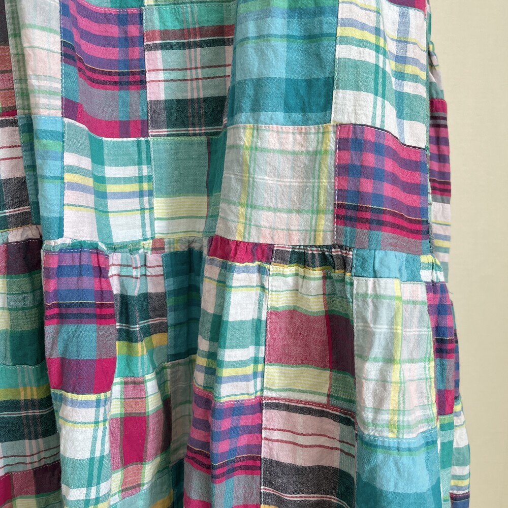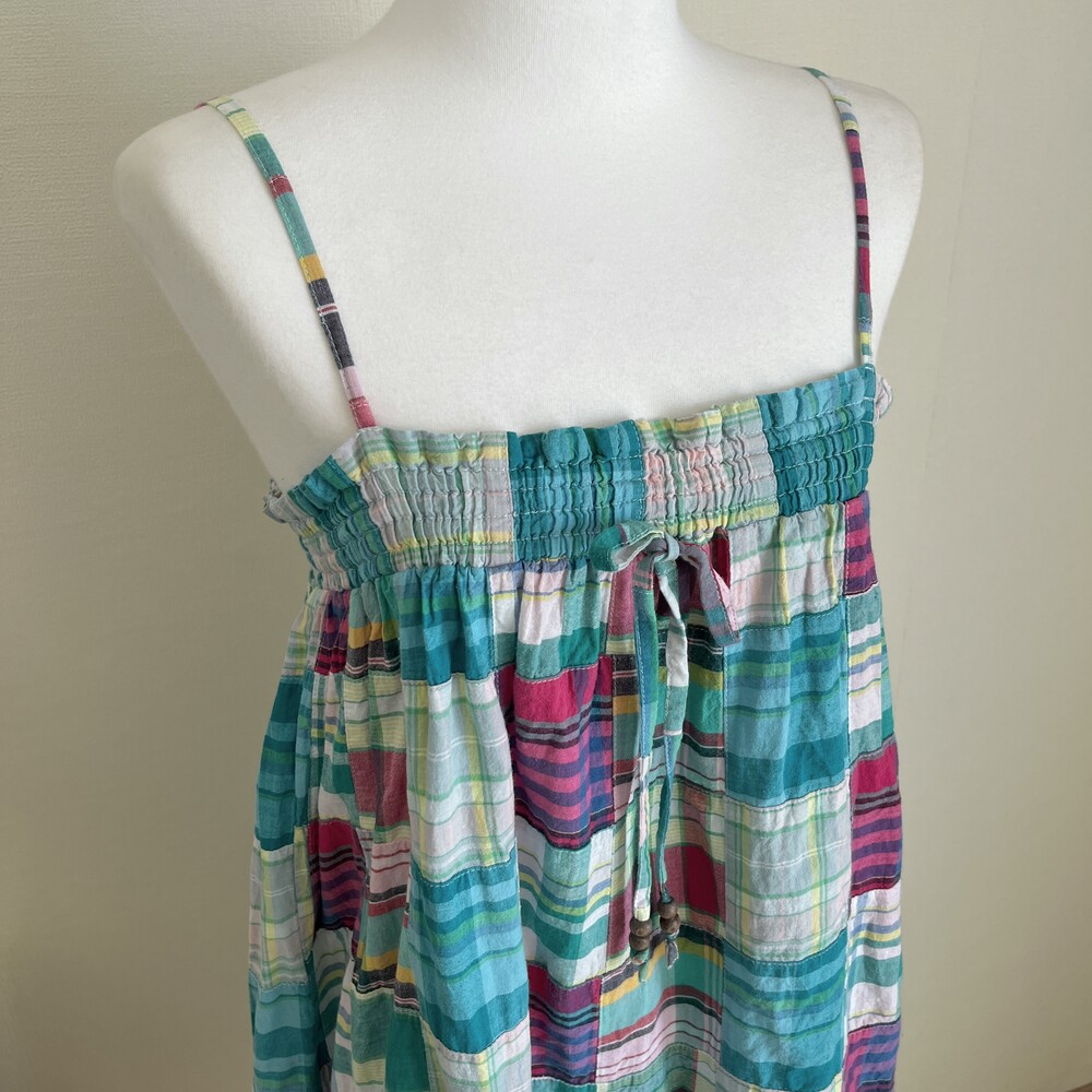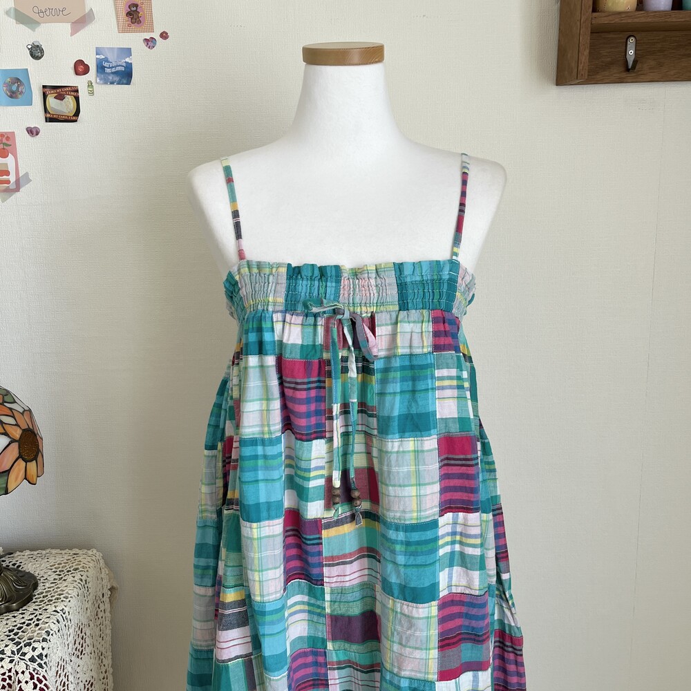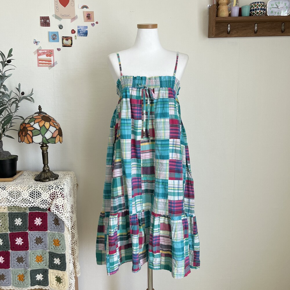 청록색과 분홍색 자주색 조합의 패치 끈원피스예요