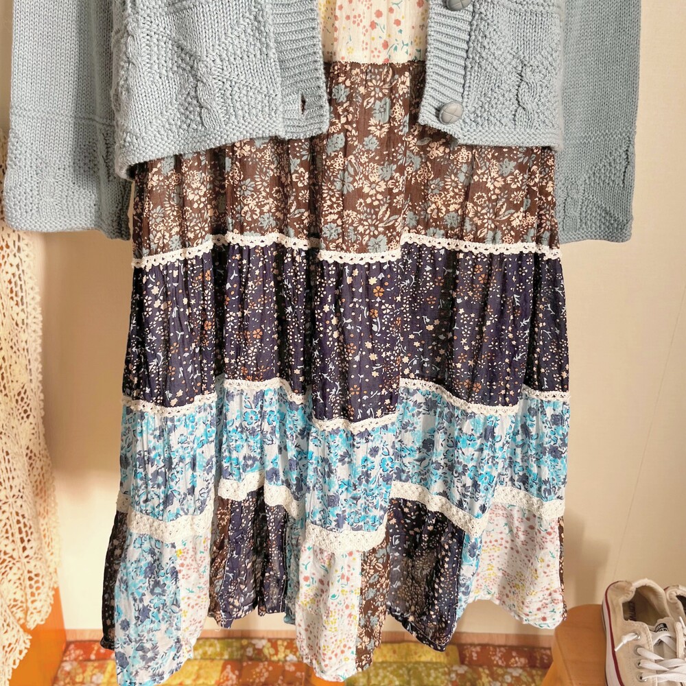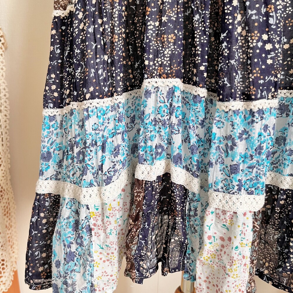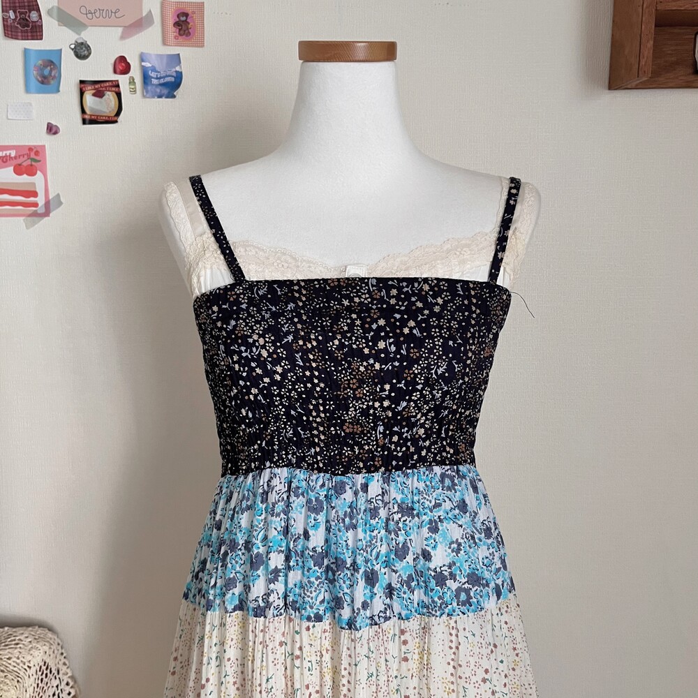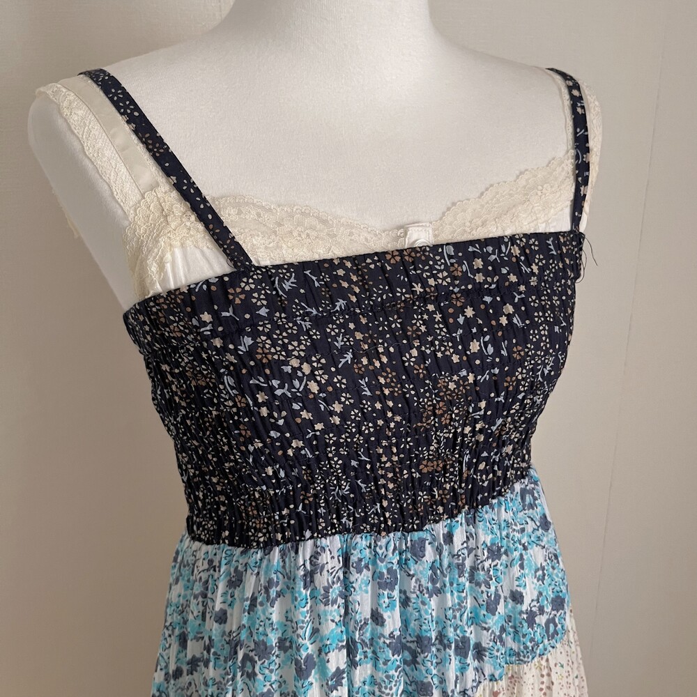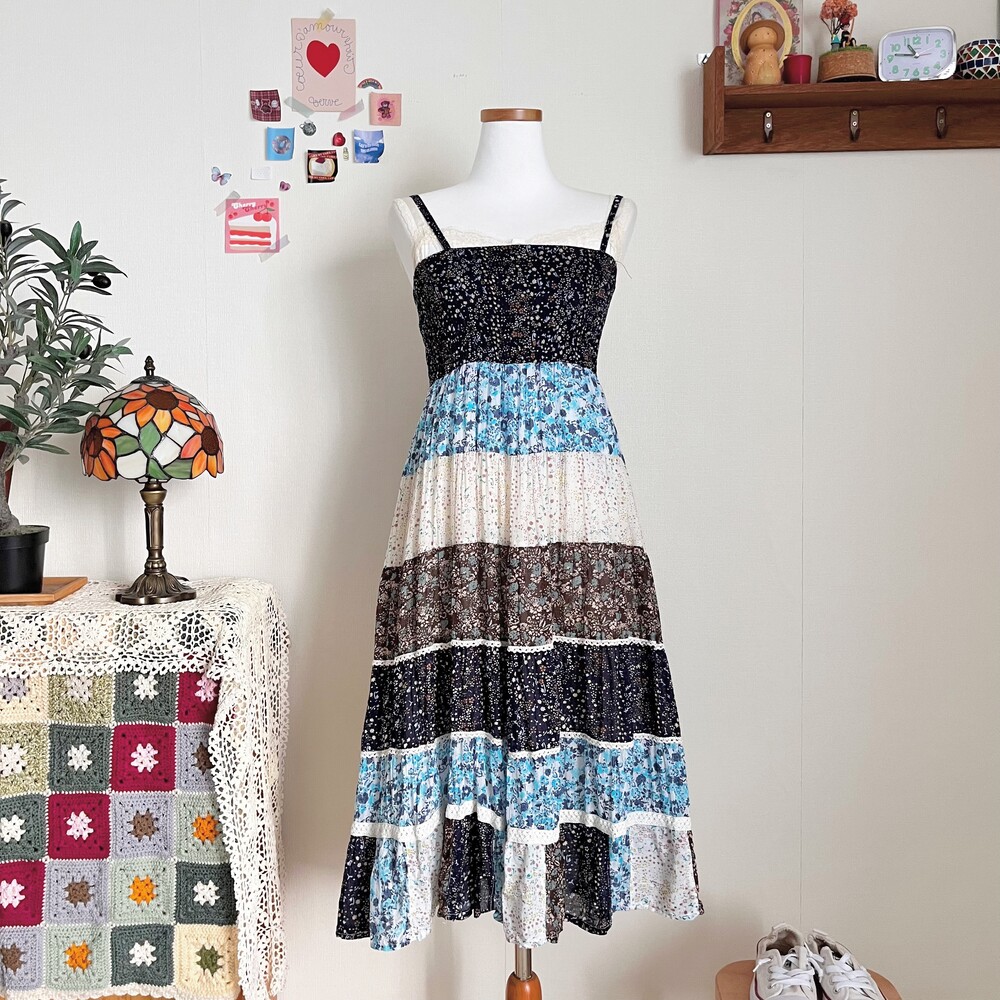 네이비, 블루 색감 베이스의 잔꽃 패치 끈원피스예요